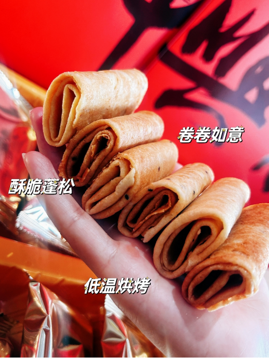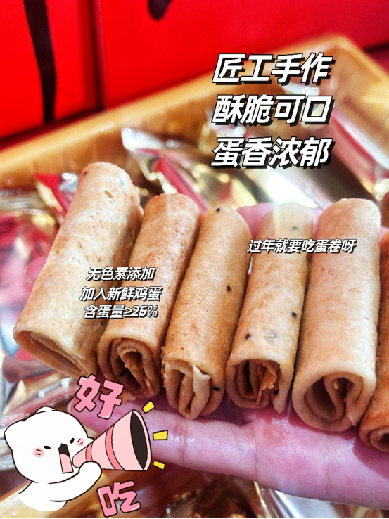 🍯有料,在民间过年是有吃蛋卷的习俗, 并且把蛋卷称之为如意卷,有吉祥如意都包在里面的寓意~ 叮咚熊龙凤蛋卷装了满满两大盒蛋香浓郁酥脆的手工蛋卷 一打开盒子,阵阵奶香扑鼻而来,让人食欲大开 浓浓蛋奶味,老远就能闻到了,馋哭隔壁的小孩 一口咬下去又香又脆,蛋卷在舌尖上逐渐化开,蛋奶的香气混着甜甜的味道 逐渐在口腔里面蔓延开来,手工蛋卷简直是童年不可取代的零食了 吃一口酥的直掉渣,恰到好处的甜,多吃几个也不会腻,老少皆宜~ 试过的人都对它赞不绝口,脆脆的口感,混合鸡蛋黑芝麻的香味,没人能抵御这多层次的味觉体验
