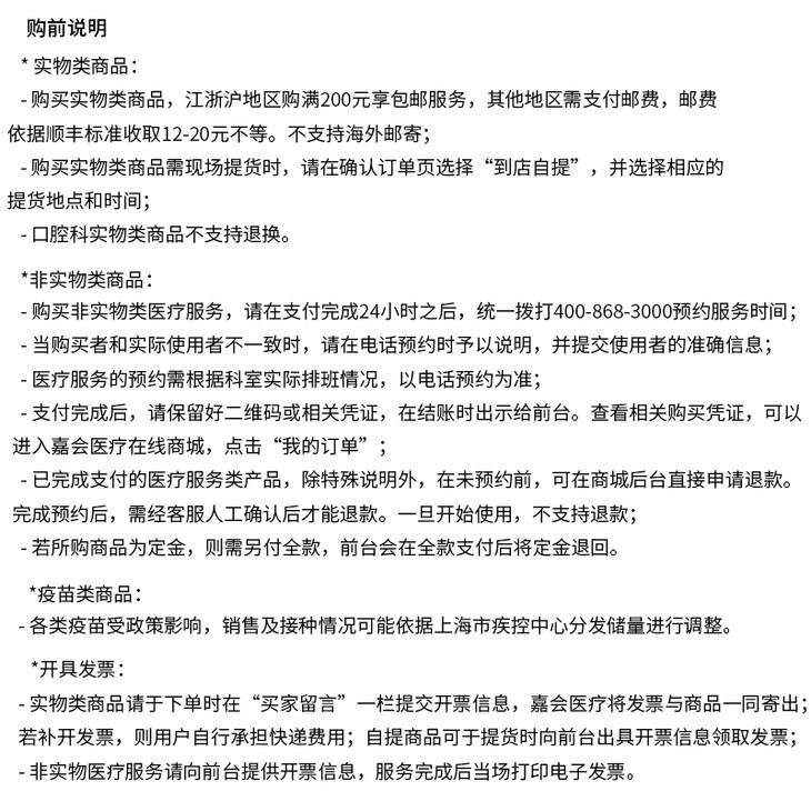 购买非实物类医疗服务,请在支付完成24小时之后,统一通过微信公众号“嘉会医疗JiahuiHealth”或拨打400-868-3000预约服务时间;