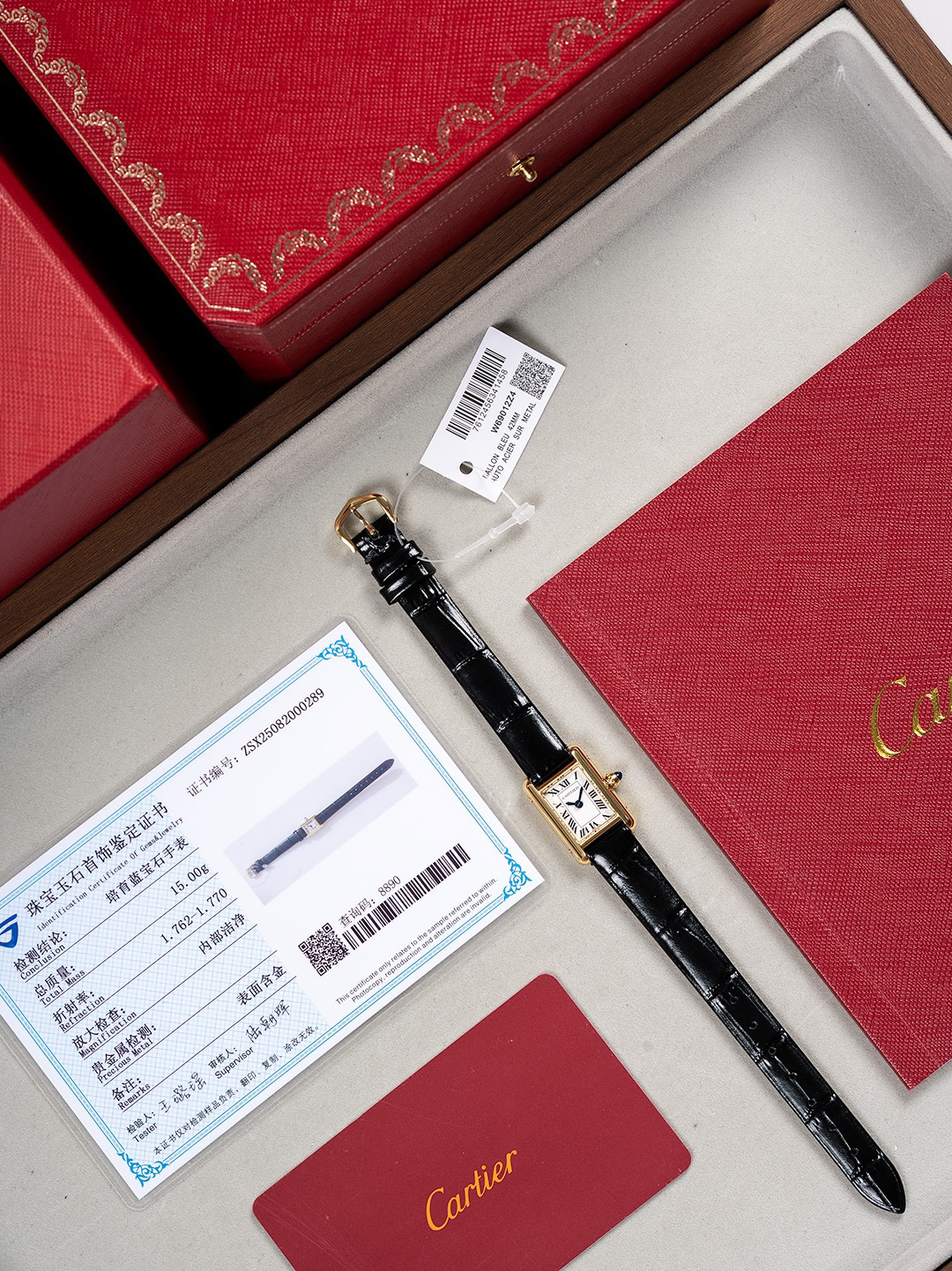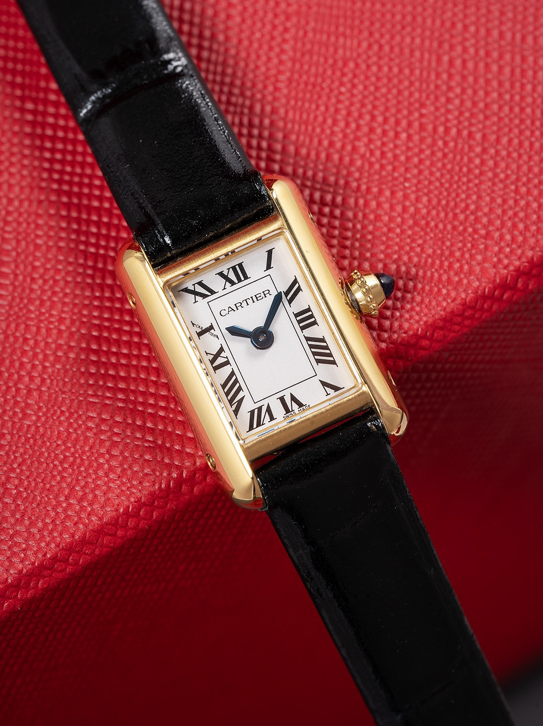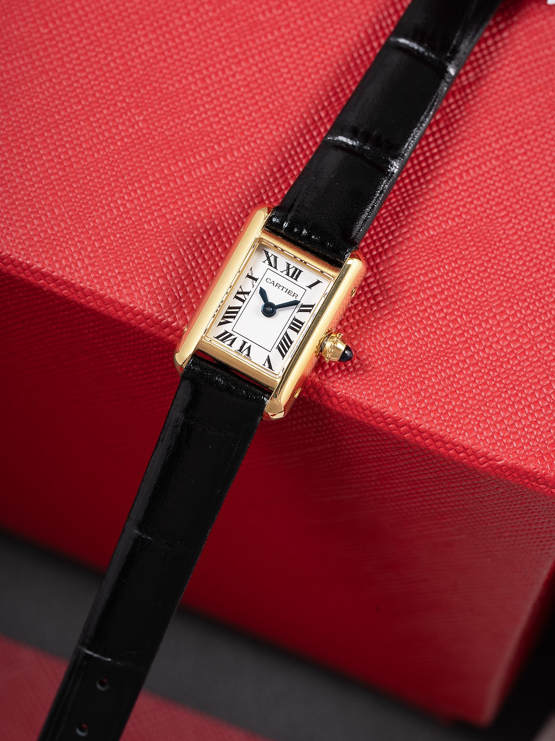 2025年卡地亚经典重塑,卡地亚将经典坦克腕表缩小尺寸,推出全新迷你坦克石英手表系列。纤细表壳,精致比例,完美贴合手腕,尽显女性优雅。金色表壳搭配蓝宝石水晶玻璃,复古磨砂奶油简约表盘,清晰易读,尽显卡地亚的极简工艺。