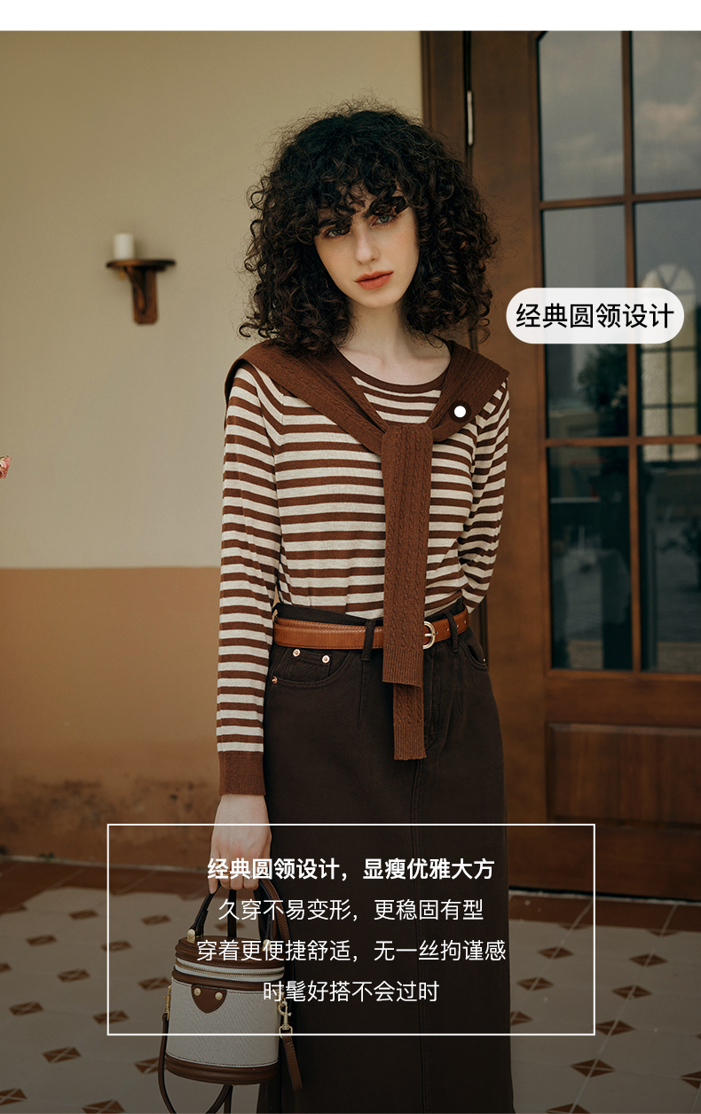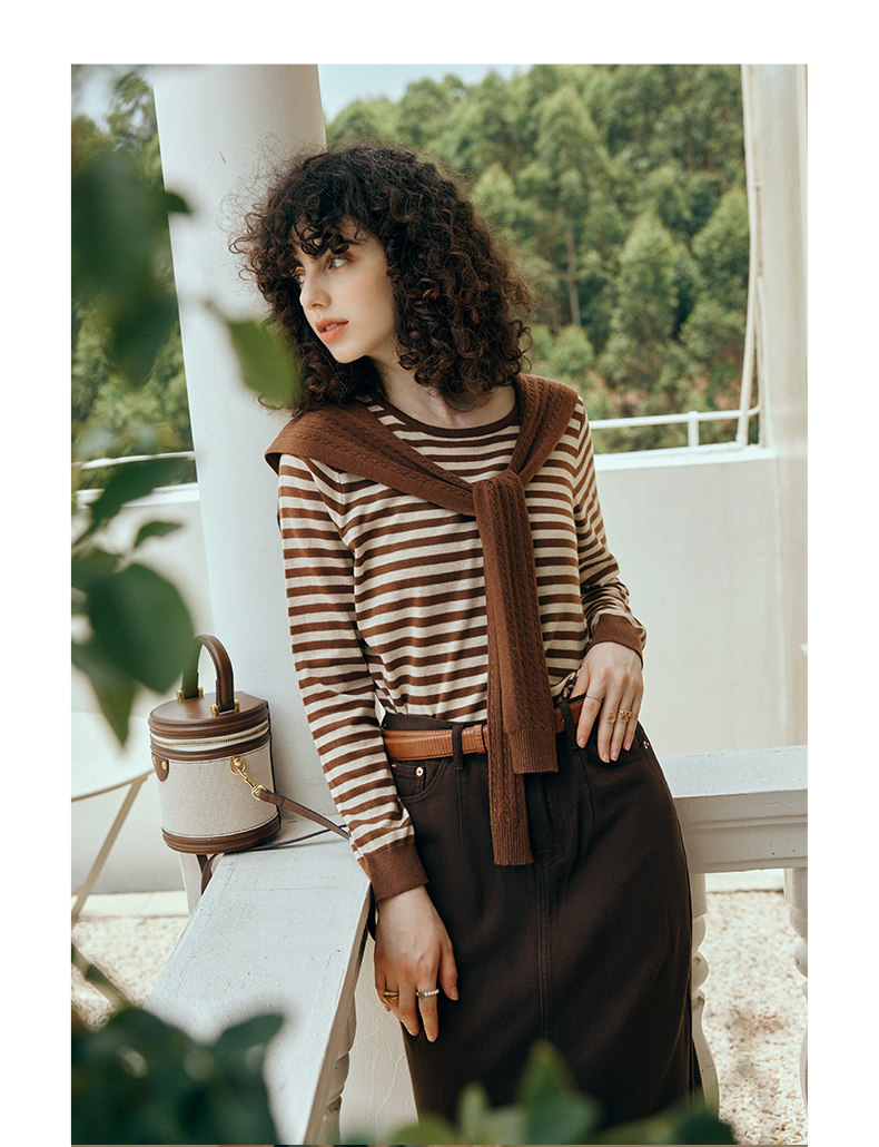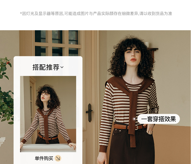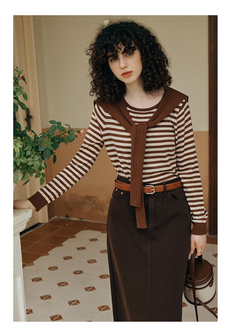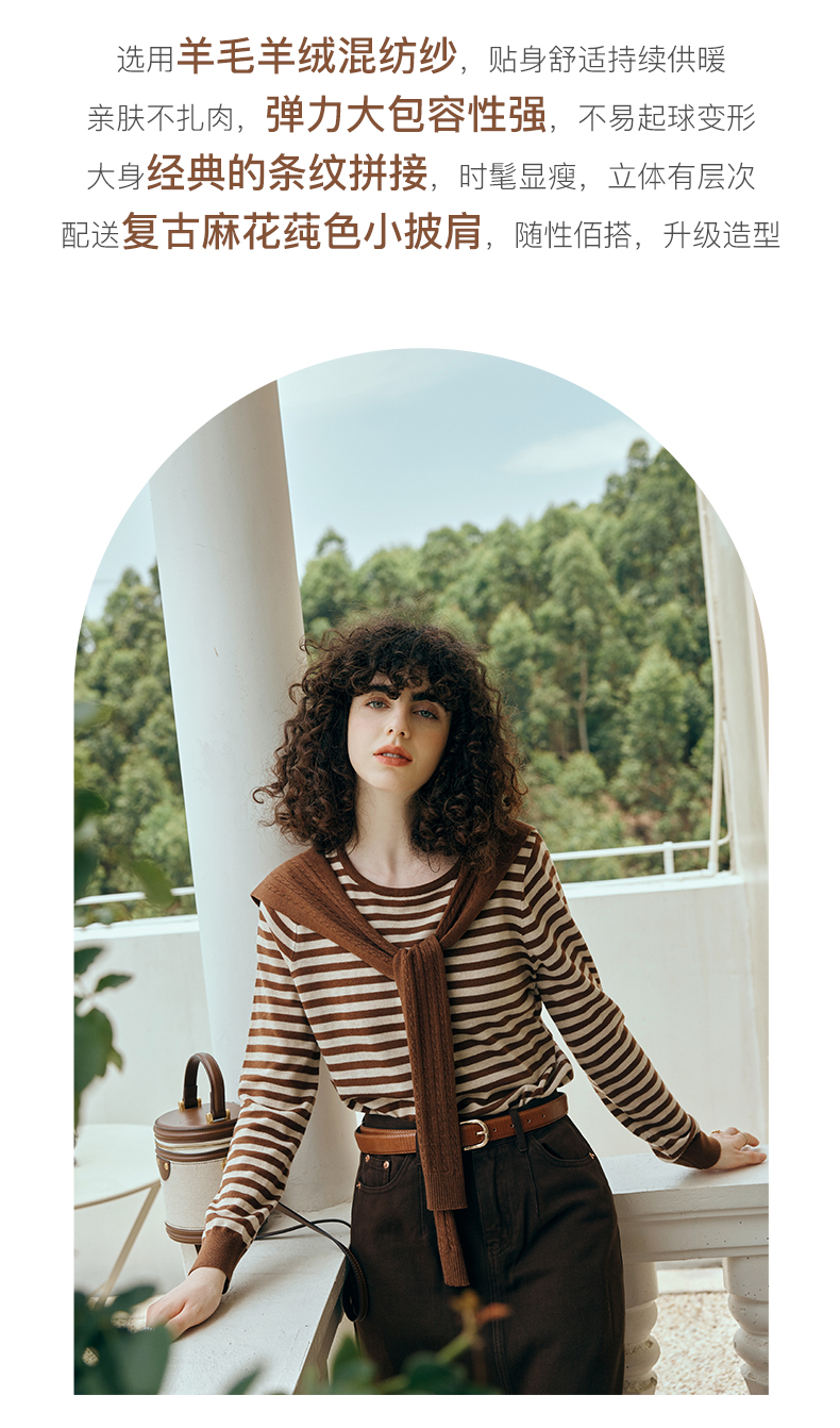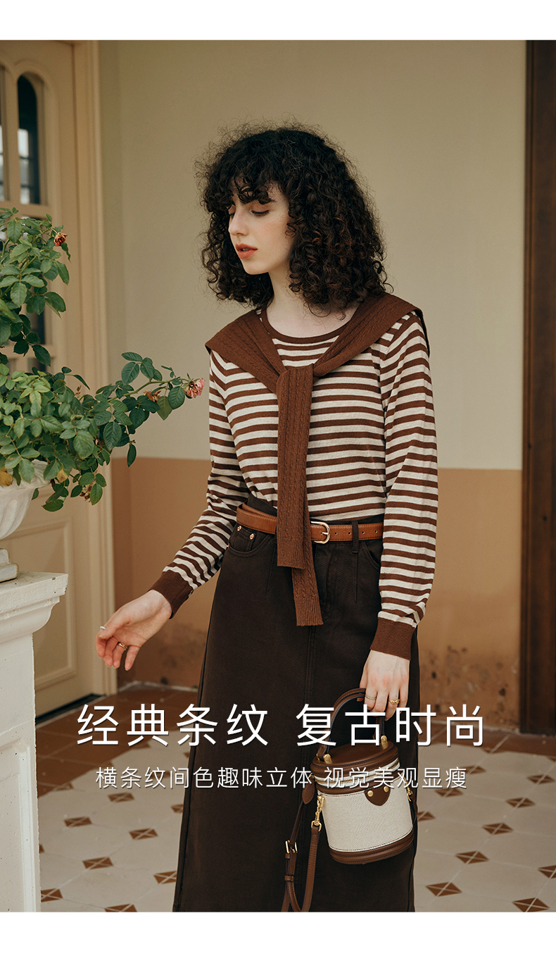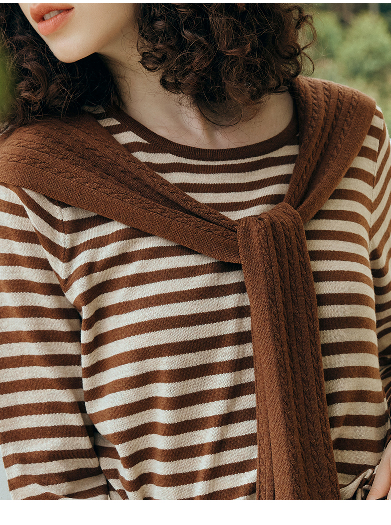 OLrain欧芮儿咖色条纹毛衣女初秋2023年新款麻花披肩两件套针织衫