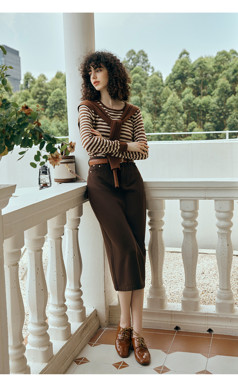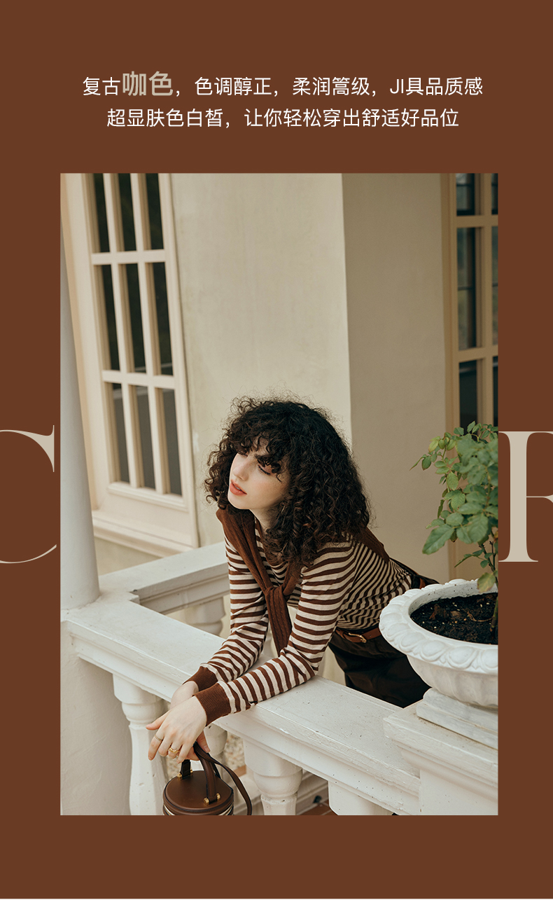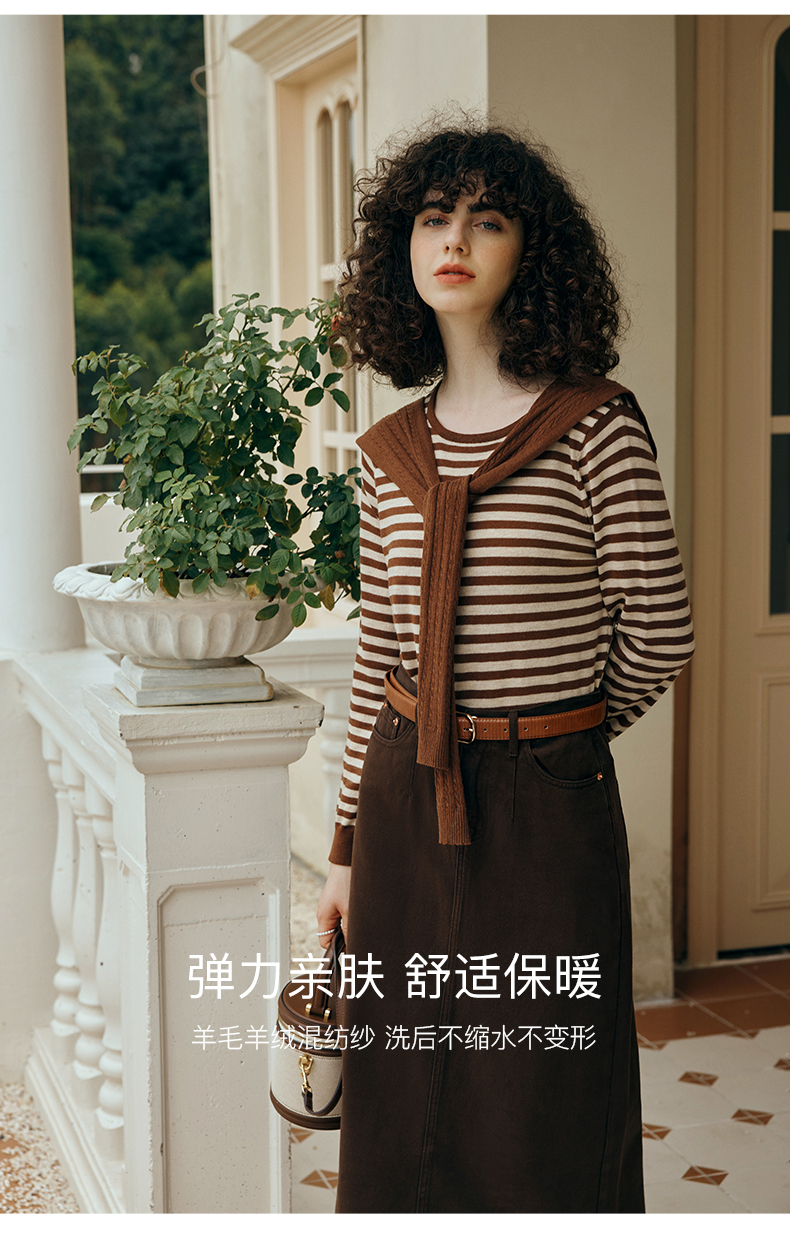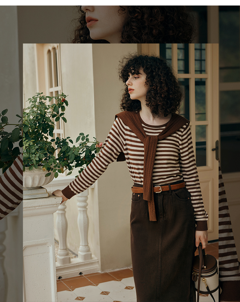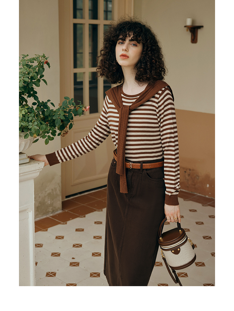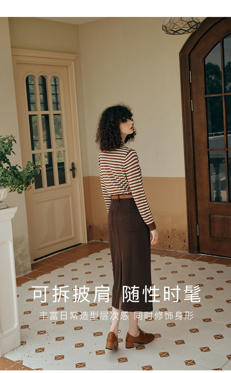 OLrain欧芮儿咖色条纹毛衣女初秋2023年新款麻花披肩两件套针织衫
