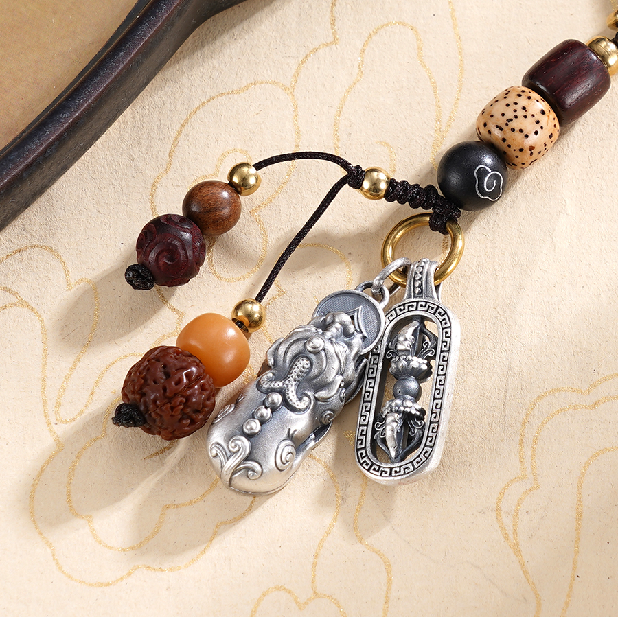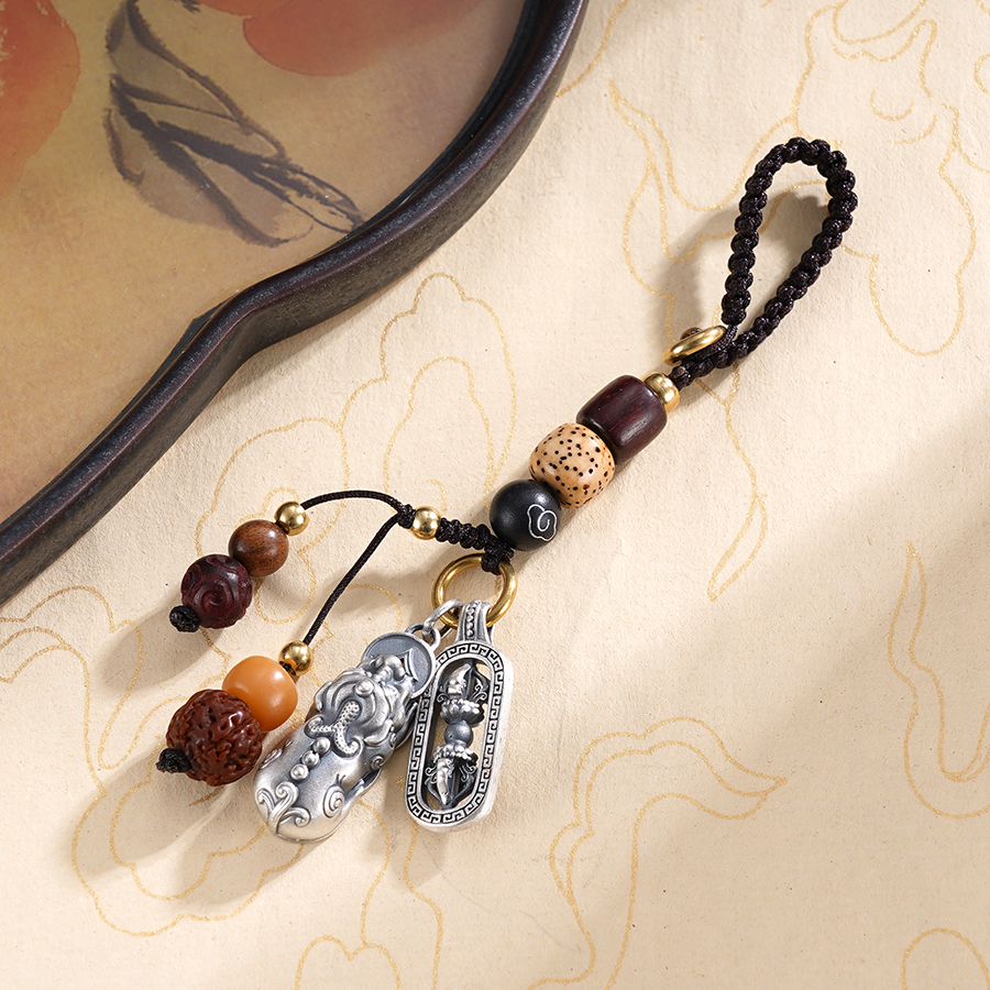 【寓意】:貔貅与金刚杵融合,构成了这款钥匙扣的精髓。足银材质精铸,构筑随身福运结界。寓意启运纳福、辟祟守财。