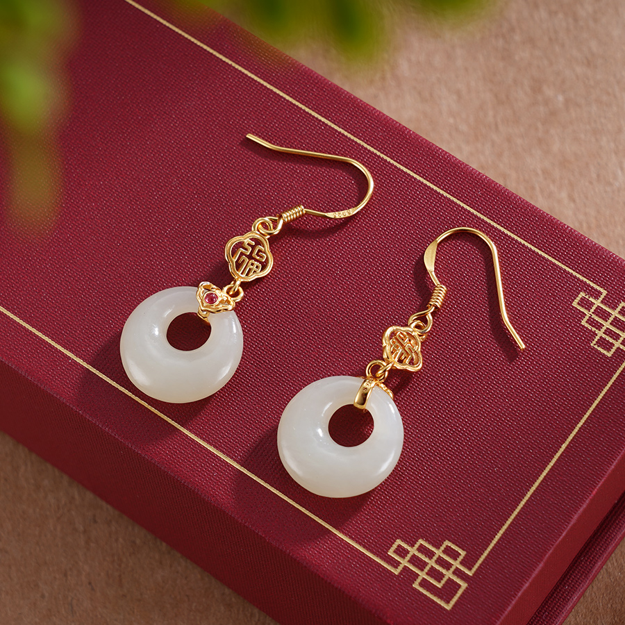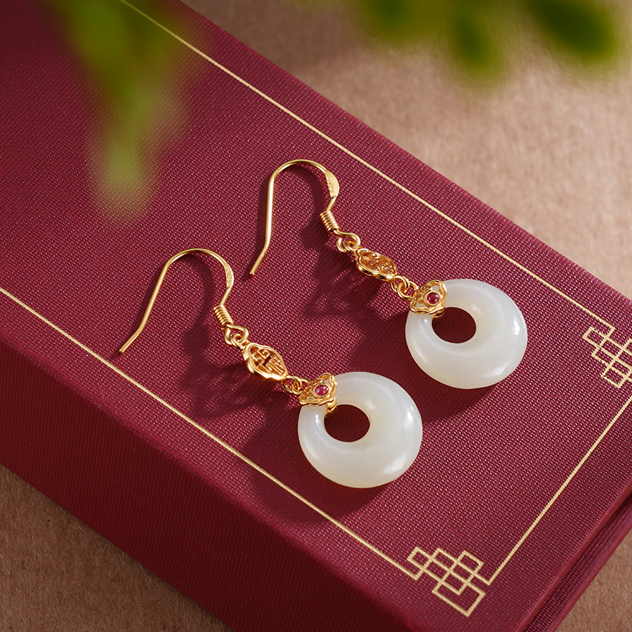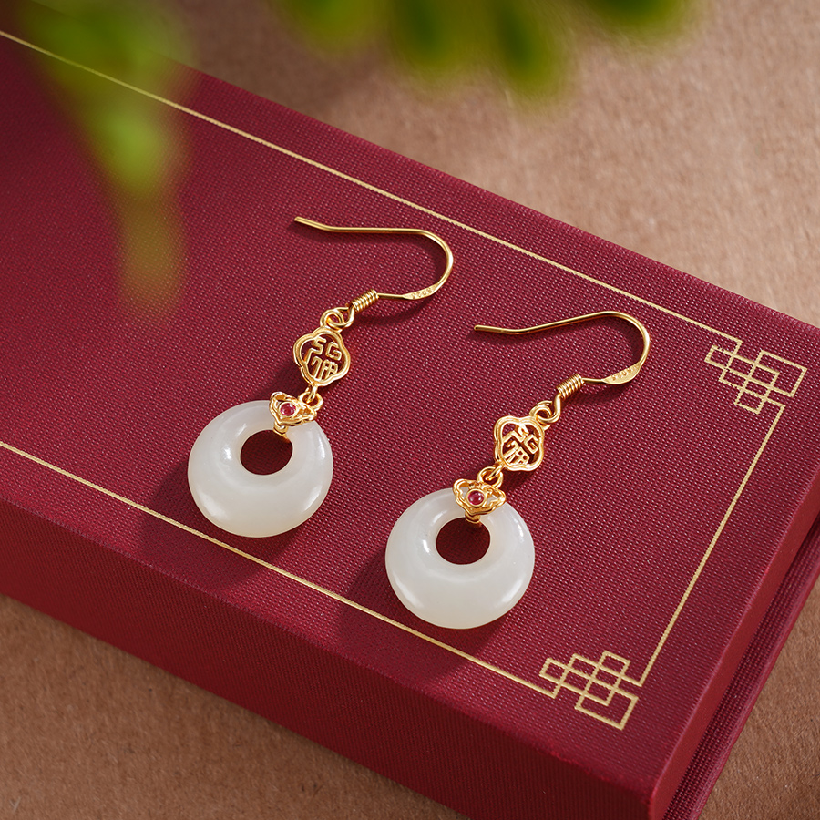 【寓意】:镂空编织福字耳环,表面采用镀金工艺处理,下方点缀和田玉圆环,寓意福禄相伴,一路荣华。