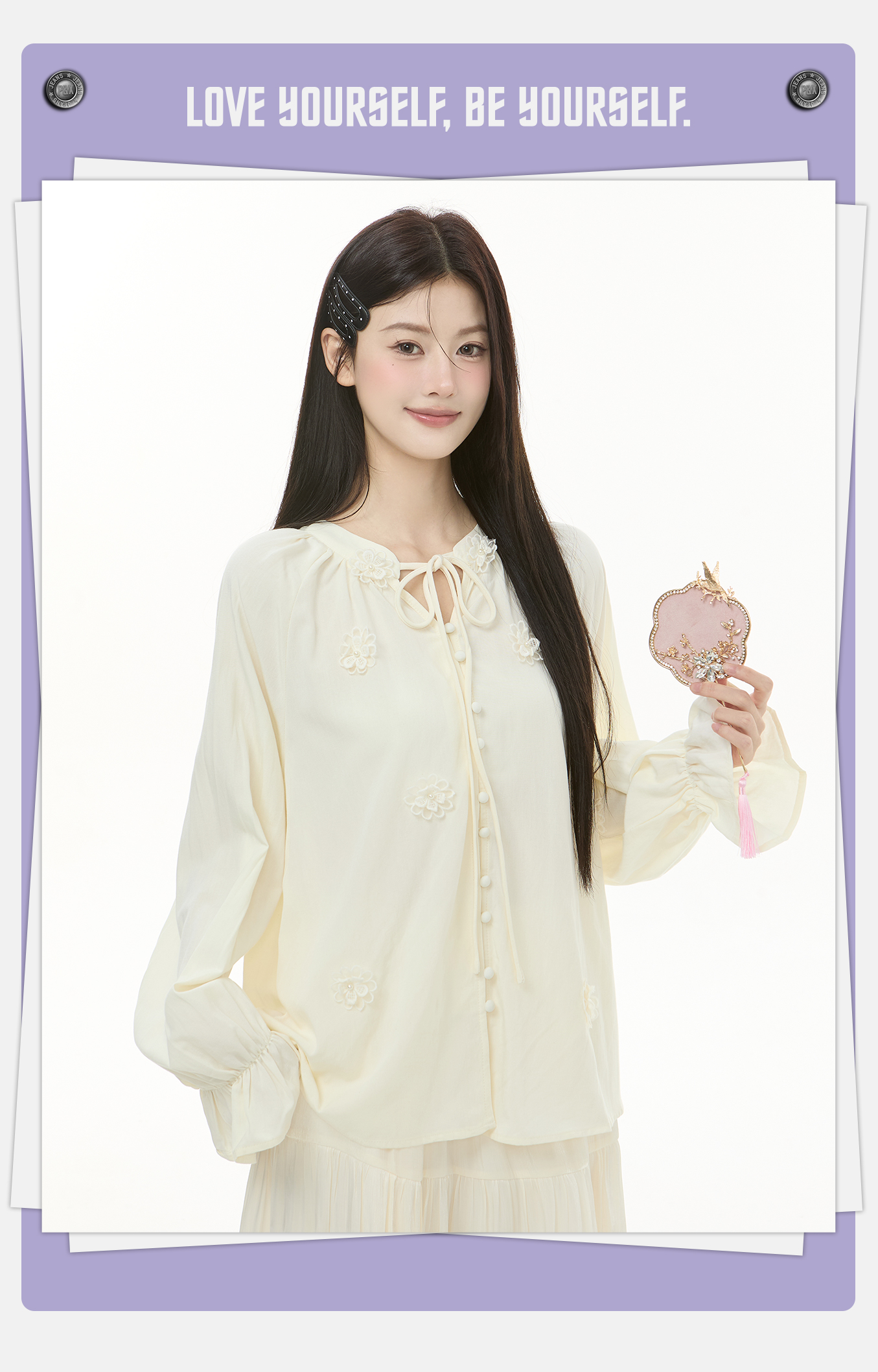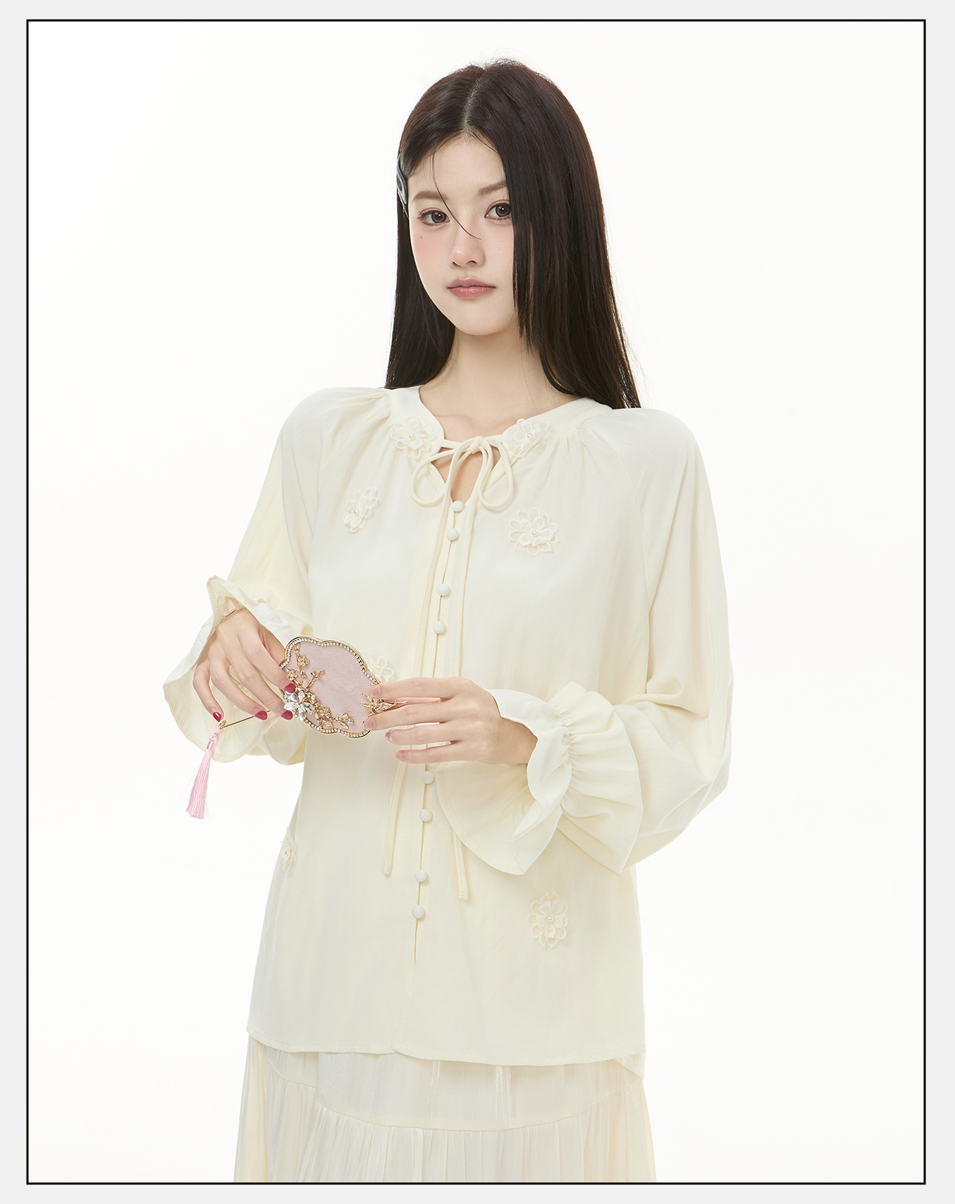 P&X设计师女装2025秋季法式绣花奶油衬衫插肩袖 825305267 杏色