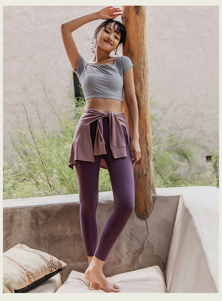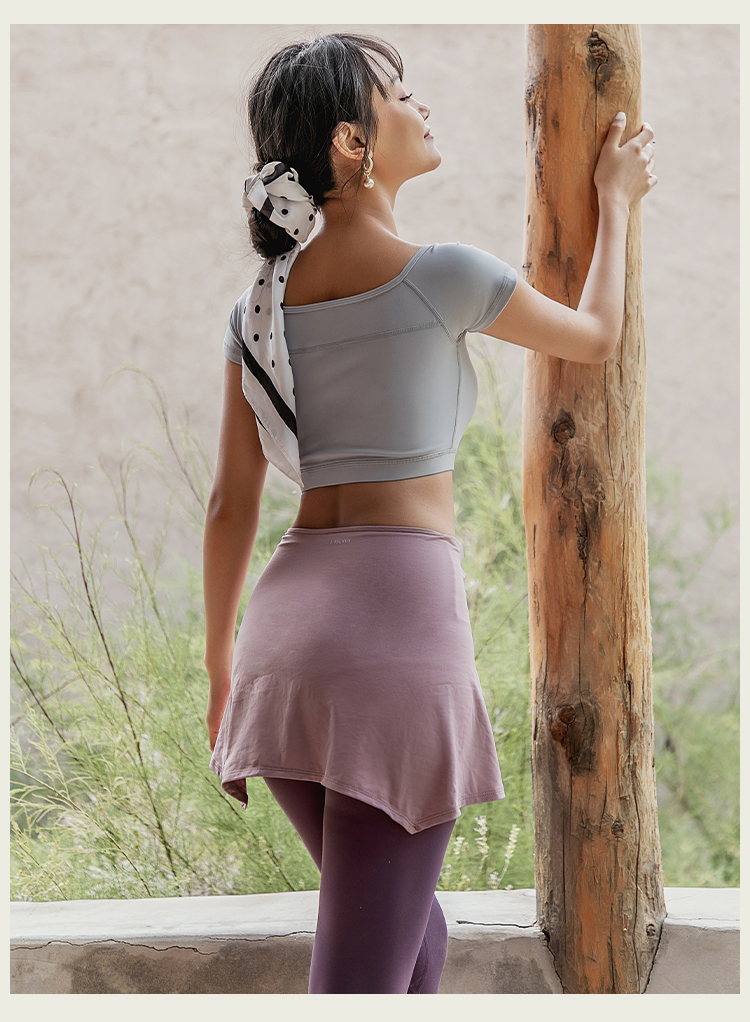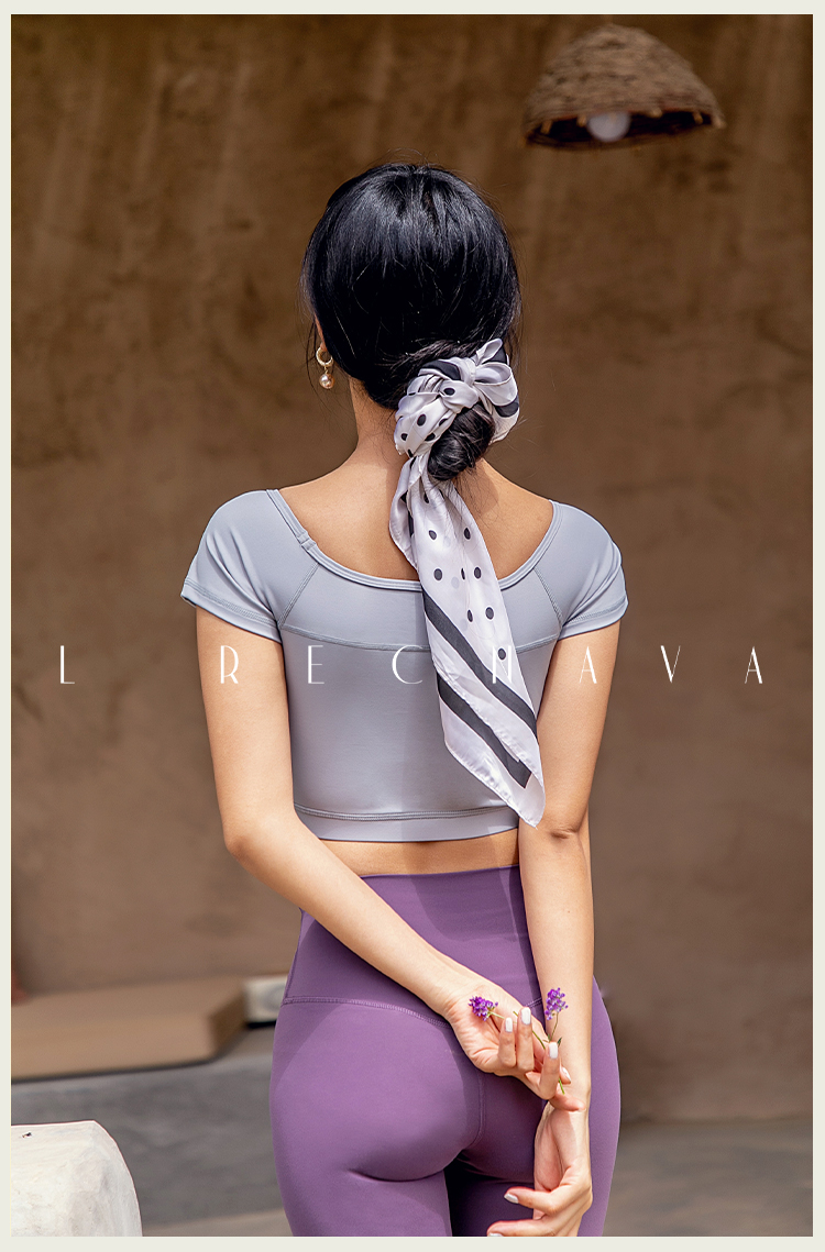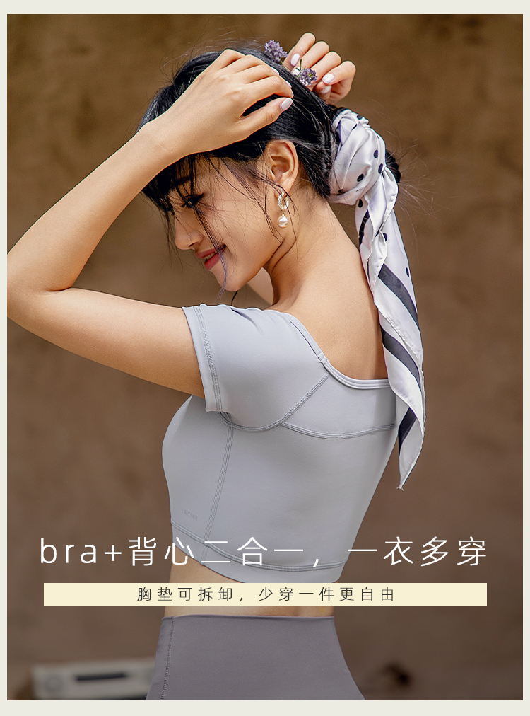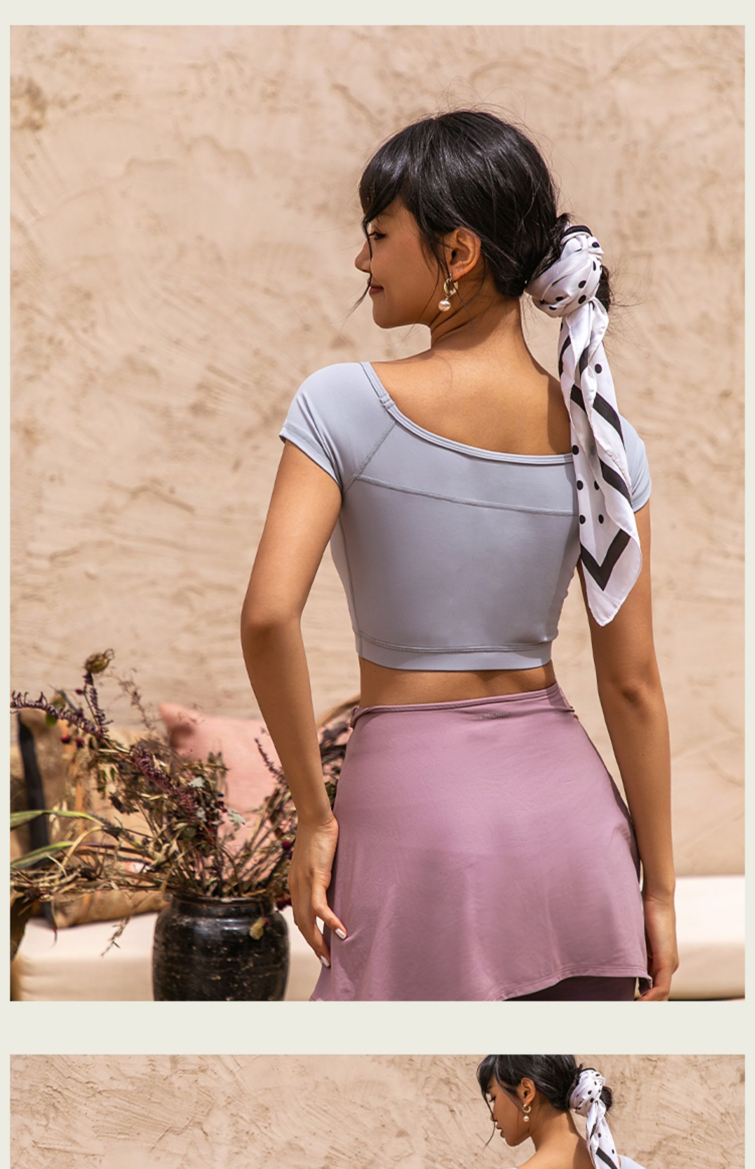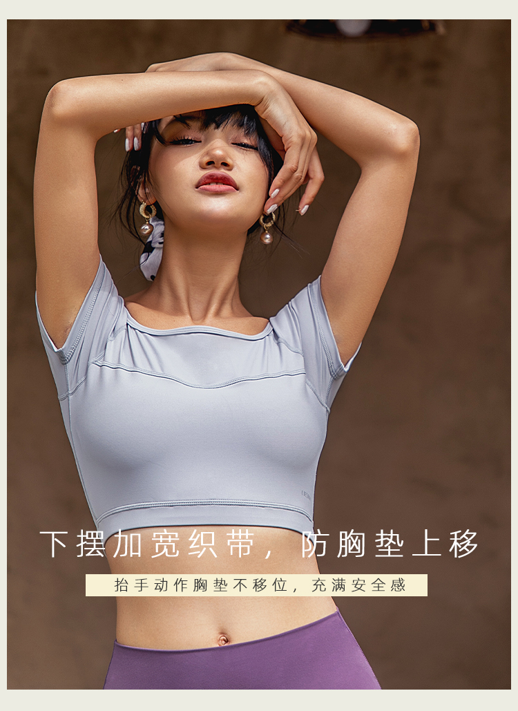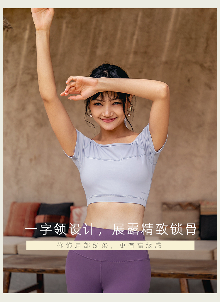 【裸感】一字领小高腰短袖运动带胸垫T恤紧身显瘦瑜伽服上衣