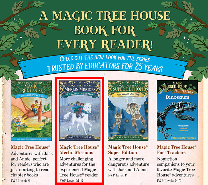 本套书来自必读经典章节书Magic Tree House《神奇树屋》的第二季:Magic Tree House - Merlin Missions《神奇树屋 - 梅林的任务》。从语言难度和故事情节复杂程度来看,第一季属于初级章节书,第二季属于中级章节书。