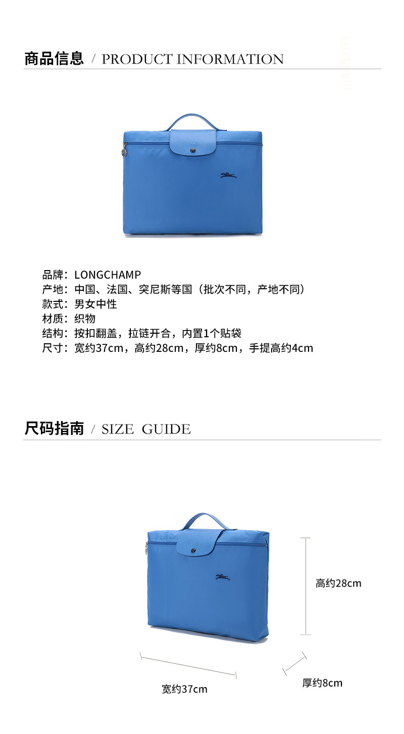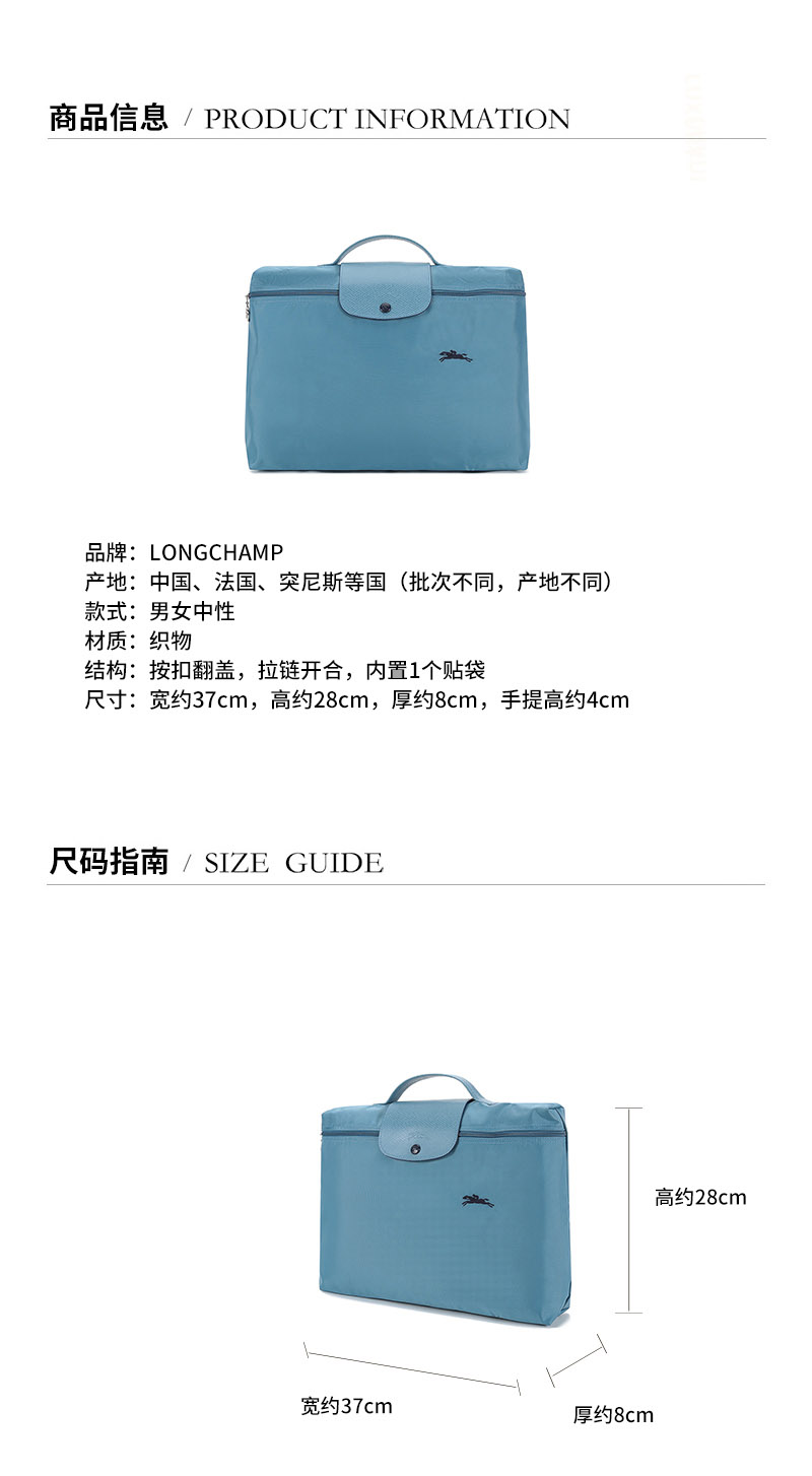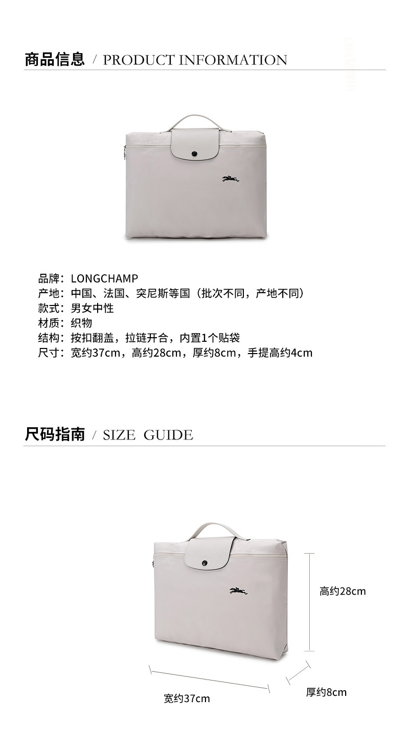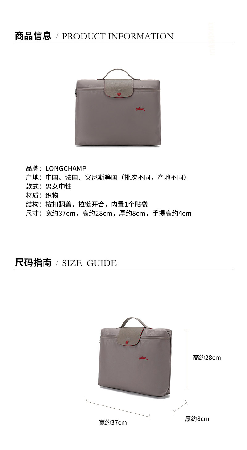 ![]() | 品牌:Longchamp/珑骧 产地:中国、法国、突尼斯等国(批次不同,产地不同) 款式:男女中性 颜色:金属灰 材质:织物 结构:按扣翻盖拉链开合,内置1个贴袋 尺寸:宽约37cm,高约28cm,厚约8cm,手提高约4cm 备注:批次不同,货品略有差异,以实物为准