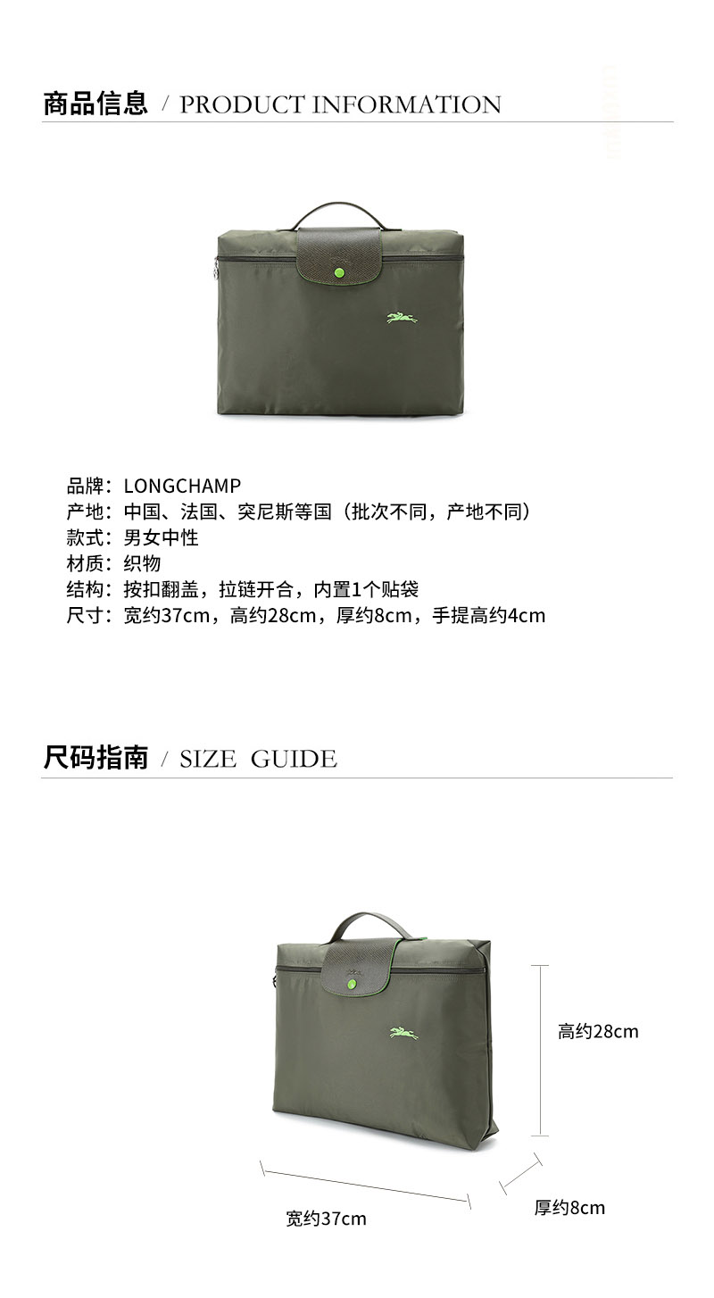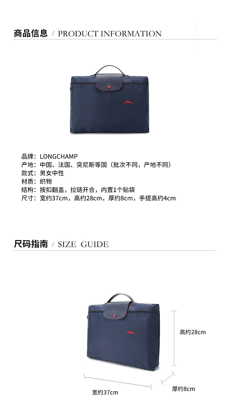 ![]() | 品牌:Longchamp/珑骧 产地:中国、法国、突尼斯等国(批次不同,产地不同) 款式:男女中性 颜色:黑色 材质:织物 结构:按扣翻盖拉链开合,内置1个贴袋 尺寸:宽约37cm,高约28cm,厚约8cm,手提高约4cm 备注:批次不同,货品略有差异,以实物为准