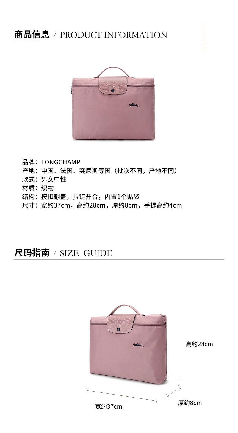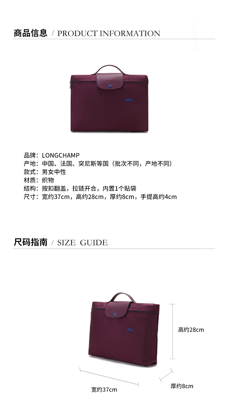 ![]() | 品牌:Longchamp/珑骧 产地:中国、法国、突尼斯等国(批次不同,产地不同) 款式:男女中性 颜色:石榴红色 材质:织物 结构:按扣翻盖拉链开合,内置1个贴袋 尺寸:宽约37cm,高约28cm,厚约8cm,手提高约4cm 备注:批次不同,货品略有差异,以实物为准