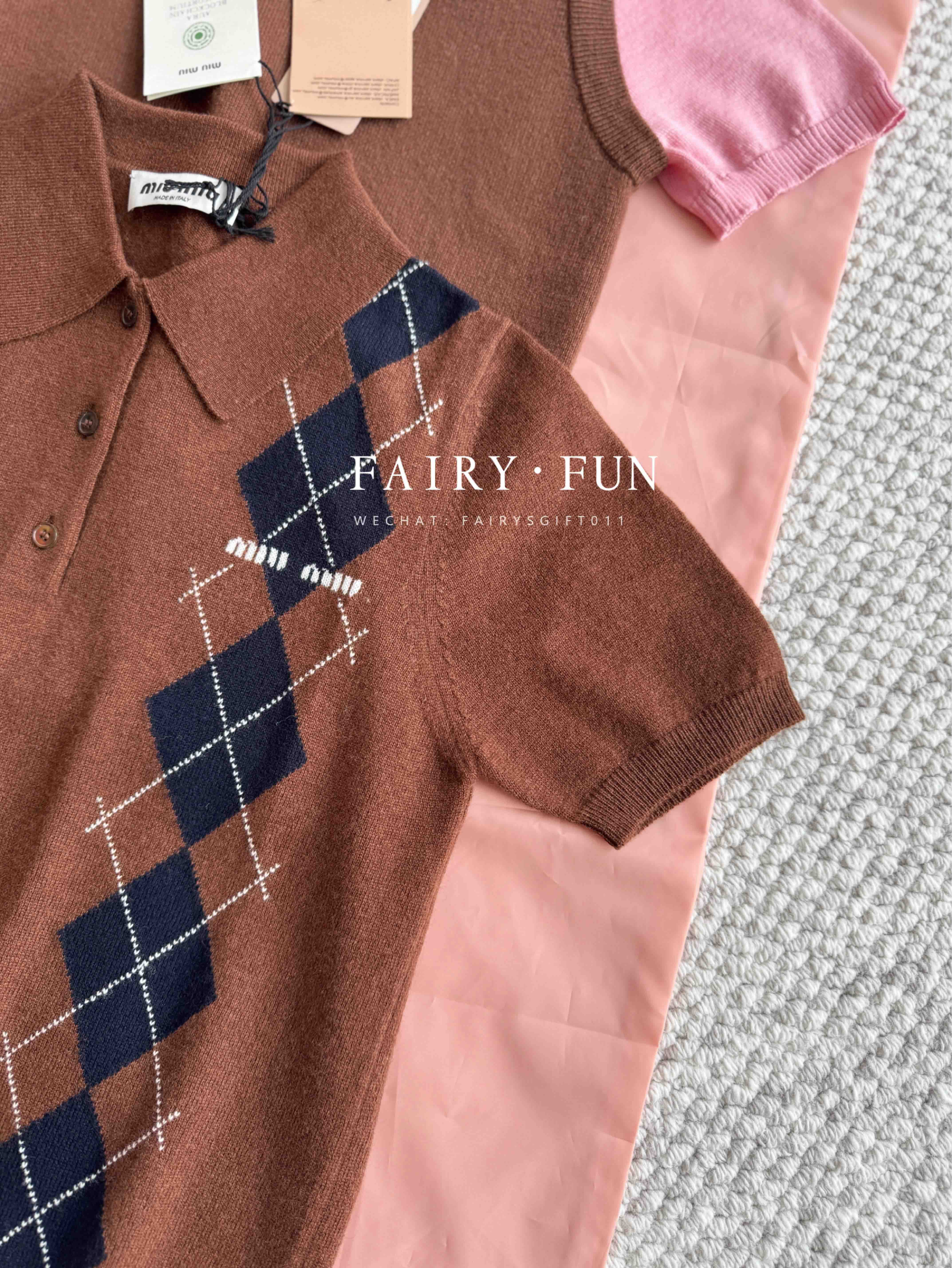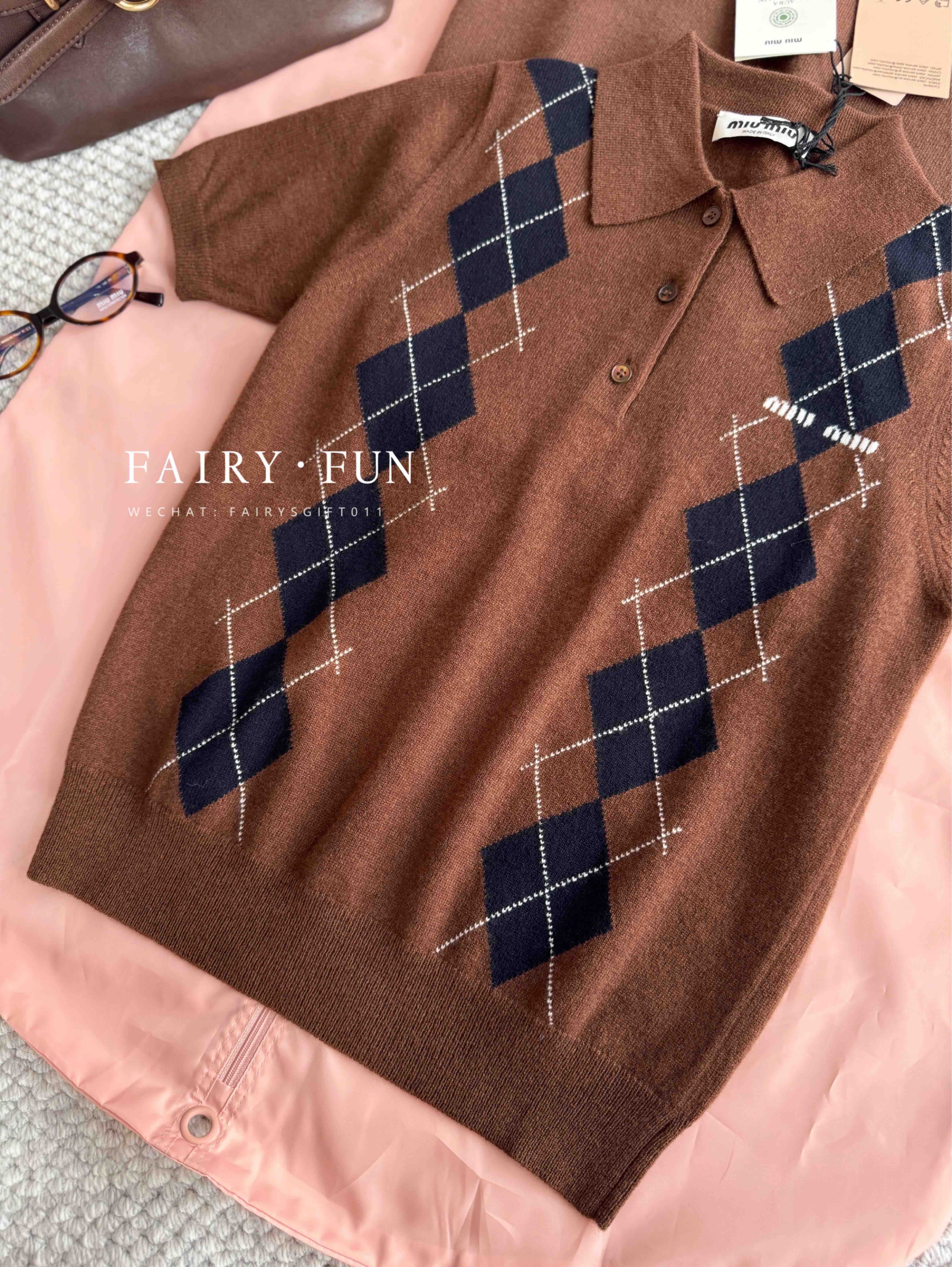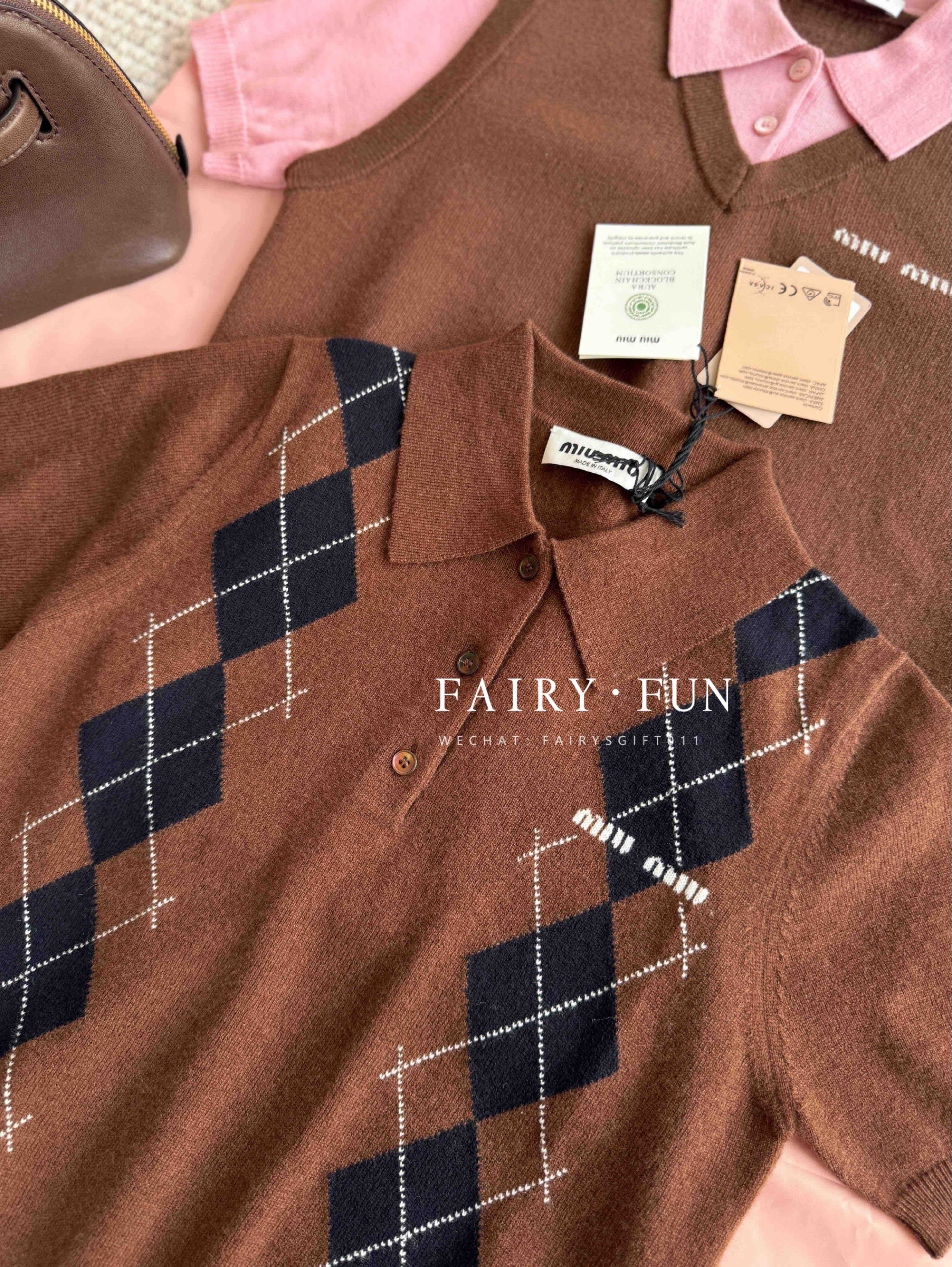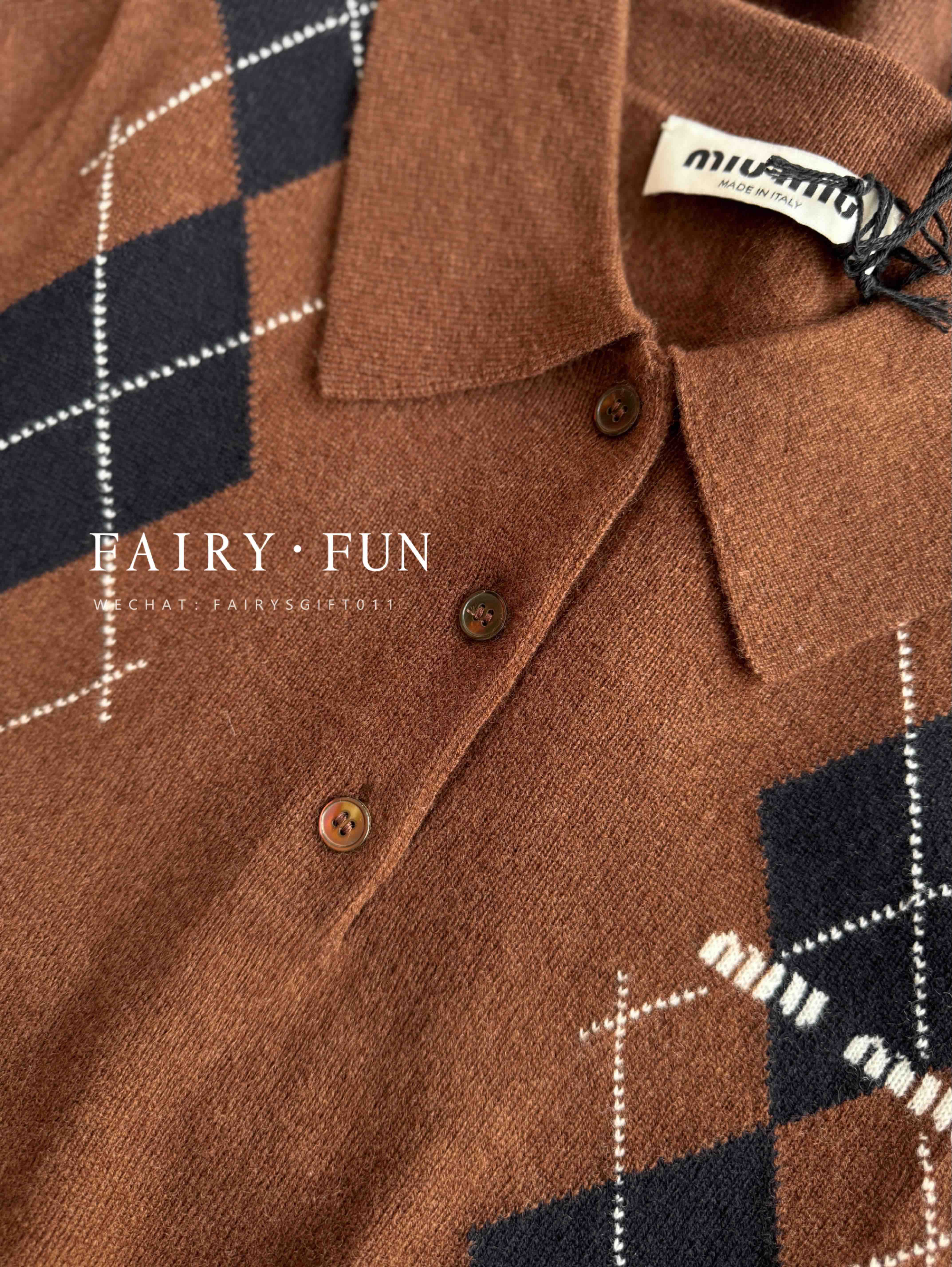 MIU-S 棕色菱格羊绒Polo.