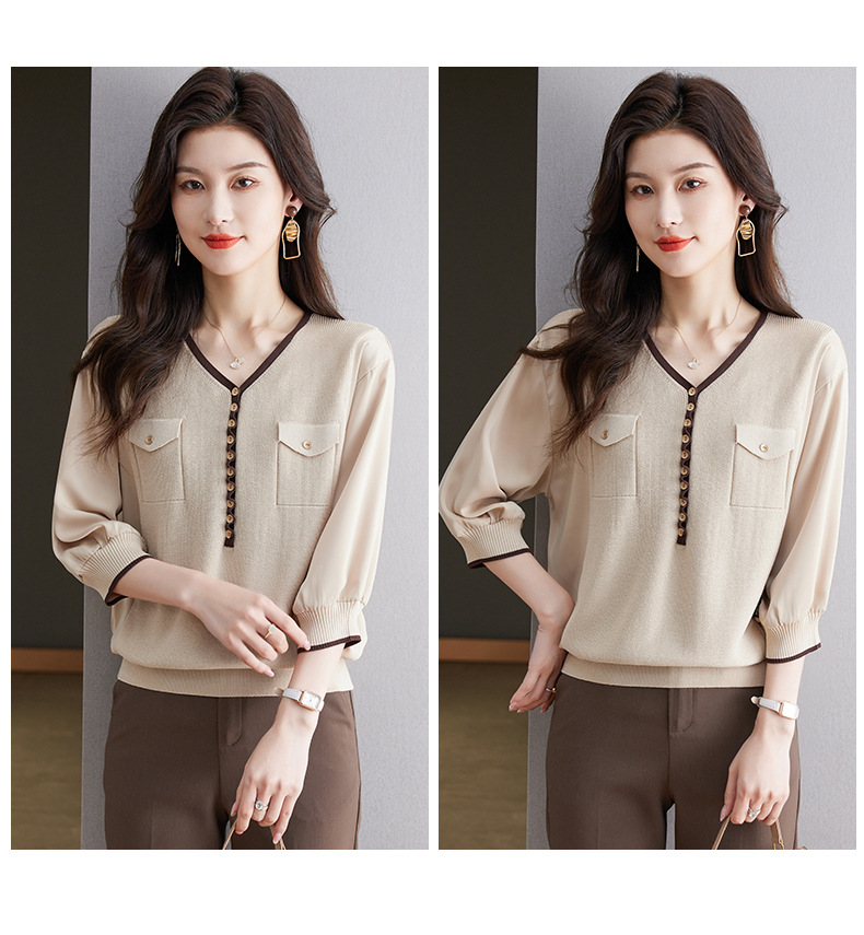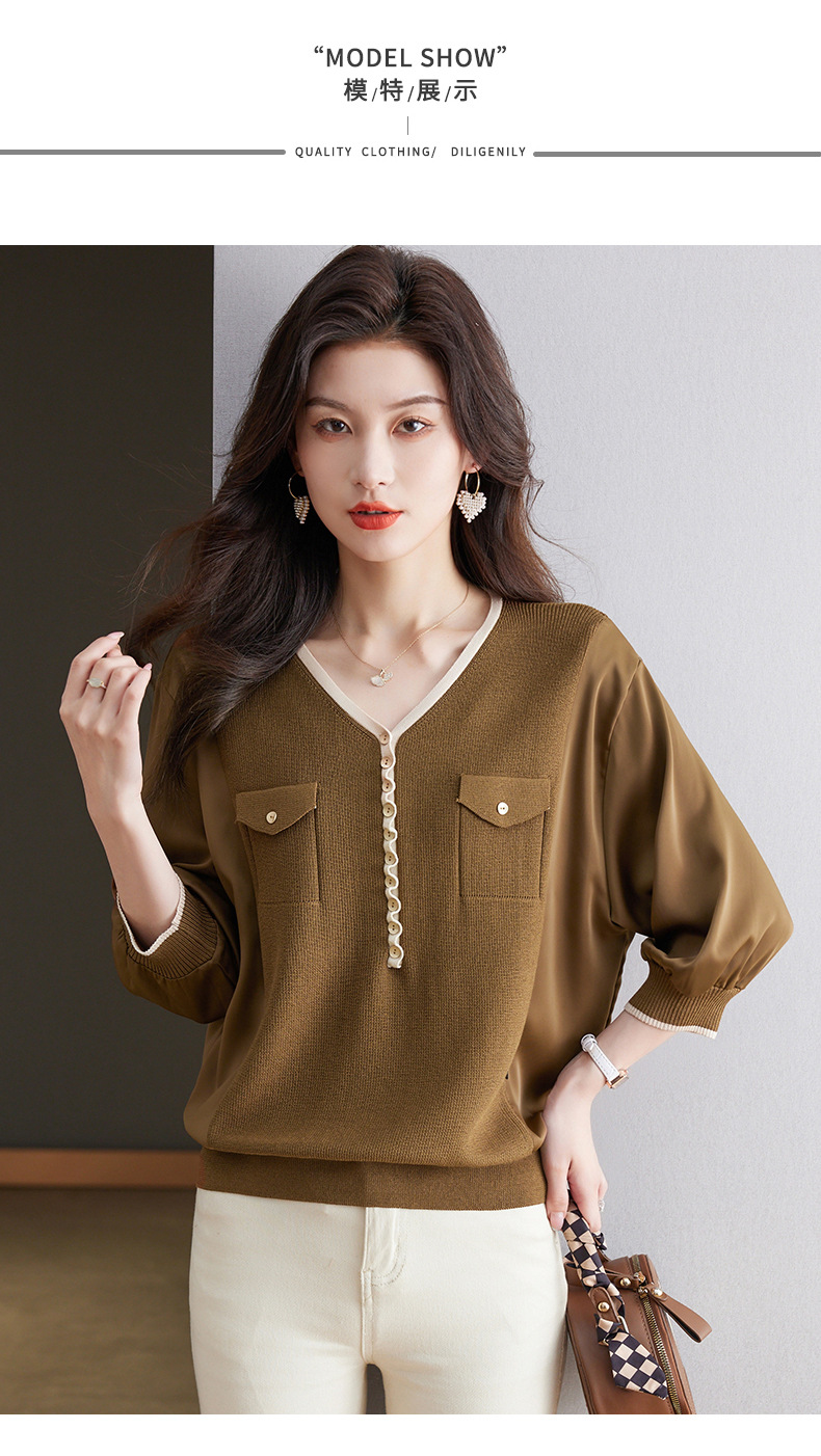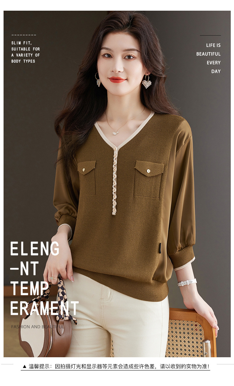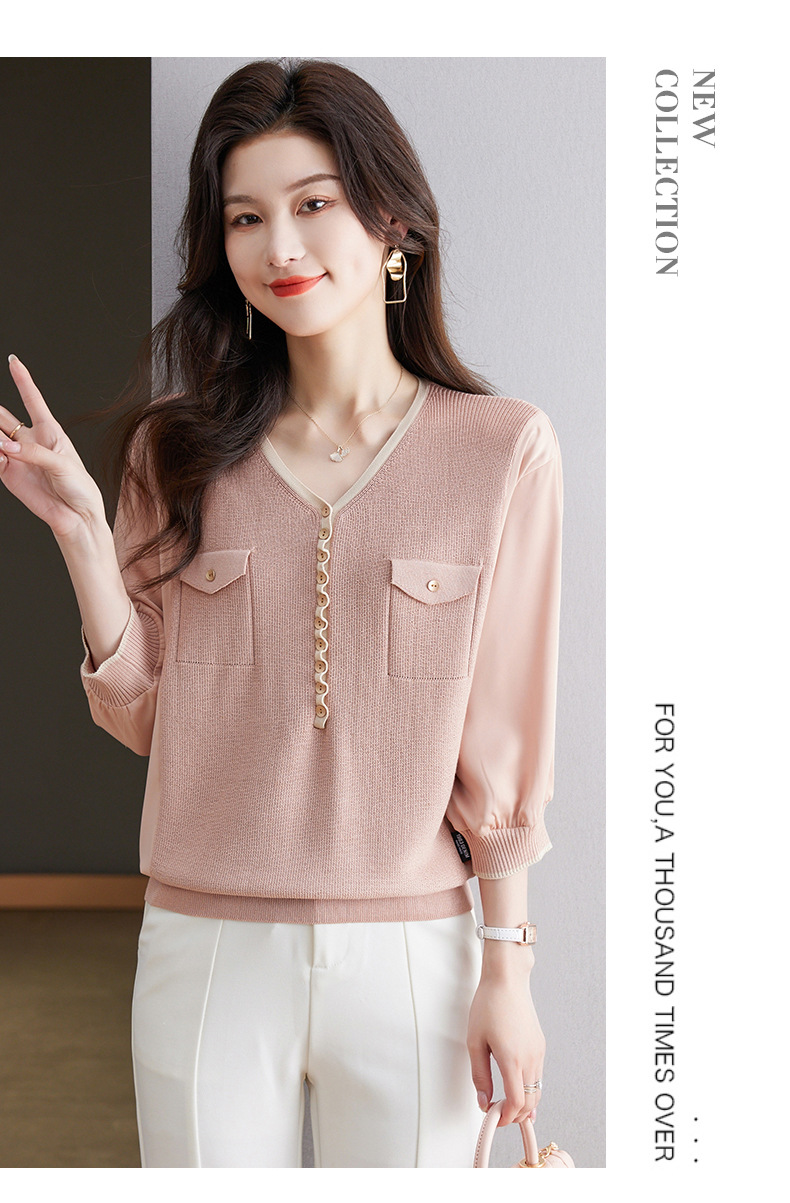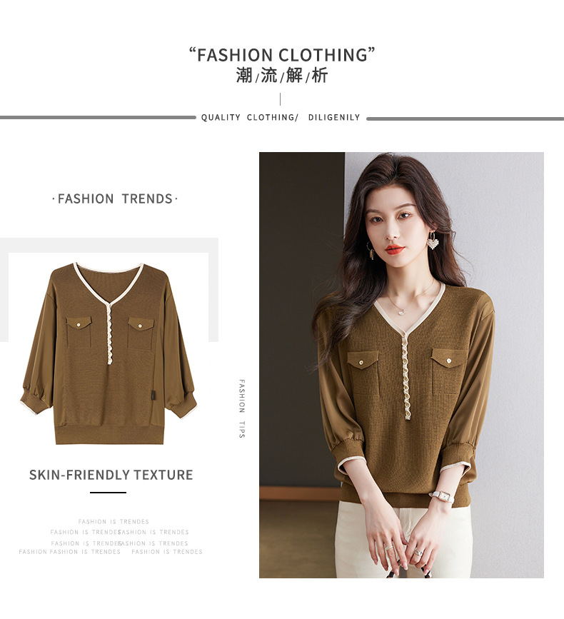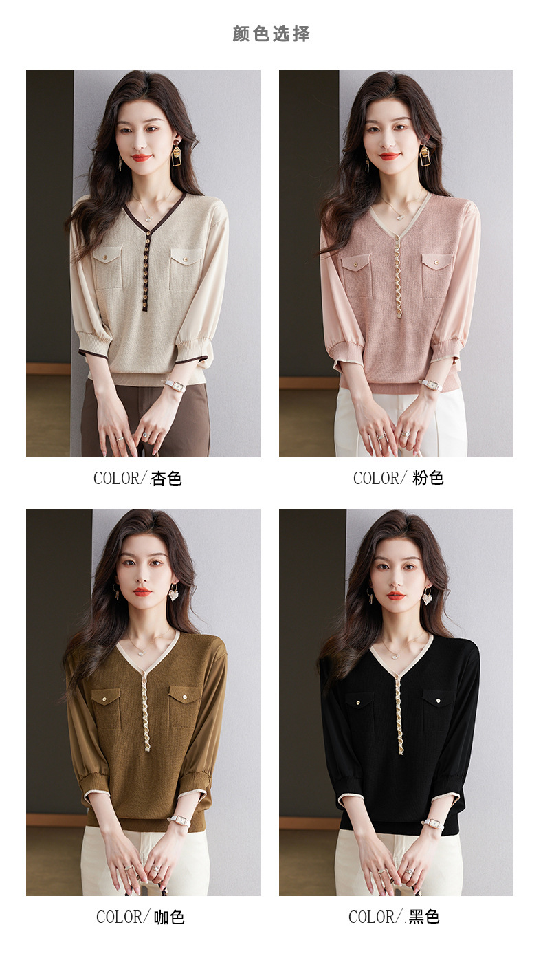 七分袖雪纺拼接t恤,冰丝针织衫v领上衣t桖CC- 10-5193