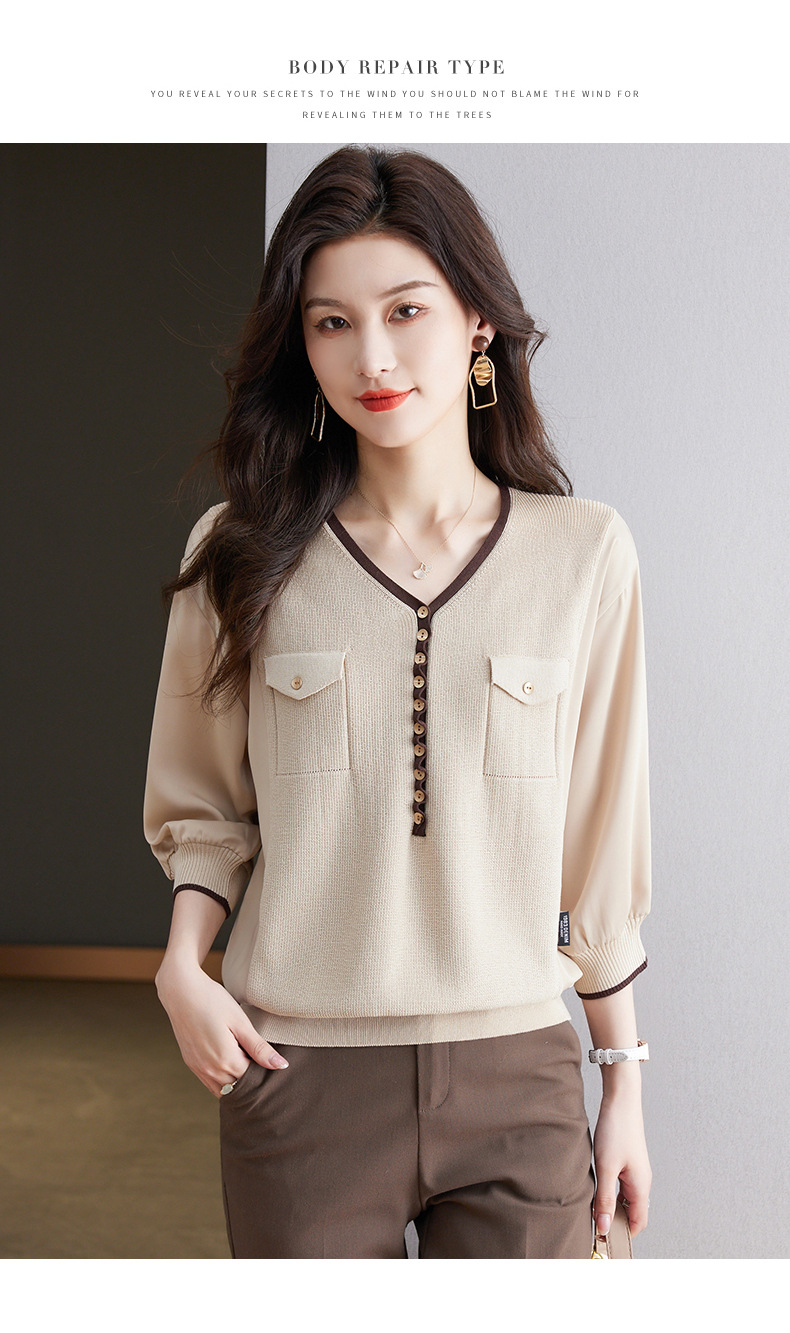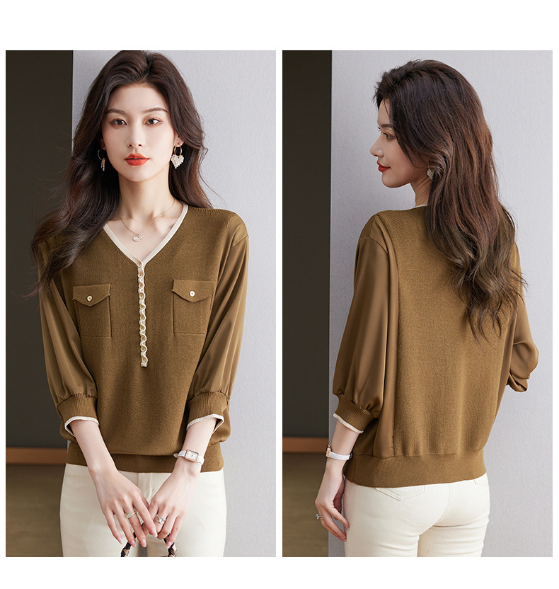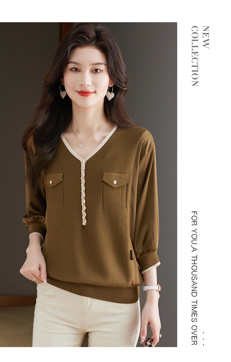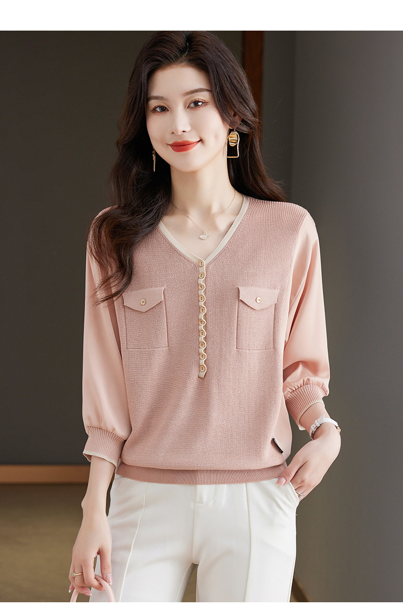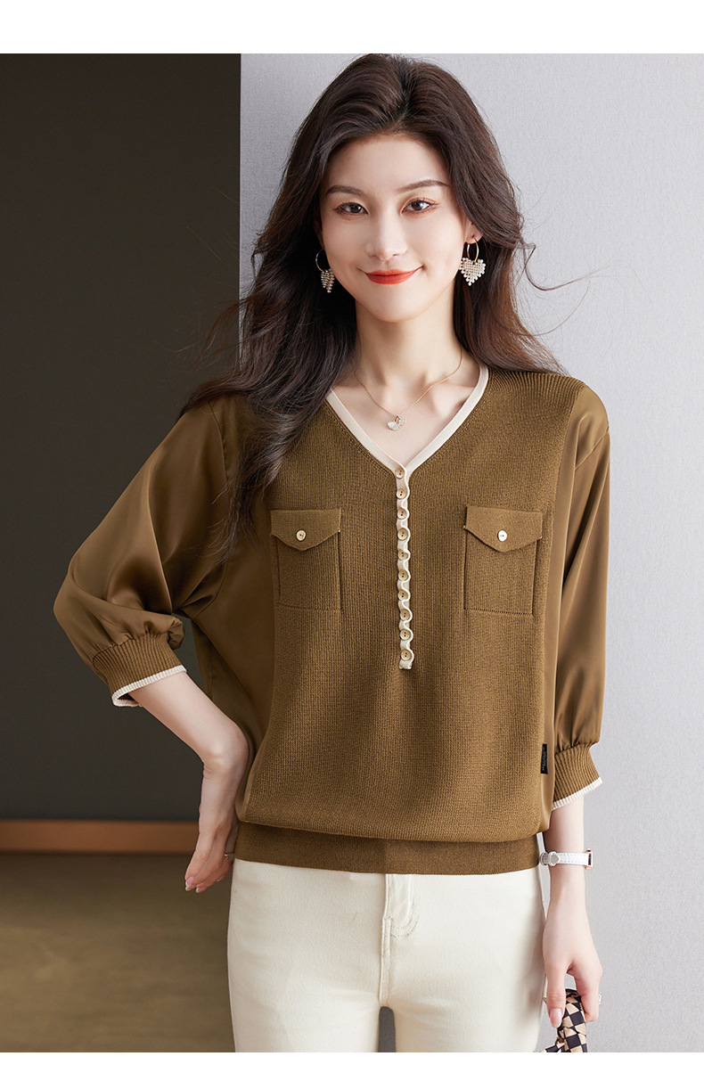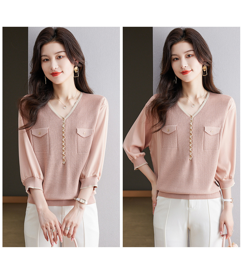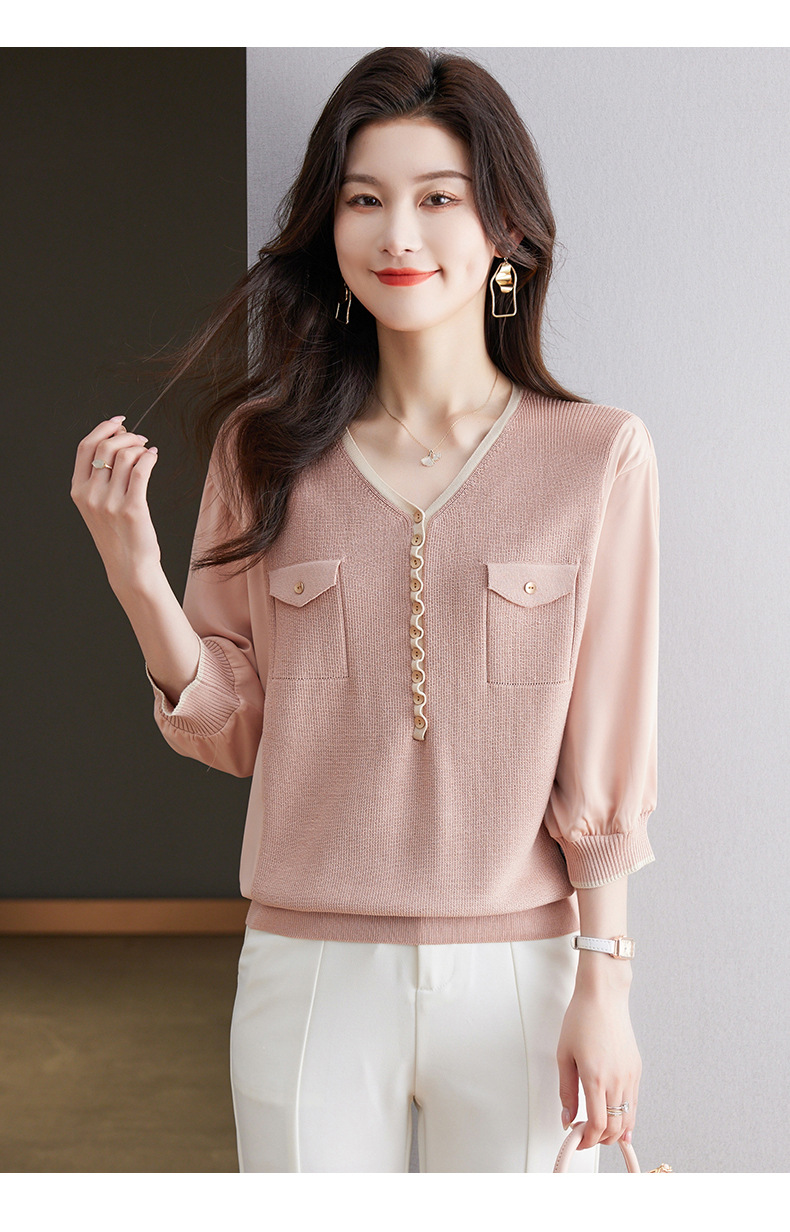 七分袖雪纺拼接t恤,冰丝针织衫v领上衣t桖CC- 10-5193