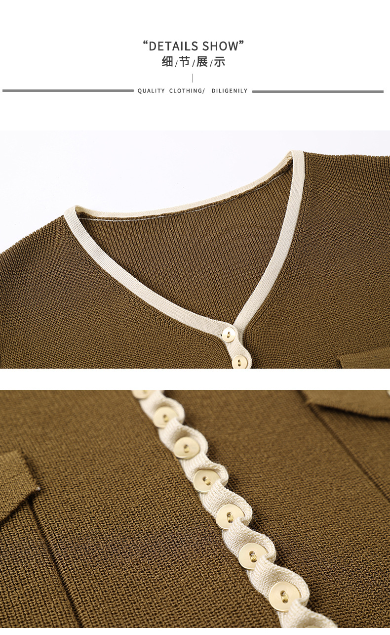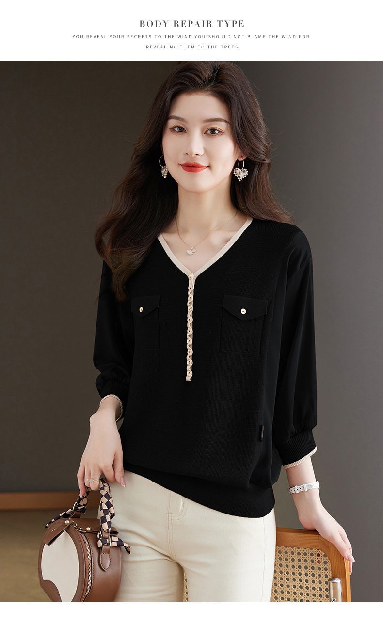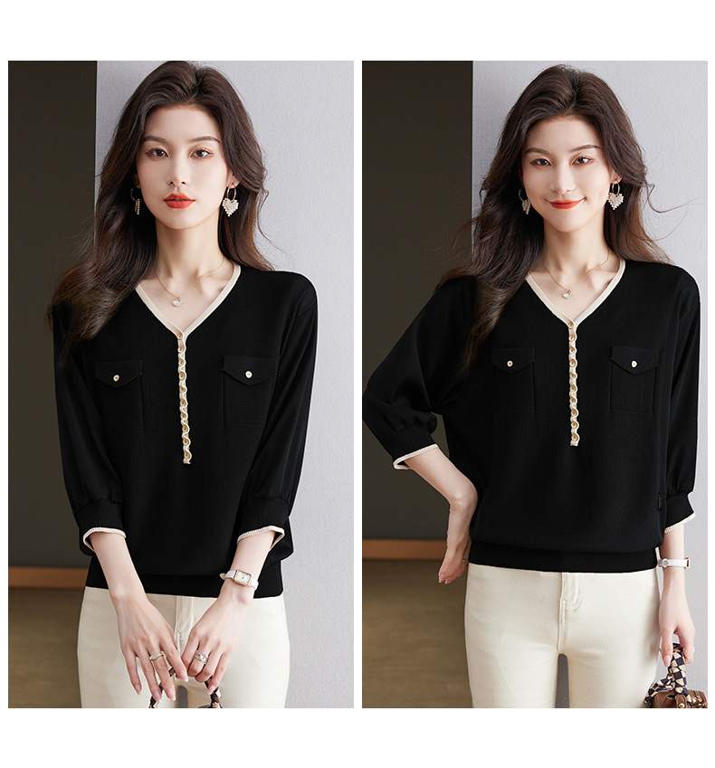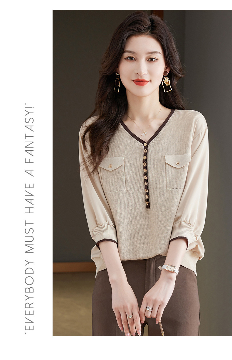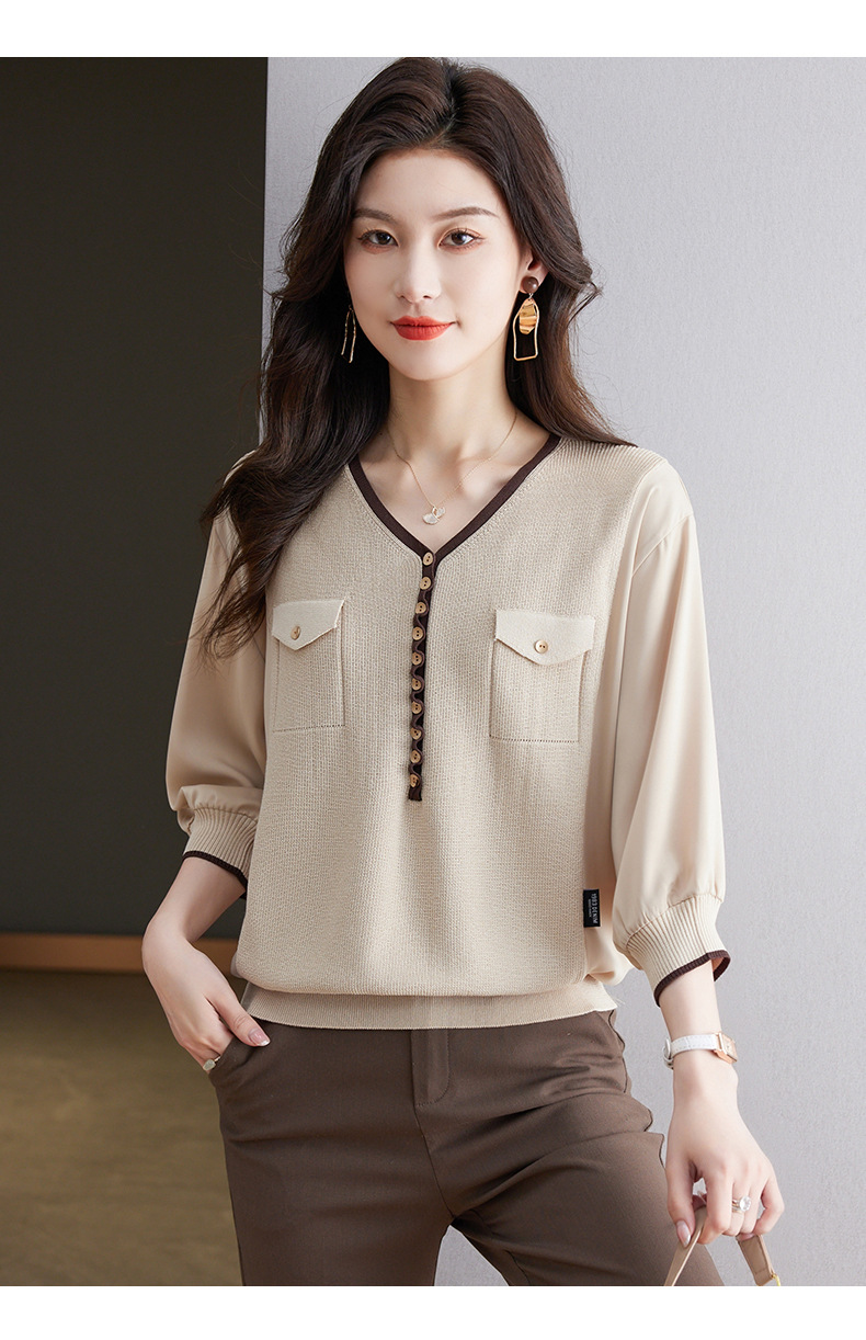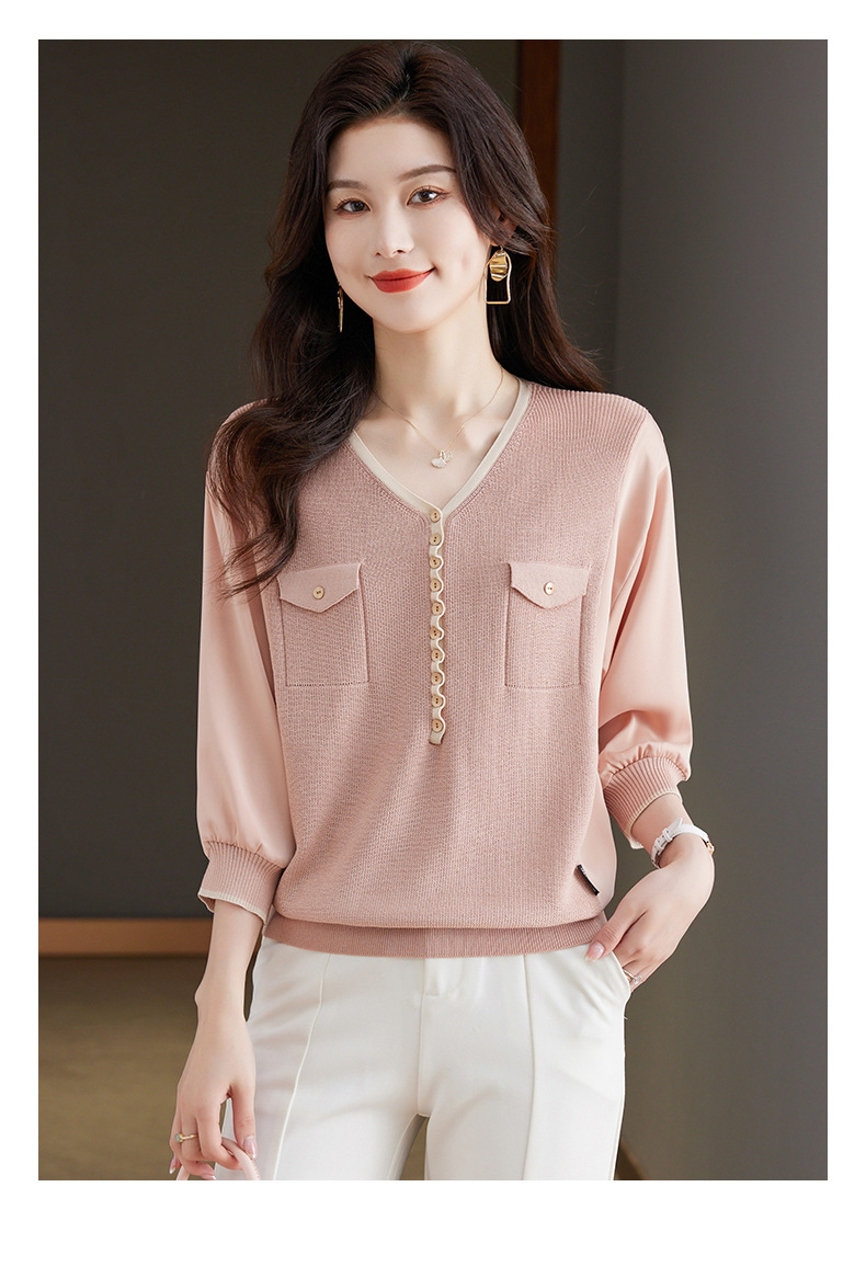 七分袖雪纺拼接t恤,冰丝针织衫v领上衣t桖CC- 10-5193