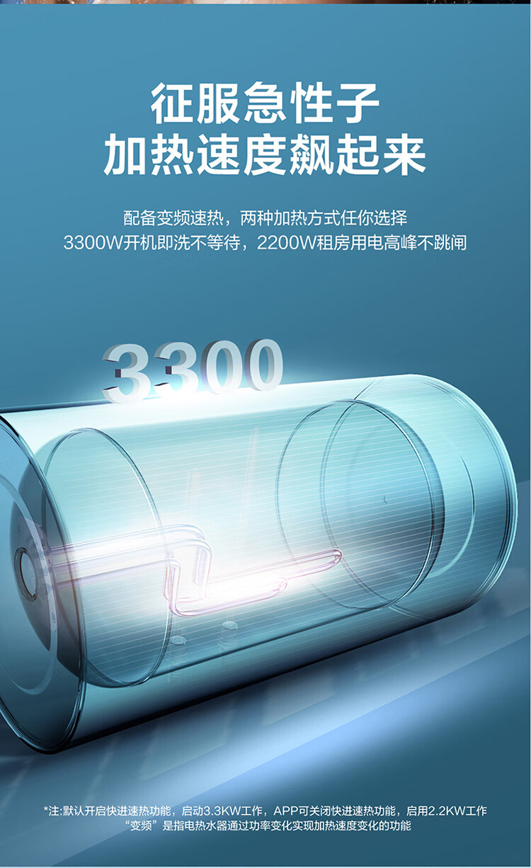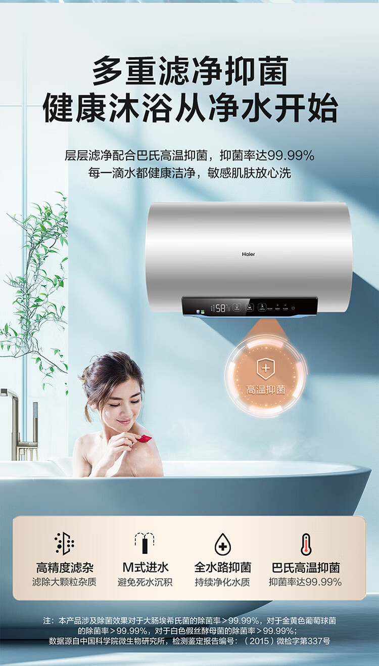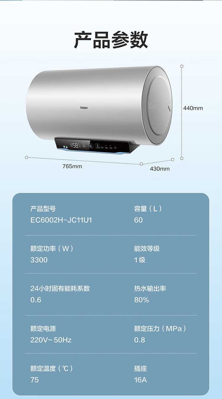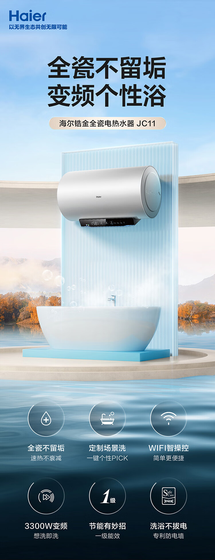 海尔(Haier)【JC11】60升电热水器 3.3KW/2.2KW变频速热 净水洗 内胆免清洗 EC6002H-JC11U1 *