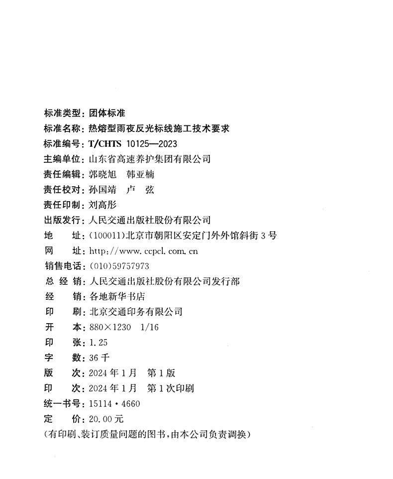 书名:热熔型雨夜反光标线施工技术要求(T/CHTS 10125—2023)