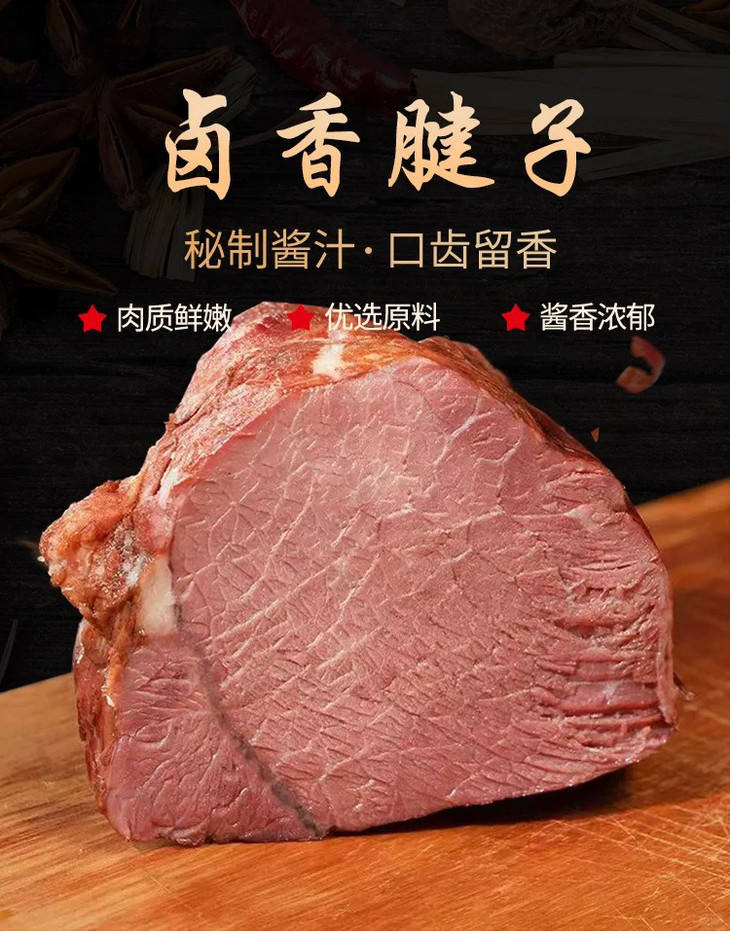 🔺精选农家散养家猪 不加束缚的运动空间,使猪肉肉质紧实有嚼劲 肌肉纤维丰富 味道浓郁,口感更有嚼劲,更适合酱卤 经过老卤慢炖出来的腱子肉 有嚼劲的同时不塞牙不干柴 肉和筋相间,软烂浓香