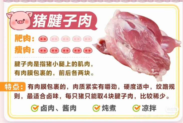 猪腱子肉是指猪小腿上的肌肉有肉膜包裹的,前后各两块。 是猪小腿部位肌肉的核心部分 有肉膜包裹的,肉质紧实有劲,硬度适中, 纹路规则,最适合卤味,每只猪只能取4块腱子肉,比较稀少👍 这个部位堪称猪身上的“运动健将”, 因其承载着猪只日常行走、支撑全身重量的重任, 故而肌肉纤维紧密扎实,脂肪含量低 Q弹、爽滑、嚼劲十足,同时又与紧实的瘦肉部分完美融合,形成层次分明的独特享受
