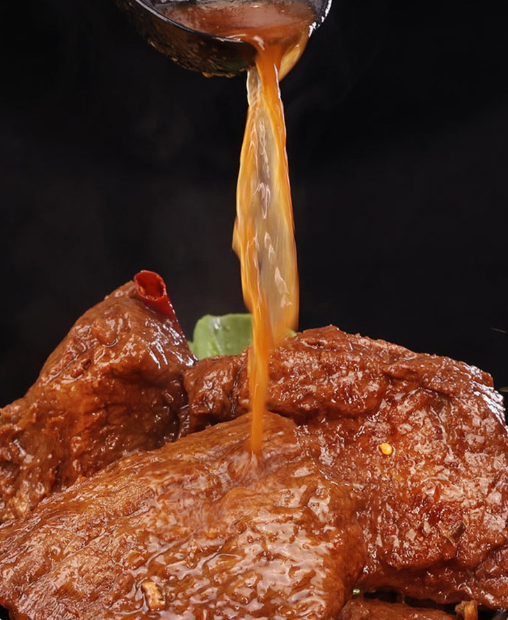 香料配伍——去异增香,风味平衡 优选多种香辛料配比,老卤慢炖熬制 去腥除腻效果显著,与猪肉的油脂香相得益彰,形成平衡而不腻口的风味 猪腱子肉肉质紧实,不易入味。 通过长时间的“焖泡”,卤汁能彻底渗透到肌肉纤维中心,做到“咸香入里”,内外滋味一致