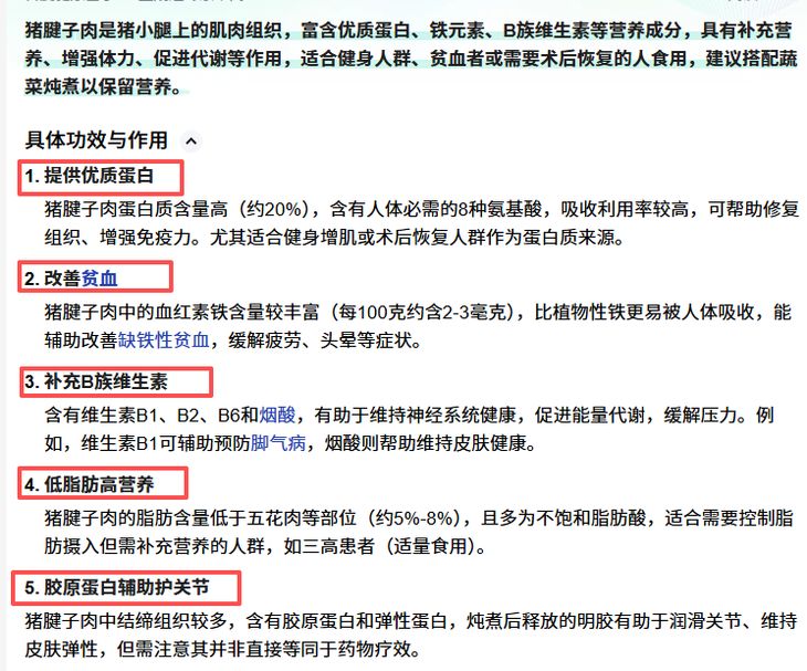 猪腱子肉不仅口感筋道、富有弹性,更被誉为营养宝库, 蕴含丰富的蛋白质、铁元素、维生素B族以及珍贵的胶原蛋白💪💪 这些营养成分协同作用,使得猪腱子肉成为滋补身体的佳品,尤其受到女性👩和中老年人👩🦳的青睐 其中的胶原蛋白对皮肤和关节大有裨益, 能助力保持皮肤弹性、延缓衰老,同时也有助于保护骨骼关节。 而铁元素则能有效改善贫血症状,助你焕发活力😍😍