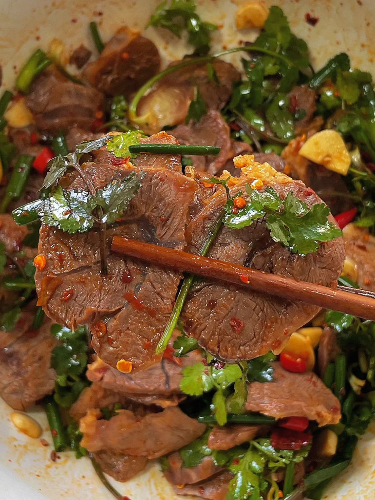 🤤可凉拌、煮面、冷吃❗下酒一绝❗ ✅凉拌菜之王: 将腱子肉切成薄片,与黄瓜丝、香菜、蒜末、辣椒油、醋等一起凉拌,便是一道惊艳的下酒好菜。肉片的嚼劲与蔬菜的清爽相得益彰。 ✅面条/米线的绝配浇头: 清晨或深夜,煮一碗清汤面或米线,将切好的腱子肉片铺于其上,一碗平淡的主食立刻升级为豪华套餐。肉汁融入汤中,鲜美无比。 ✅炒饭/炒菜的精华配料: 将腱子肉切丁,与隔夜饭、鸡蛋、青豆等一同炒制,肉的咸香渗透到每一粒米饭中。或者与蔬菜(如蒜苔、芹菜)同炒,无需额外加盐,风味已然十足。 ✅夹馍/卷饼的灵魂伴侣: 将肉撕成丝,夹入热腾腾的白吉馍或荷叶饼中,再淋上少许肉汁,便是中式汉堡的顶级体验。