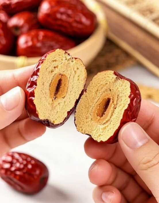 吃法,百搭到离谱🤯! 咬开是厚实的枣肉,软糯不柴,甜度是自然的蜜甜(不是齁嗓子的甜!),空口吃能炫半袋🍯! ✔ 揣兜里当能量包⚡:早八塞几颗,赶工来一包,嘴巴不闲肚子不饿~摸鱼炫枣超快乐😜 ✔ 泡水 / 煮甜汤🥣:配银耳、雪梨煮一碗,秋冬喝暖到胃里;泡杯枣茶,枣香裹着清甜,喝水都变享受~ ✔ 做甜品 / 辅食🍰:捏碎加进粥里、做成枣糕,软乎乎的枣香,小孩抢着吃👶🏻(家长再也不用愁辅食啦!)