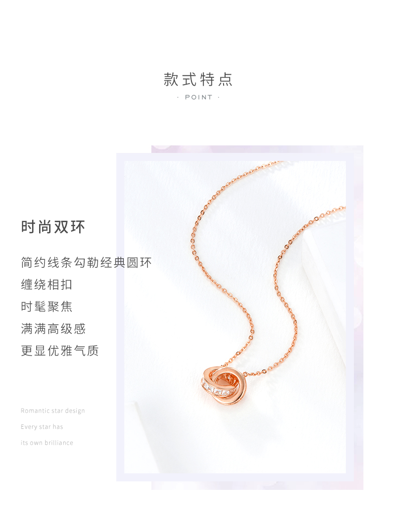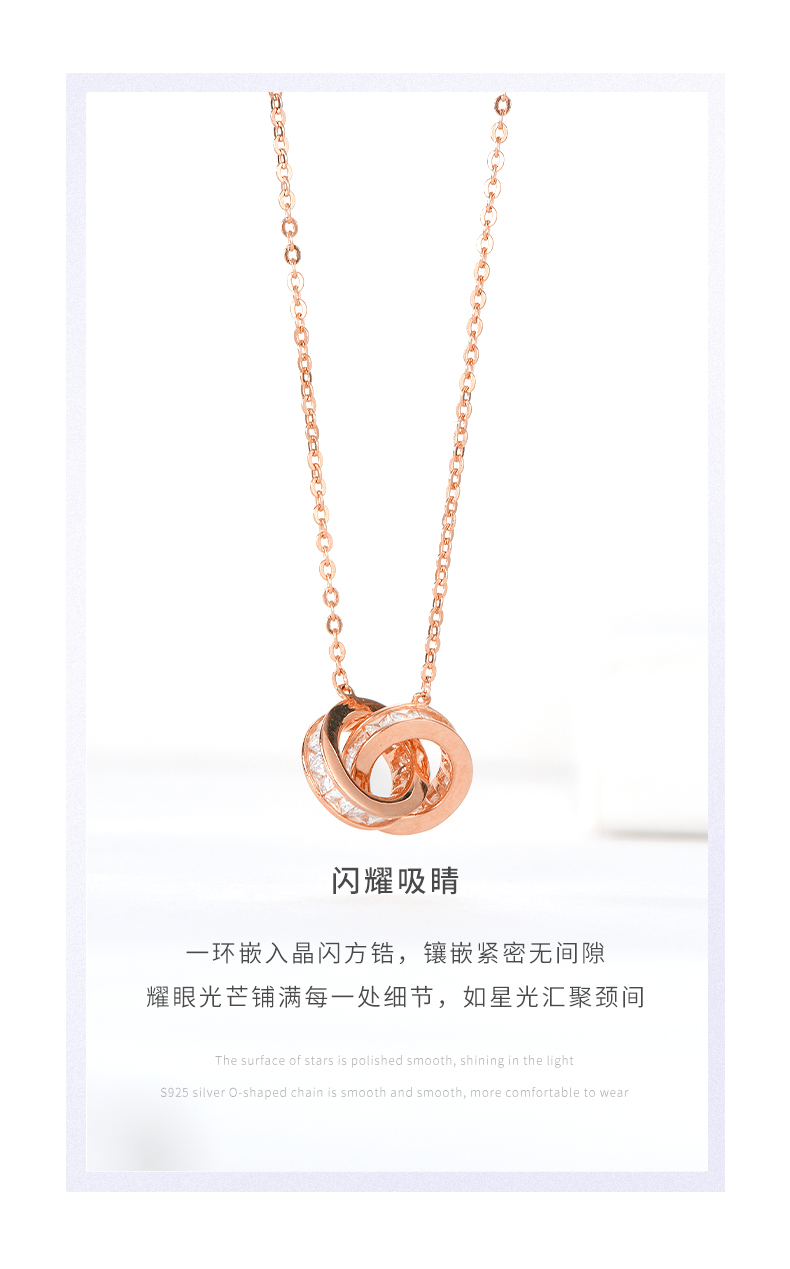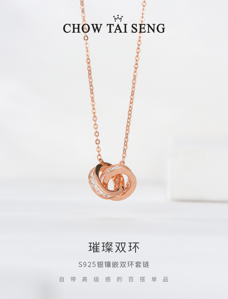 周大生S925银镶锆石项链女ins小众设计双环锁骨链