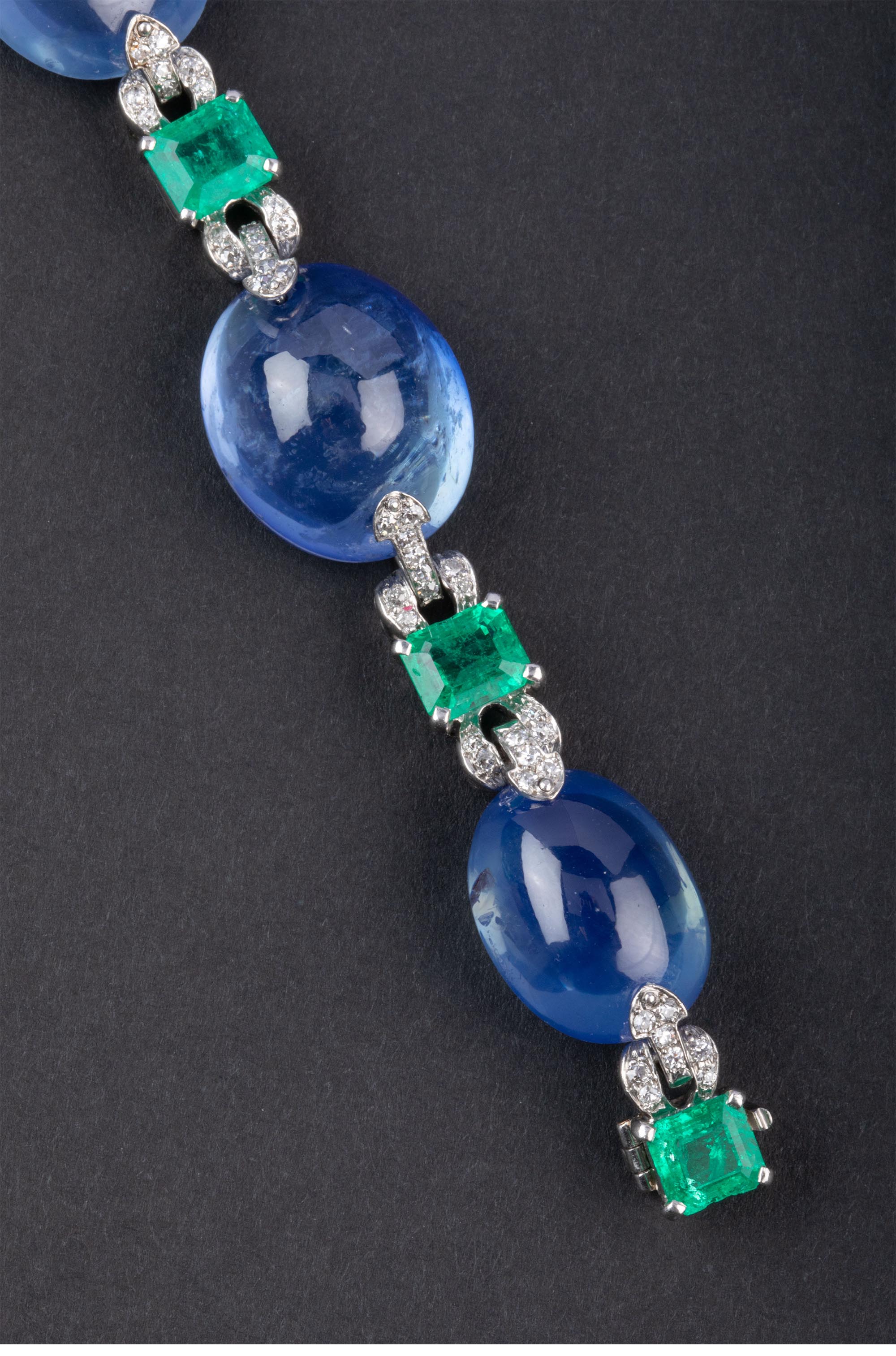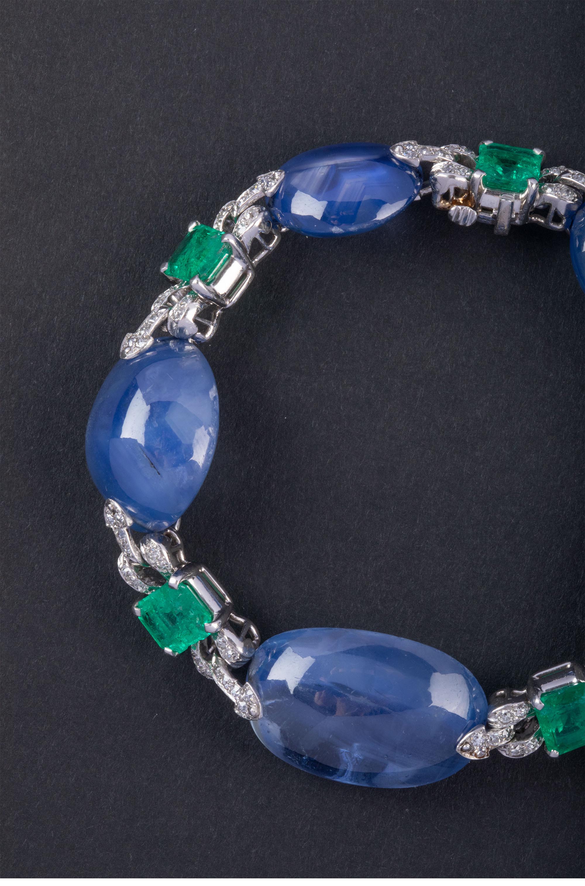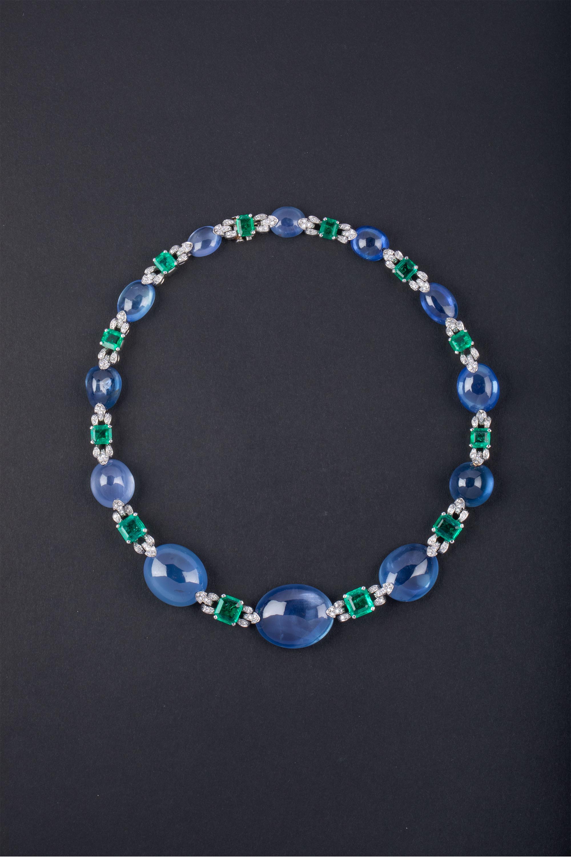 20世纪法国出品白金镶嵌蓝宝石祖母绿及钻石珠宝套件(含耳饰、项链、手链)