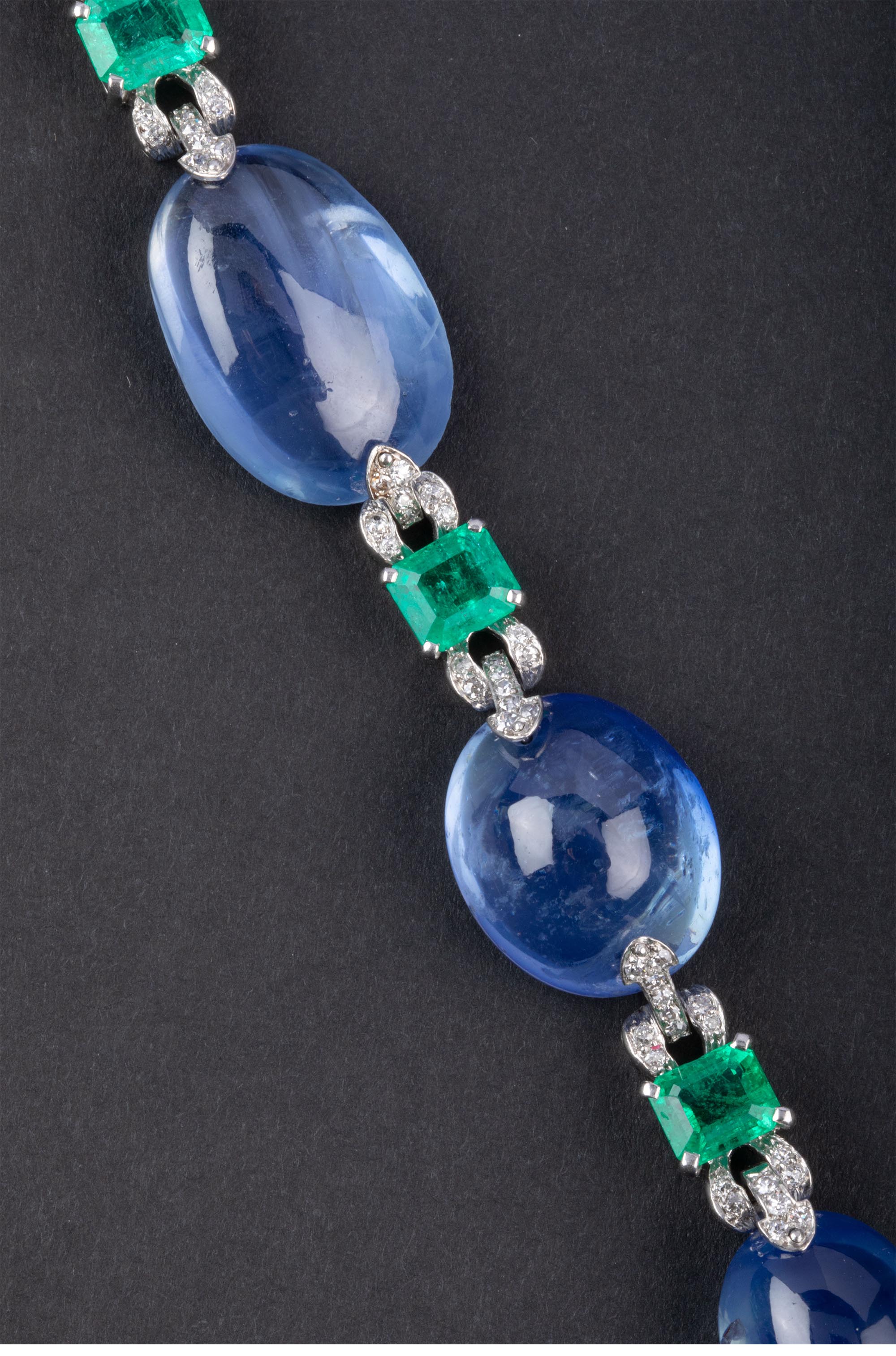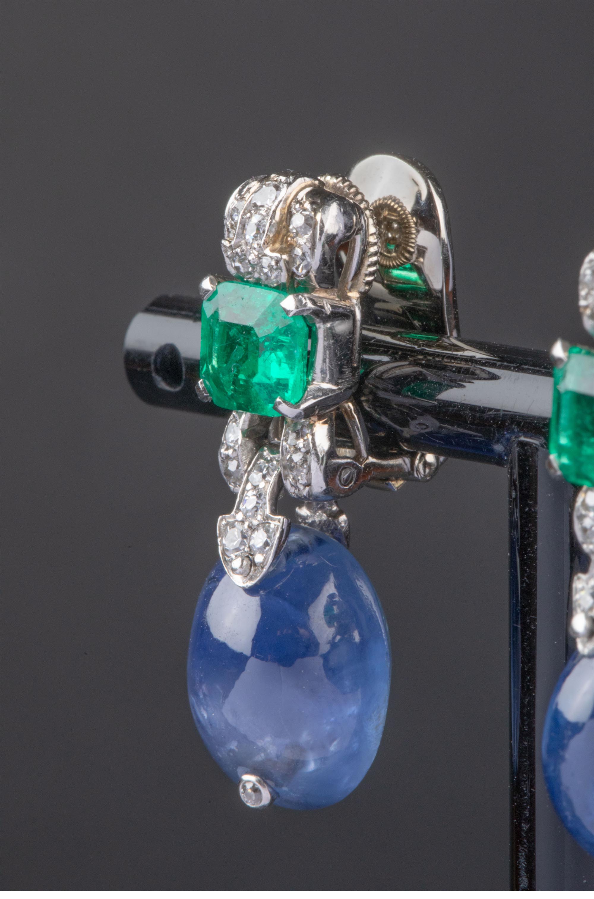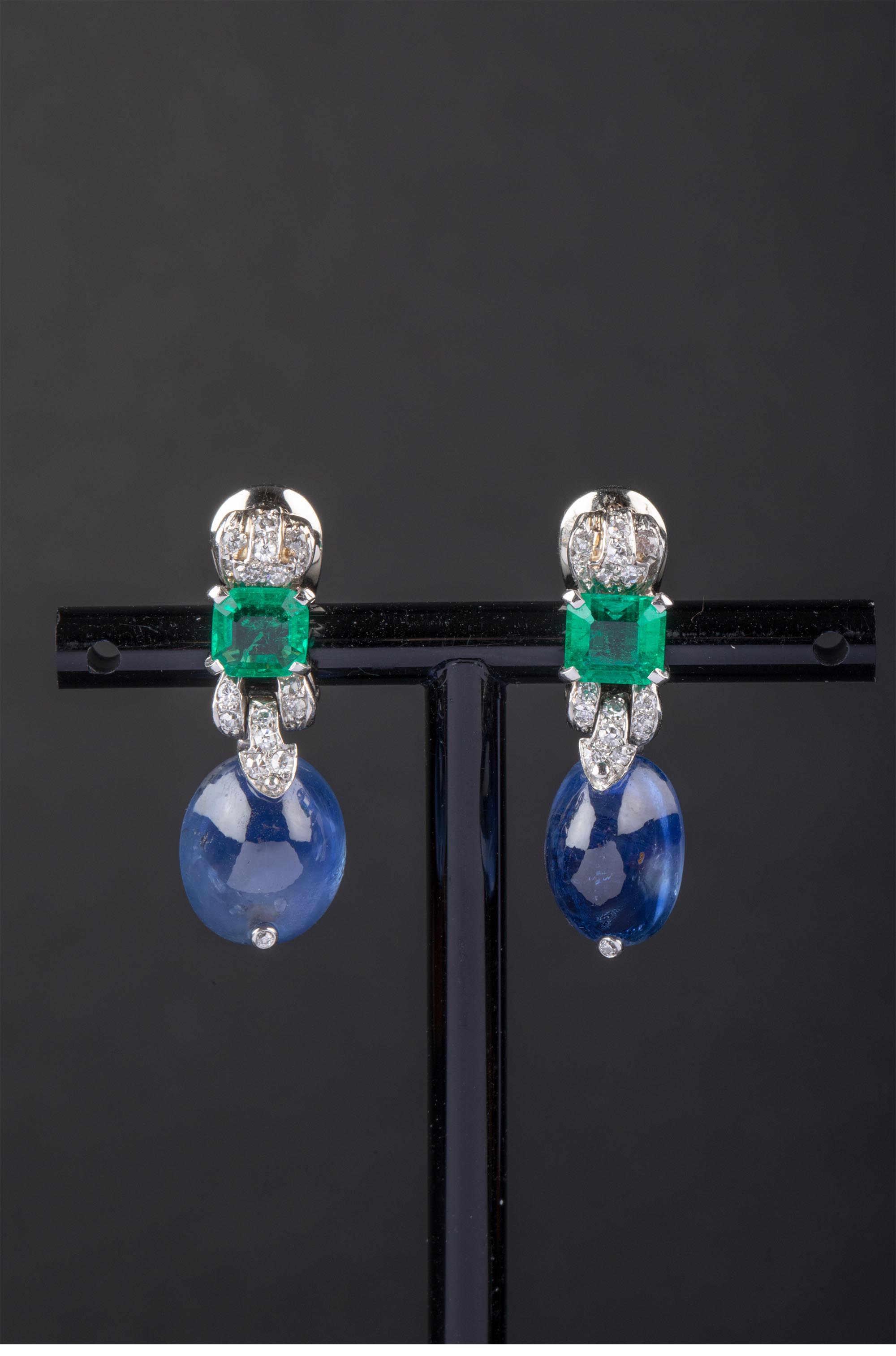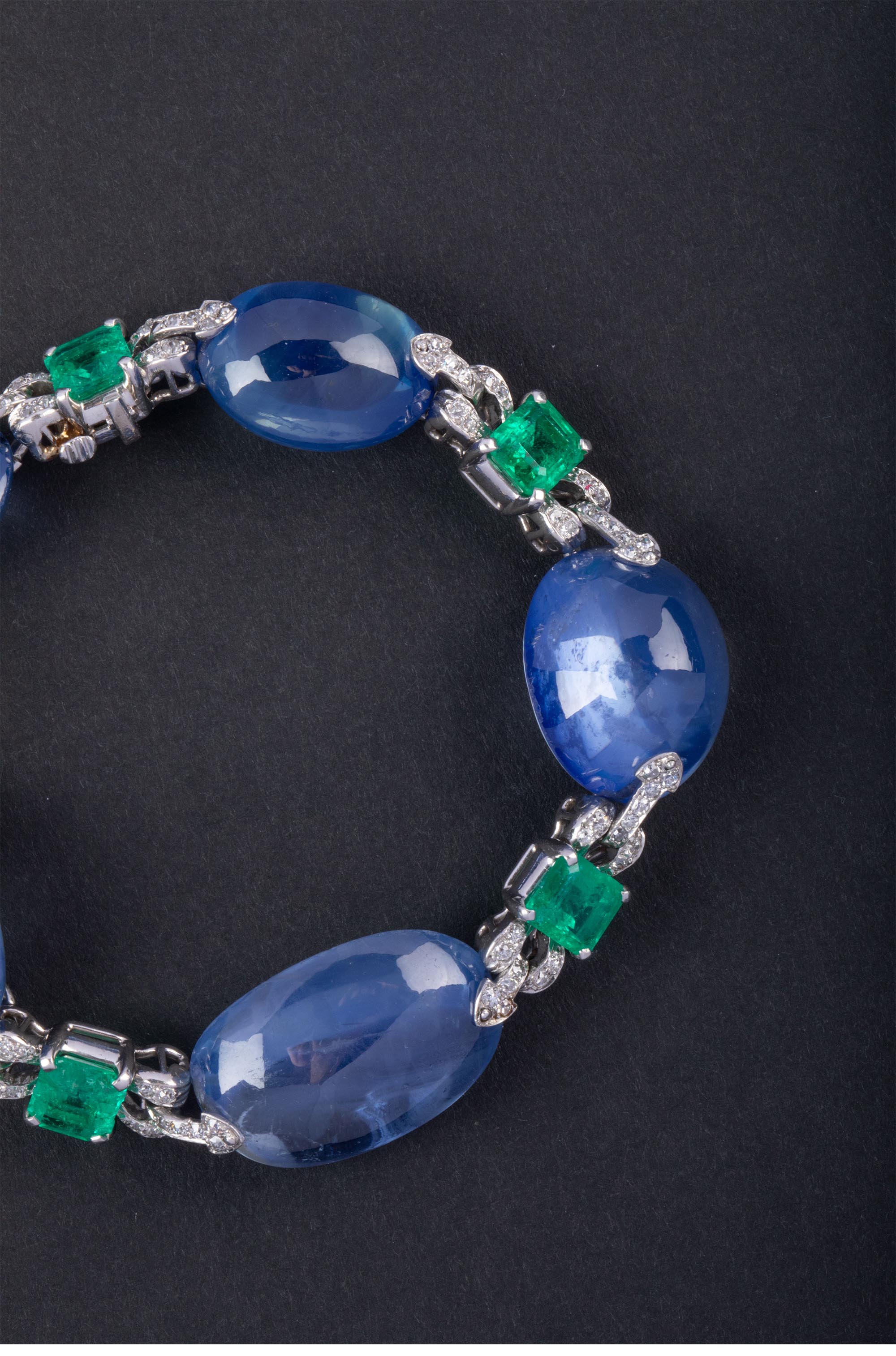 20世纪法国出品白金镶嵌蓝宝石祖母绿及钻石珠宝套件(含耳饰、项链、手链)