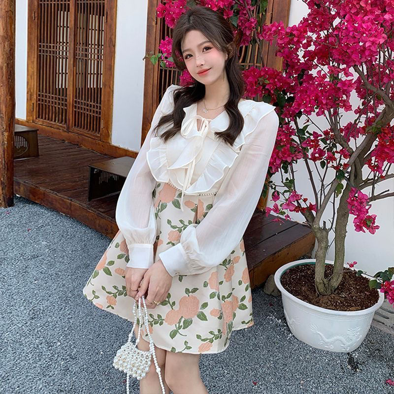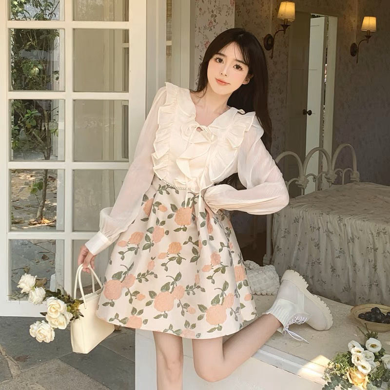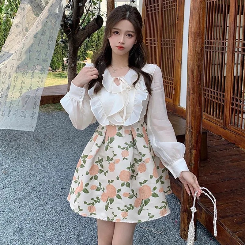 春秋季【法式假两件V领连衣裙女 新款设计感】气质收腰 碎花短裙子潮
