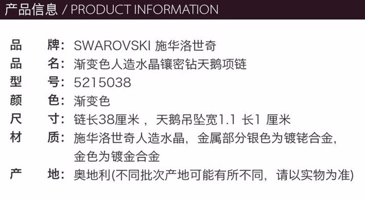 Swarovski 施华洛世奇 渐变色人造水晶镶密钻天鹅项链 5215038