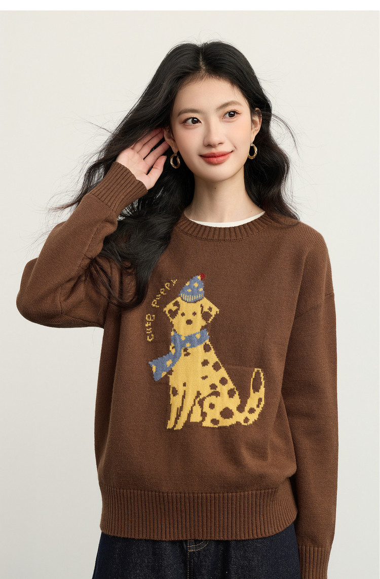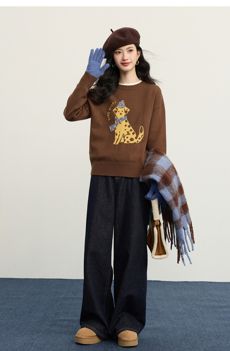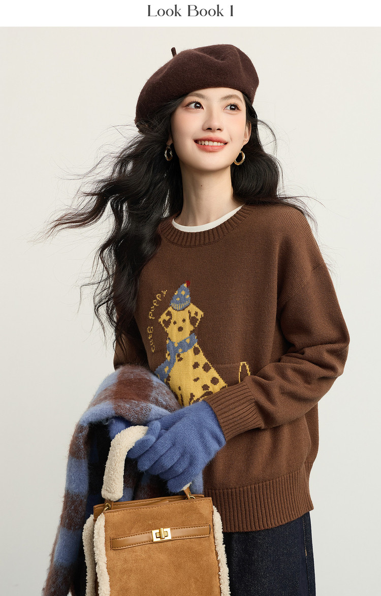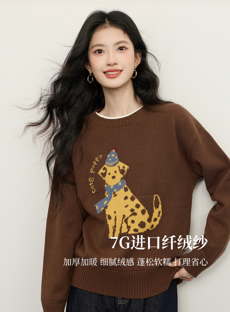 【12/31新品】熙世界韩系小狗提花毛衣女套头2025冬季新款加厚纤绒纱圆领针织衫