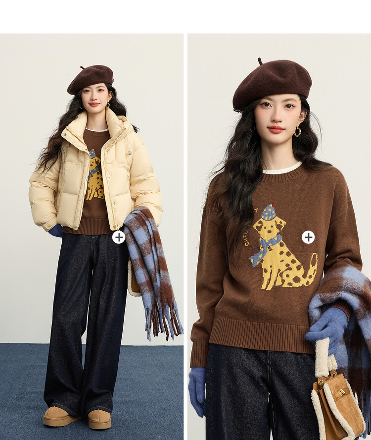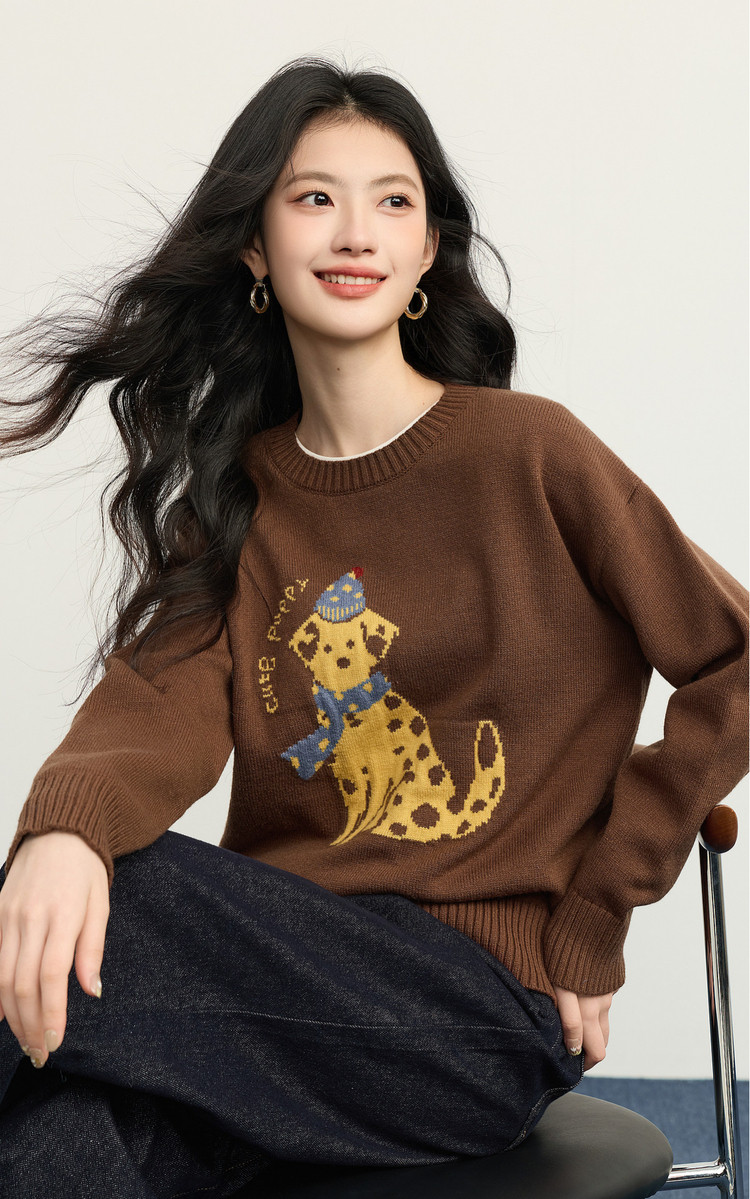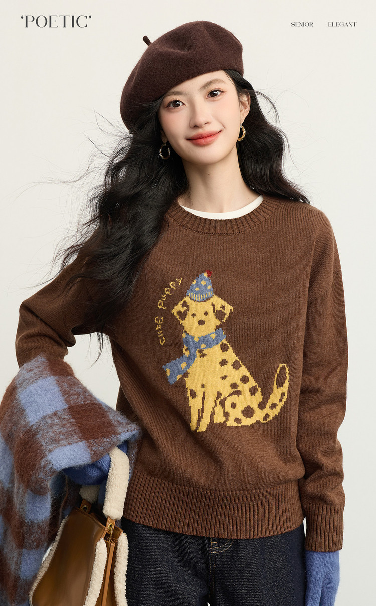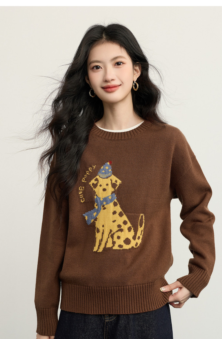 【12/31新品】熙世界韩系小狗提花毛衣女套头2025冬季新款加厚纤绒纱圆领针织衫