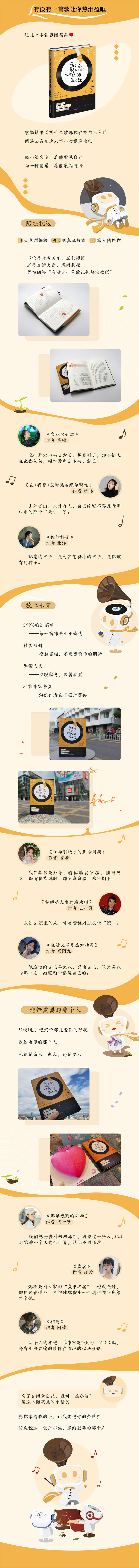 v 这是对文学新人的一次重推。网易云音乐是卧虎藏龙之地,此次征稿函一经发布,各行各业的音乐爱好者化身文学达人,将青春中的疼、盐、糖以最简单、最自然的方式呈现出来。这是继超级畅销书《听什么歌都像在唱自己》后,网易云音乐文学力量的又一次重磅输出,入围者中可能会有未来的小说家、散文家或金牌编剧。