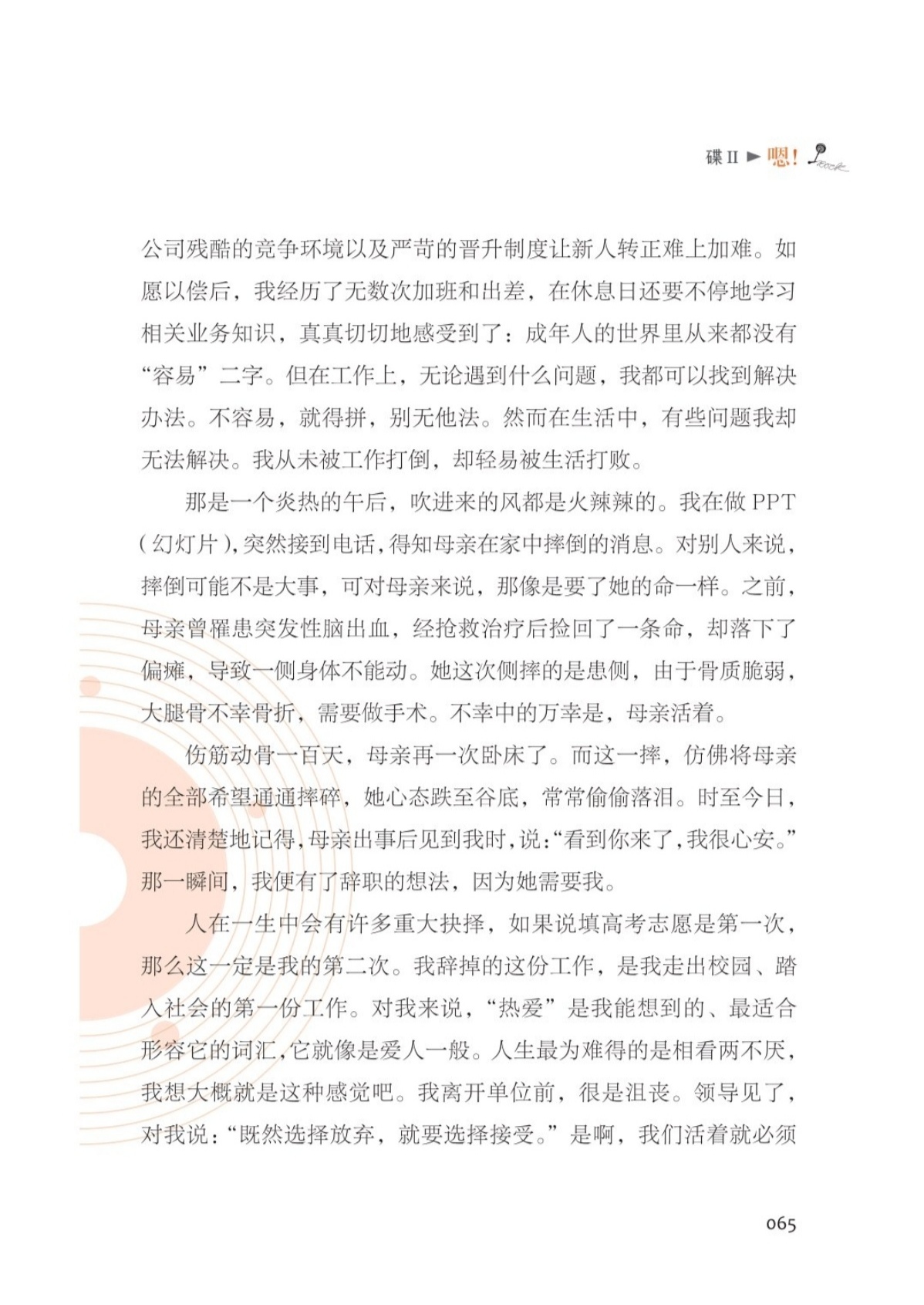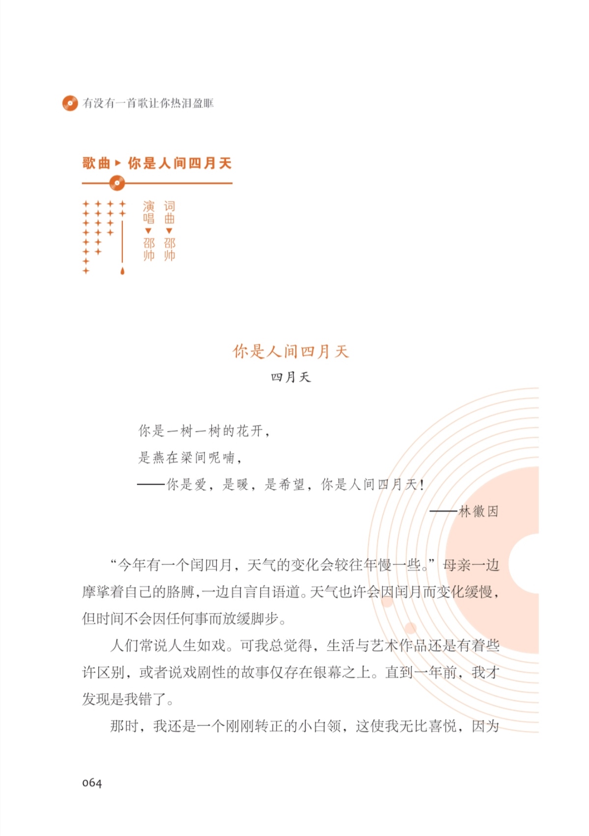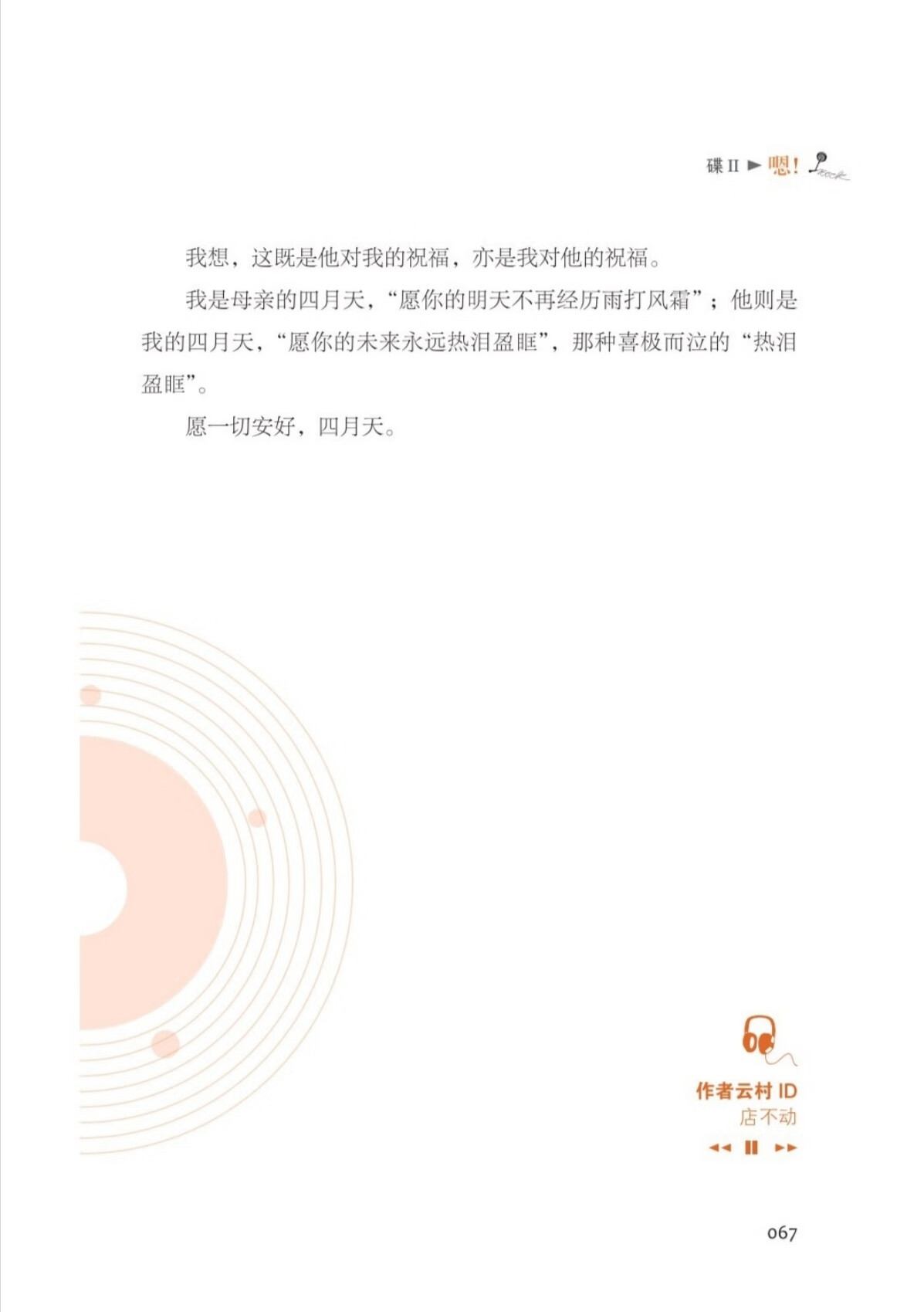 由于他们的无私,本书内容呈现了更为丰富的情感。基于每篇文章的情感基调,我将本书分为四章,每章又被喻为“一张语气大碟”,分别是“唉!”“嗯!”“啊!”“嘿!”。“唉!”碟是忧伤的,有留不住的人、窥不完的动态、甩不掉的牵绊等;“嗯!”碟是惊诧的,有犹未晚矣的惊觉、生活不易的体悟、转瞬之间的成长等;“啊!”碟是强烈的,有父母爱子女、老师爱学生、医护爱病患等;“嘿!”是澎湃的,有不畏艰辛的自励、蜕变自我的决心、追逐梦想的信念等。其间,我穿插了六篇精彩短文,配以不同于其他正文的版式呈现,正如音乐唱片中的 interlude(插曲)。