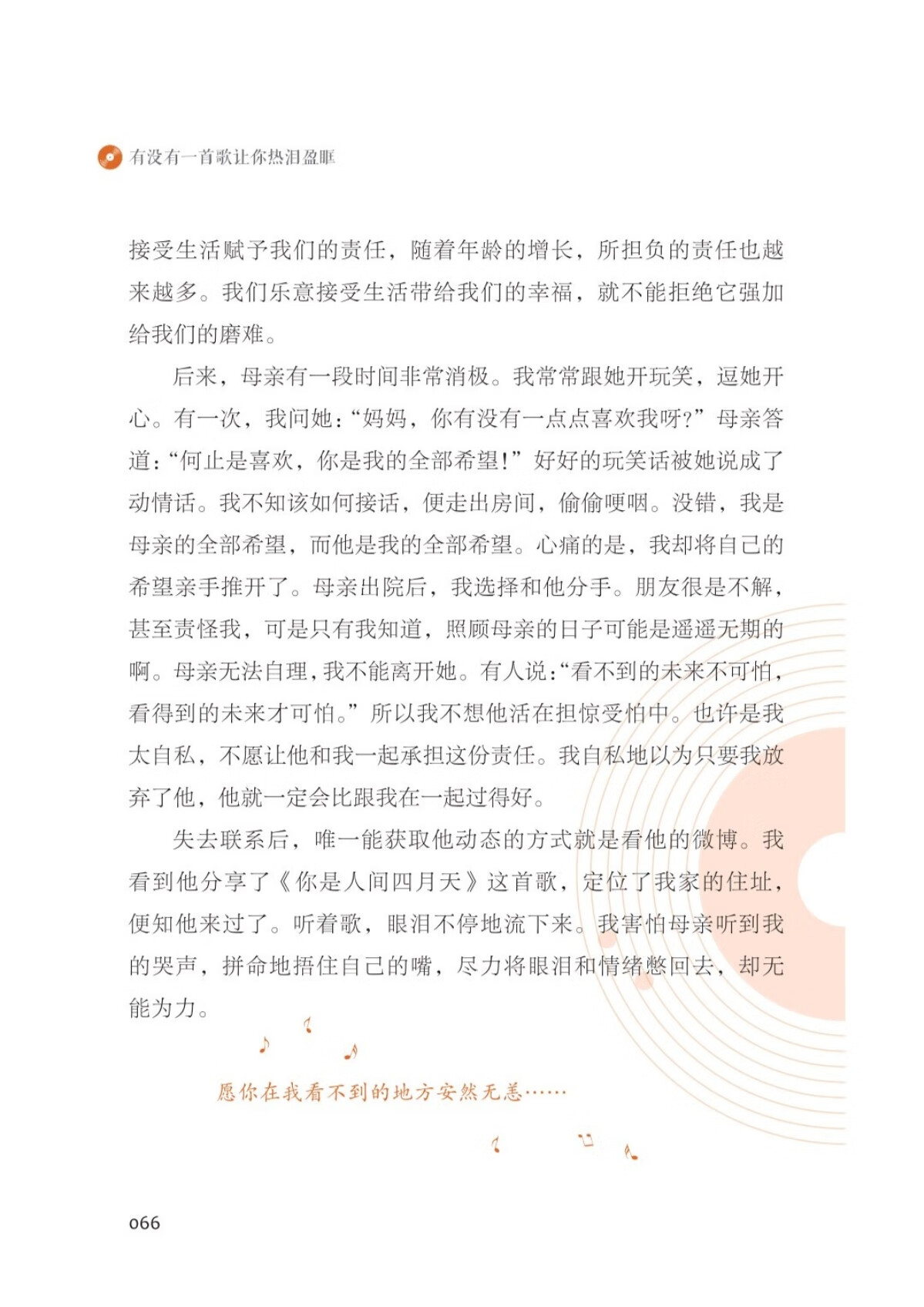 v 这是对青春记忆的一次收集。13天主题征稿,902则真诚故事,54篇入围佳作,每一篇都将“歌”“情”“文”三者极致融合,不论是青春苦乐、成长顿悟,还是真情大爱、风雨兼程,都在回答“有没有一首歌让你热泪盈眶”,为读者送上一个个感人肺腑、耐人寻味、催人奋进的青春故事。
