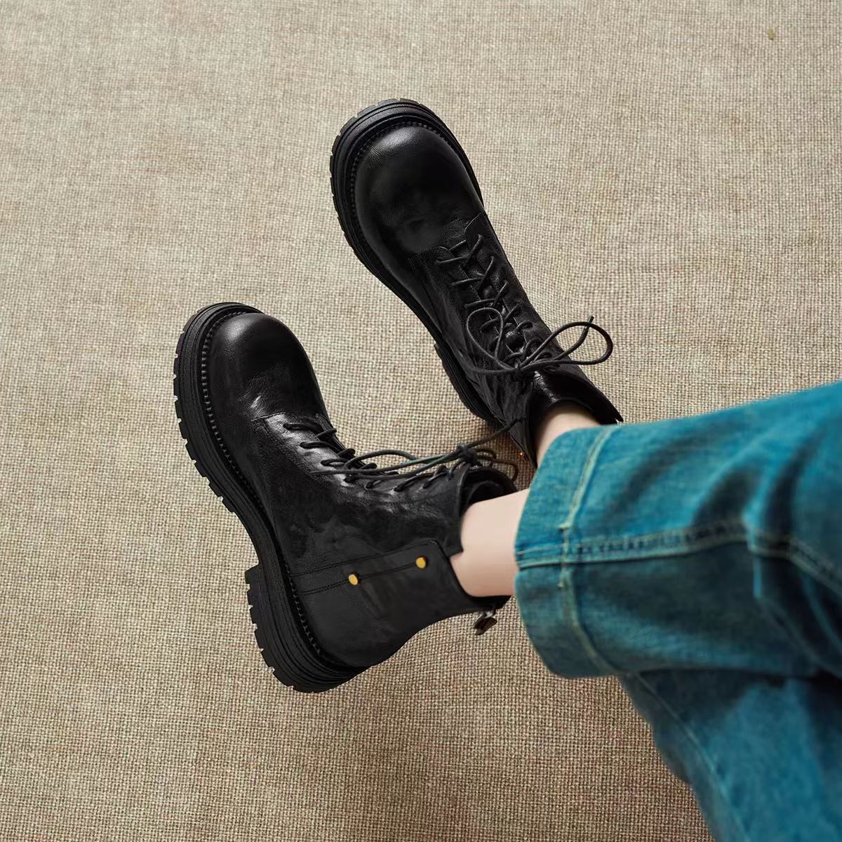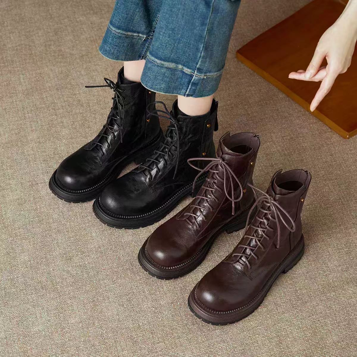 西村名物2025年冬季新款欧美复古厚底粗跟圆头短筒靴马丁靴X904341
