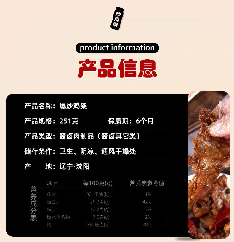 | 【品名】酱爆沈阳炒鸡架 【规格】251g/袋 【保质期】6个月 【储存方式】请置于阴凉通风干燥处 【产地】沈阳 【发货地】沈阳 【发货快递】申通 【不发货区域】新疆、西藏、港澳台地区不发 【补邮费地区】内蒙、甘肃、青海、宁夏+1元 【发货时效】48小时,节假日顺延 |
