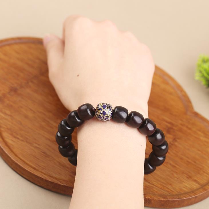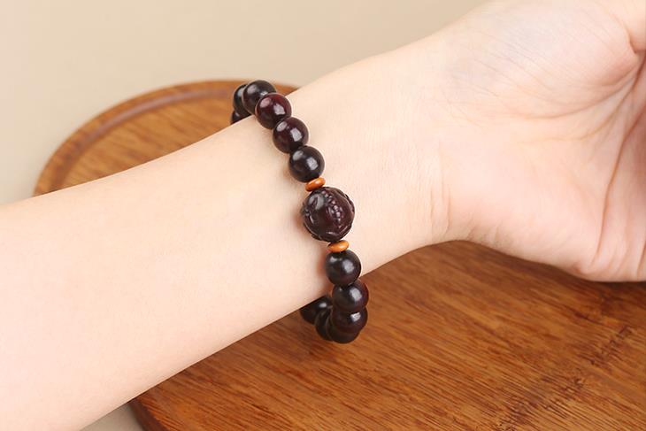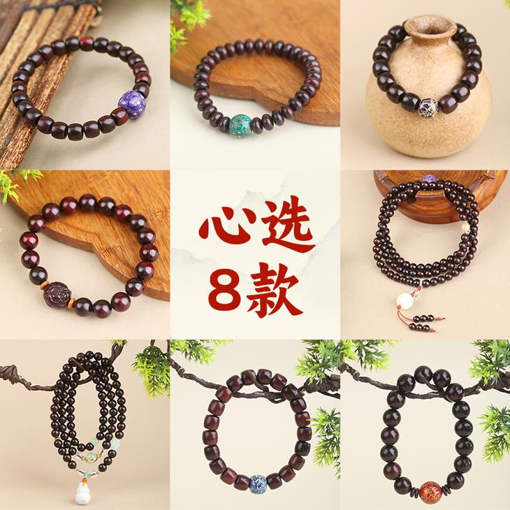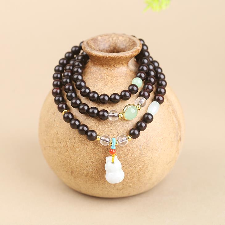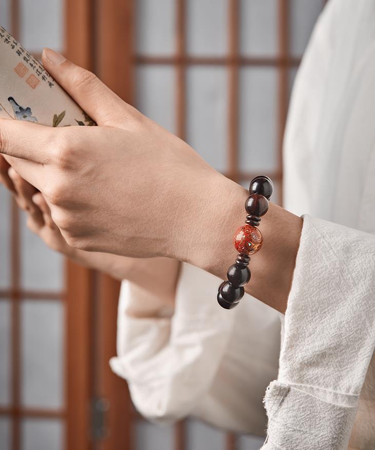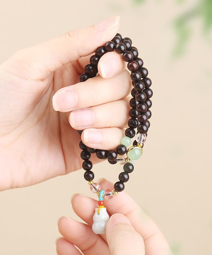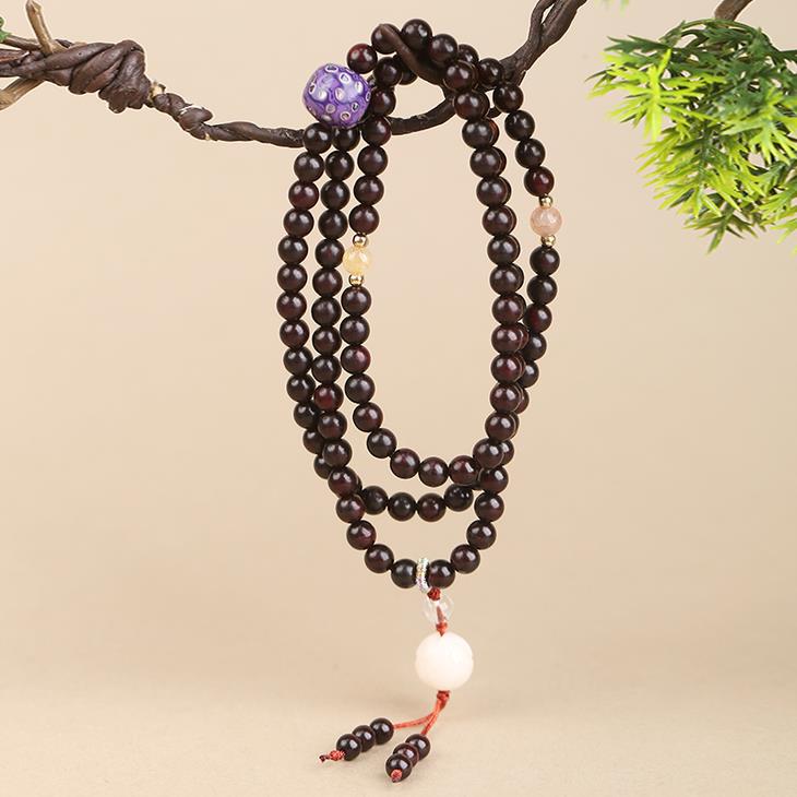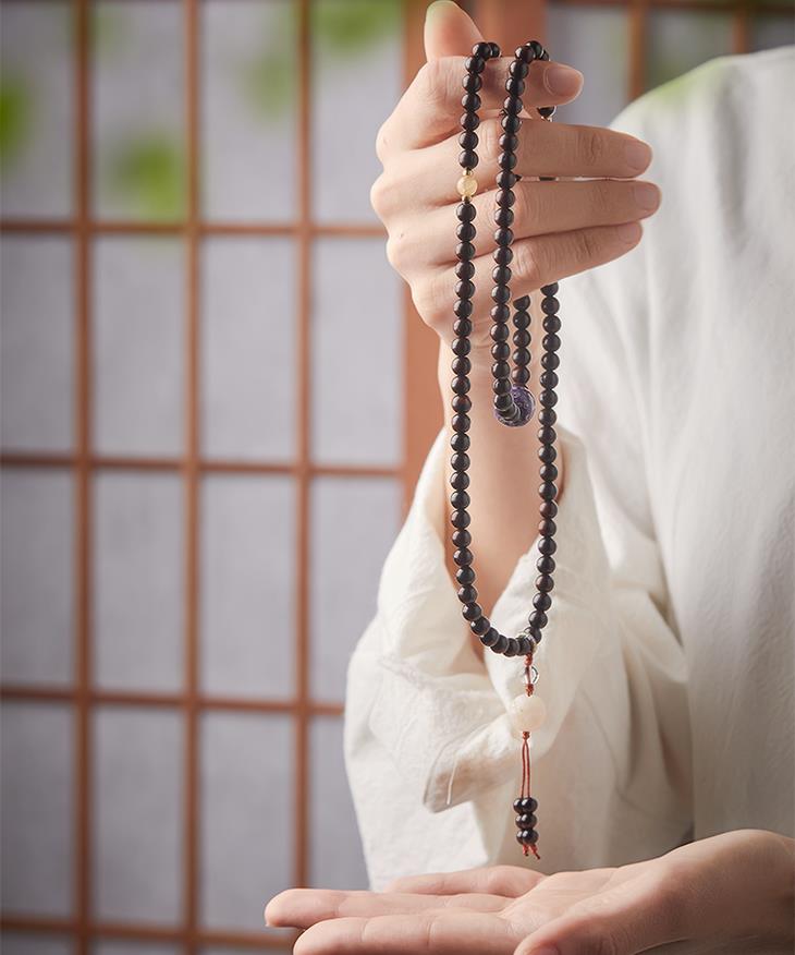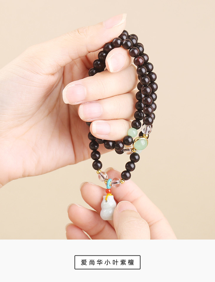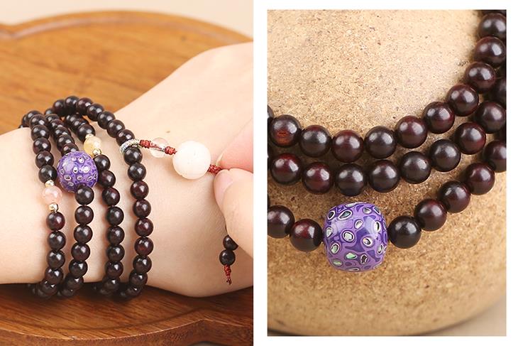 菩提、大漆穿插在108颗紫檀珠子中,更有精致感,添女子典雅气质,像古画里的美人,心生清净更有气质。