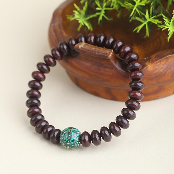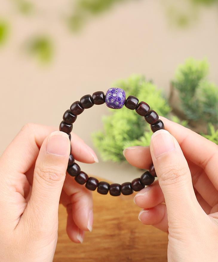 椭圆形的小叶紫檀,点缀一枚绿色大漆珠子。既有肃穆典雅的紫气,和夏日清凉感,搭配素色上衣,气质一绝。