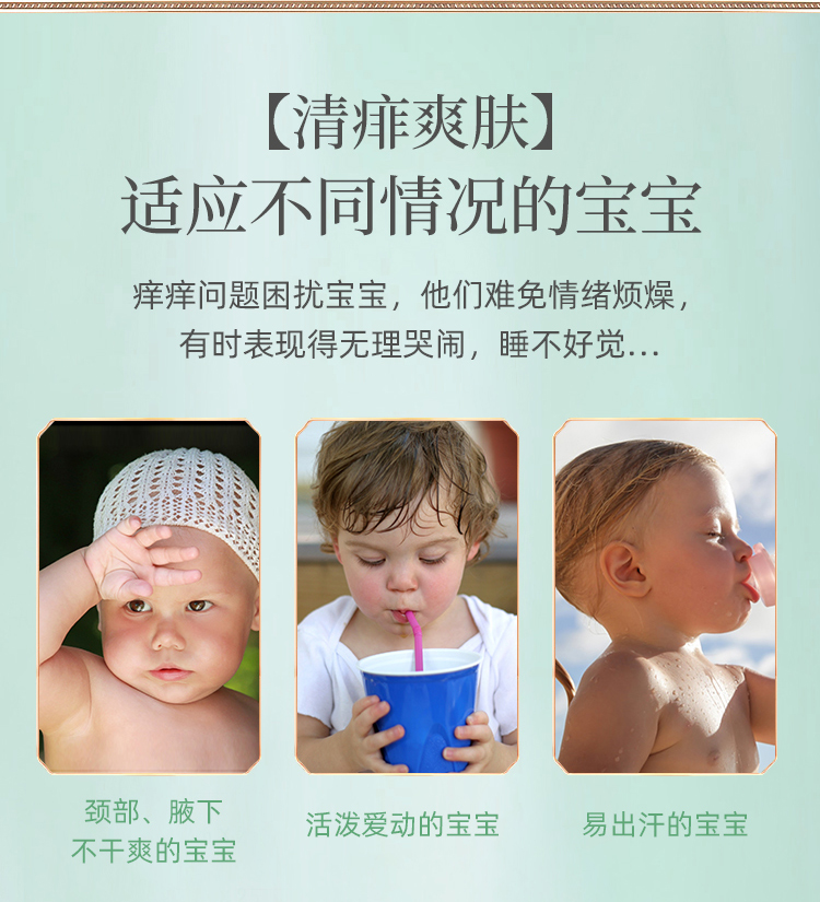 主要用于:宝宝热痱、红痱、浓痱、白痱子等症状