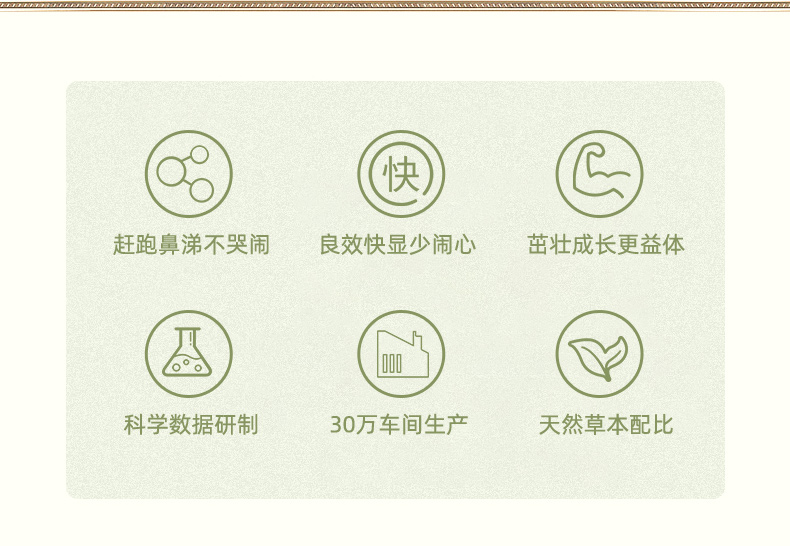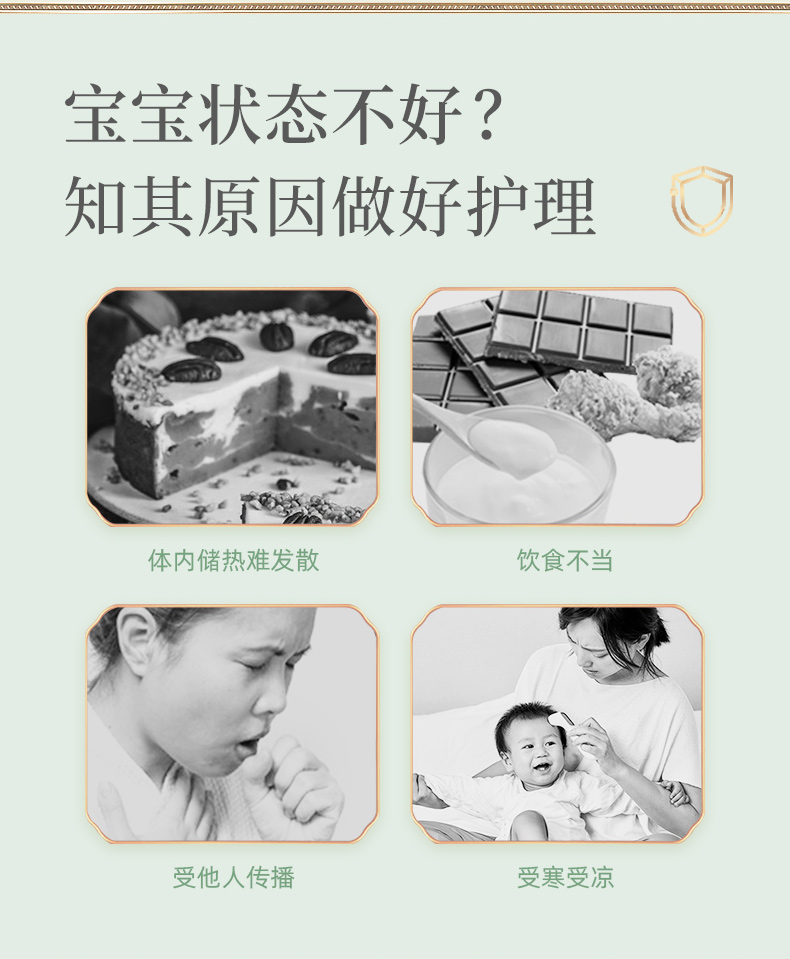 主要用于:宝宝受热引起的感冒,流黄鼻涕、鼻塞、喉咙痛、打喷嚏等情况