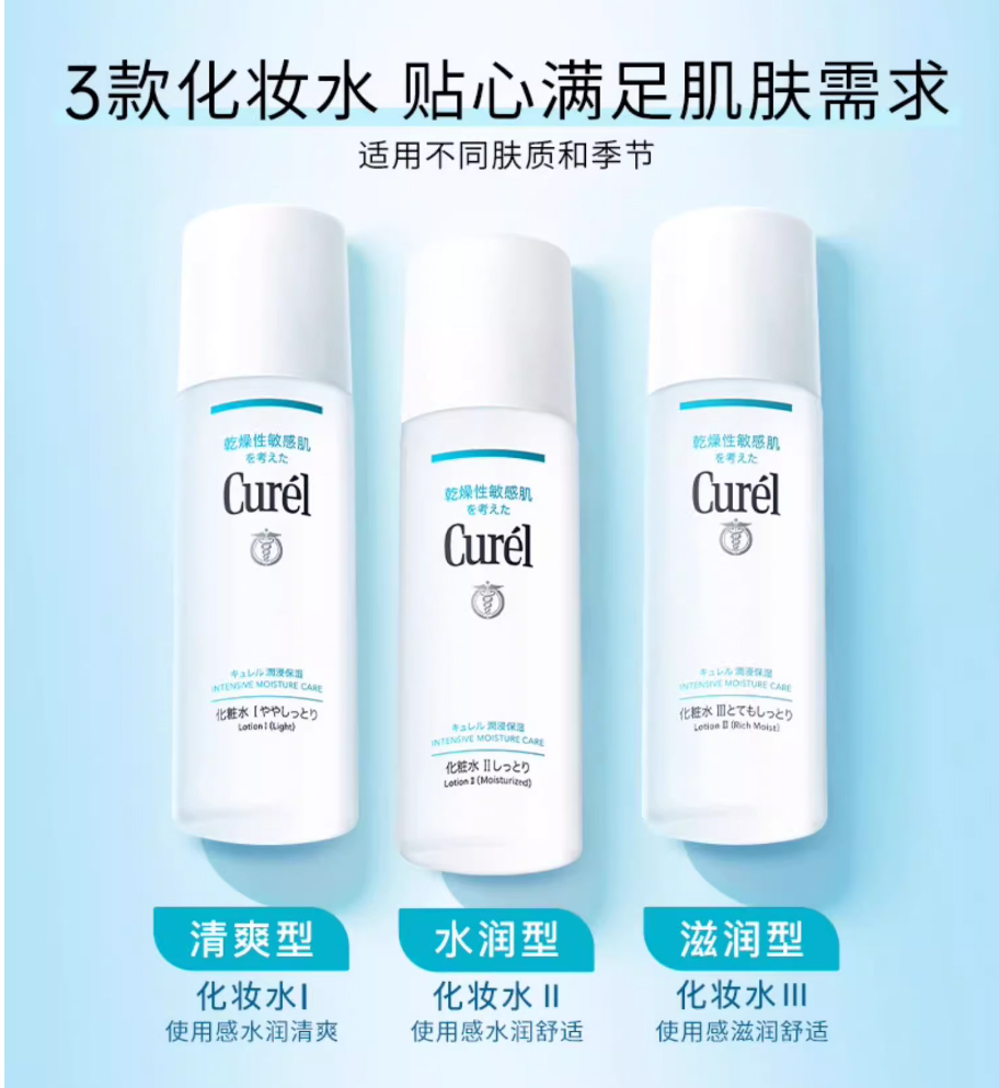 珂润浸保湿系列有三款水,从I到III兹润度以此增加