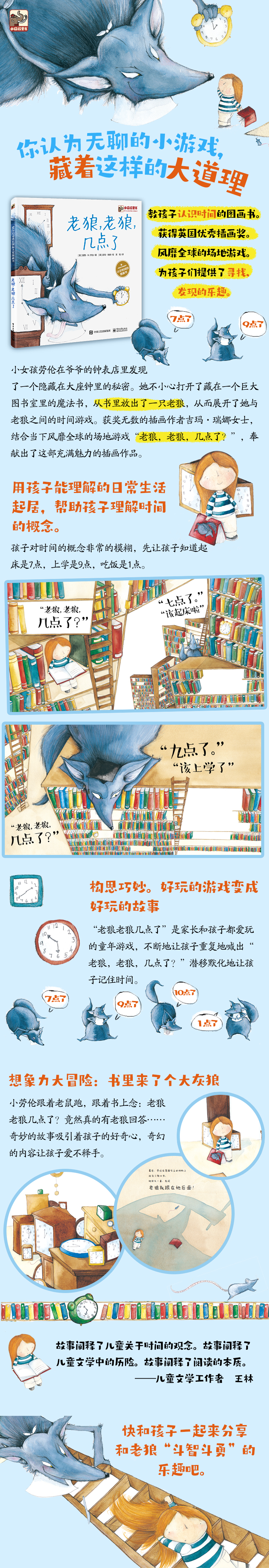 小女孩劳伦在祖父的钟表店里发现了一个隐藏在大座钟里的秘密。她不小心打开了藏在一个巨大图书室里的魔法书,放出了一只老狼,从而展开了她与老狼之间的时间游戏……获奖无数的插画作者吉玛·瑞娜女士,结合当下风靡全球的场地游戏“老狼,老狼,几点了?”,奉献出了这部充满魅力的插画作品。