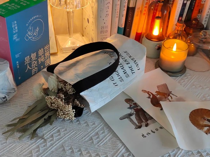 这个手提袋不仅可以放我喜欢的书,还能用来装便当盒。