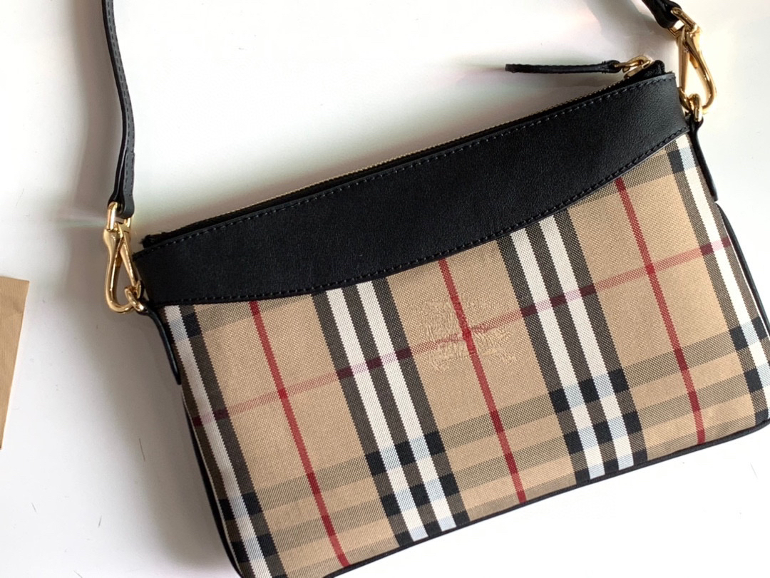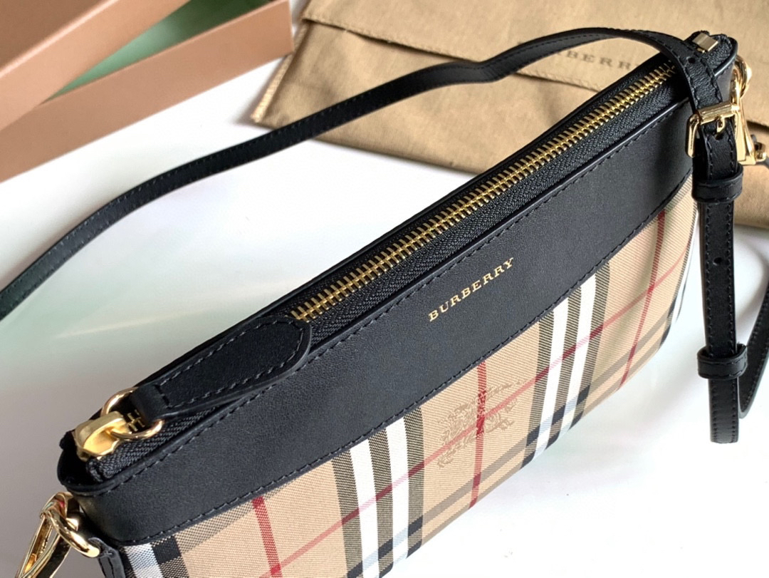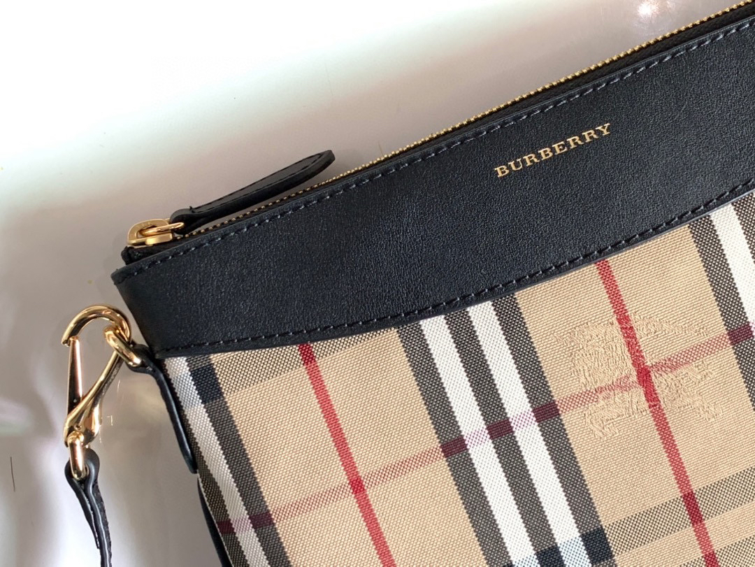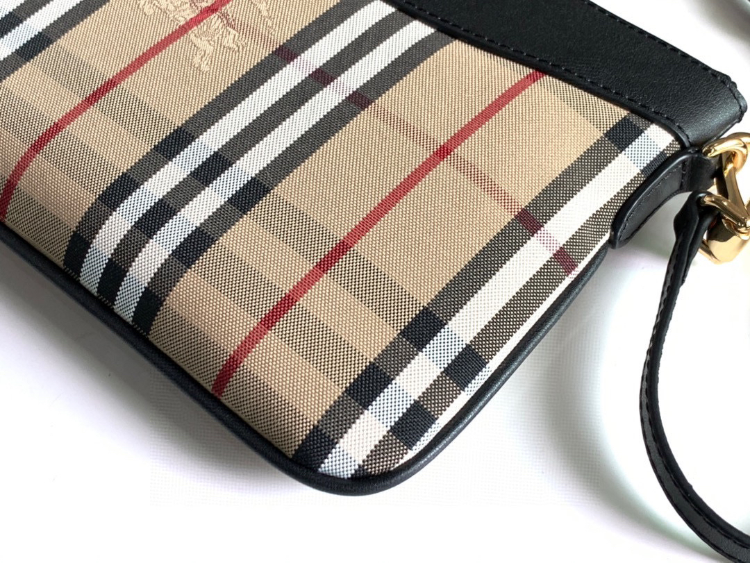 Horseferry格纹拼皮革手拿包➰【B•家】原单出品🇮🇹~~臻选英伦精纺Horseferry格纹棉质裁片制成,随附可拆式皮革肩背带,可作为肩背包使用, 🎉 可轻松收纳手机📱、唇膏💄及卡片等 👉👍专柜品质、做工精细💋实物拍摄📷,黑色,尺寸26cm*16.5cm*