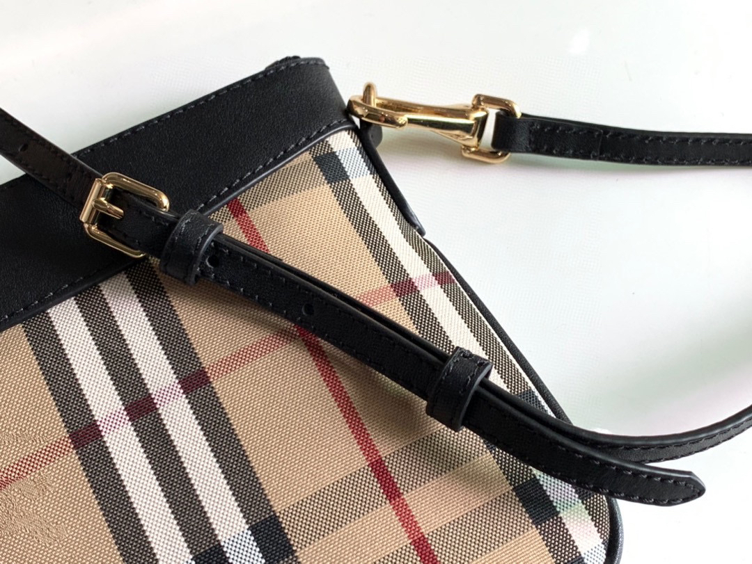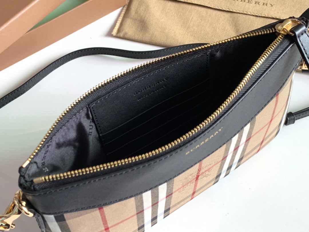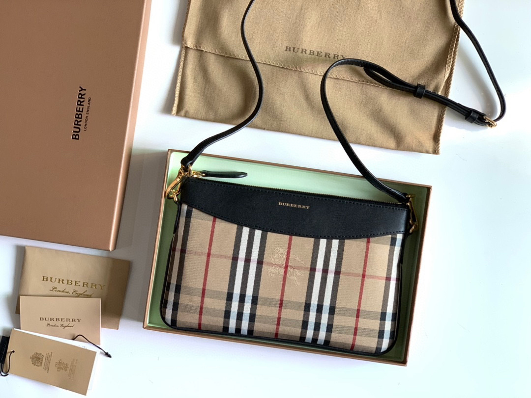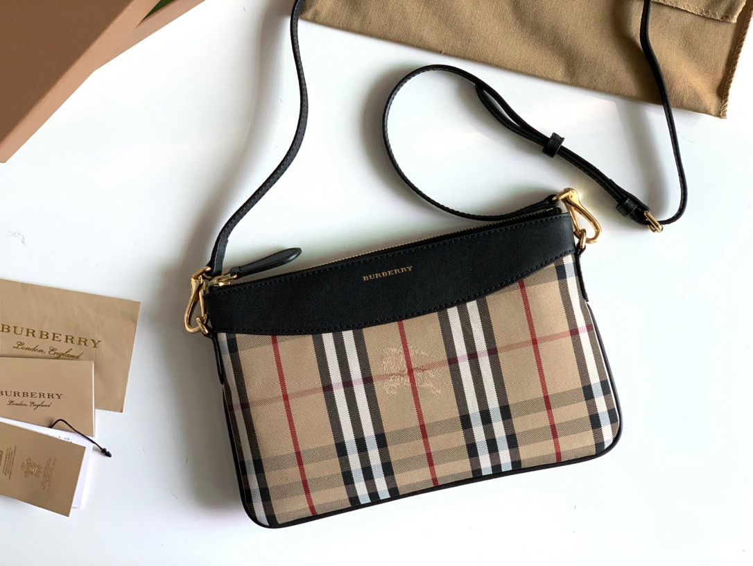 Horseferry格纹拼皮革手拿包➰【B•家】原单出品🇮🇹~~臻选英伦精纺Horseferry格纹棉质裁片制成,随附可拆式皮革肩背带,可作为肩背包使用, 🎉 可轻松收纳手机📱、唇膏💄及卡片等 👉👍专柜品质、做工精细💋实物拍摄📷,黑色,尺寸26cm*16.5cm*