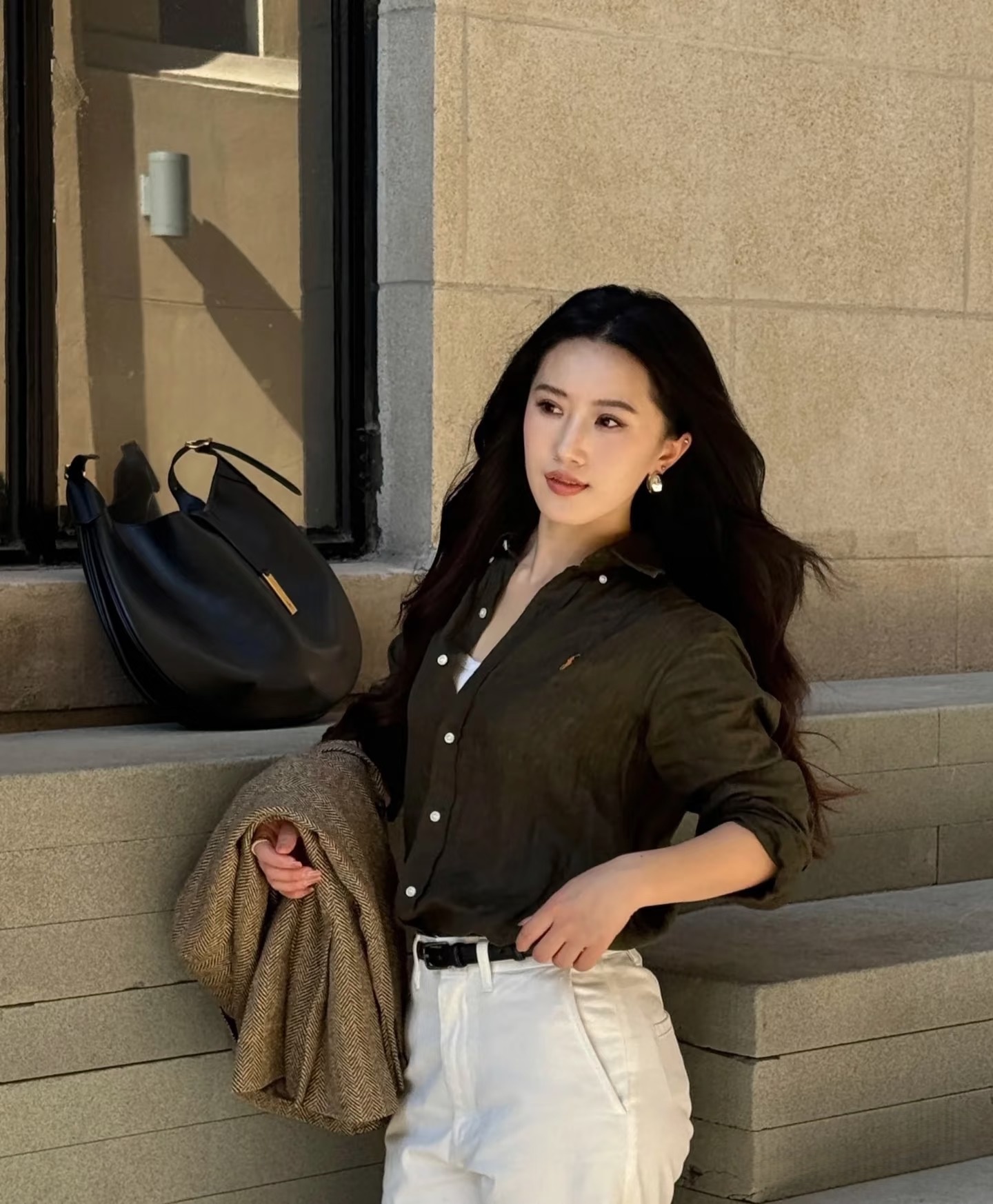 上下解开1-2粒扣营造腰线和呼吸感,下装随便捞一条裤子、裙子都可以,手拿咖啡,气质加大分!