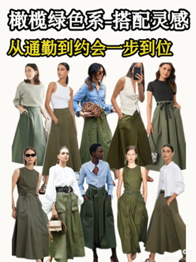 橄榄绿,属于冷调色系的绿色,带有沉稳内敛的气质,尤其适合黄皮显白。