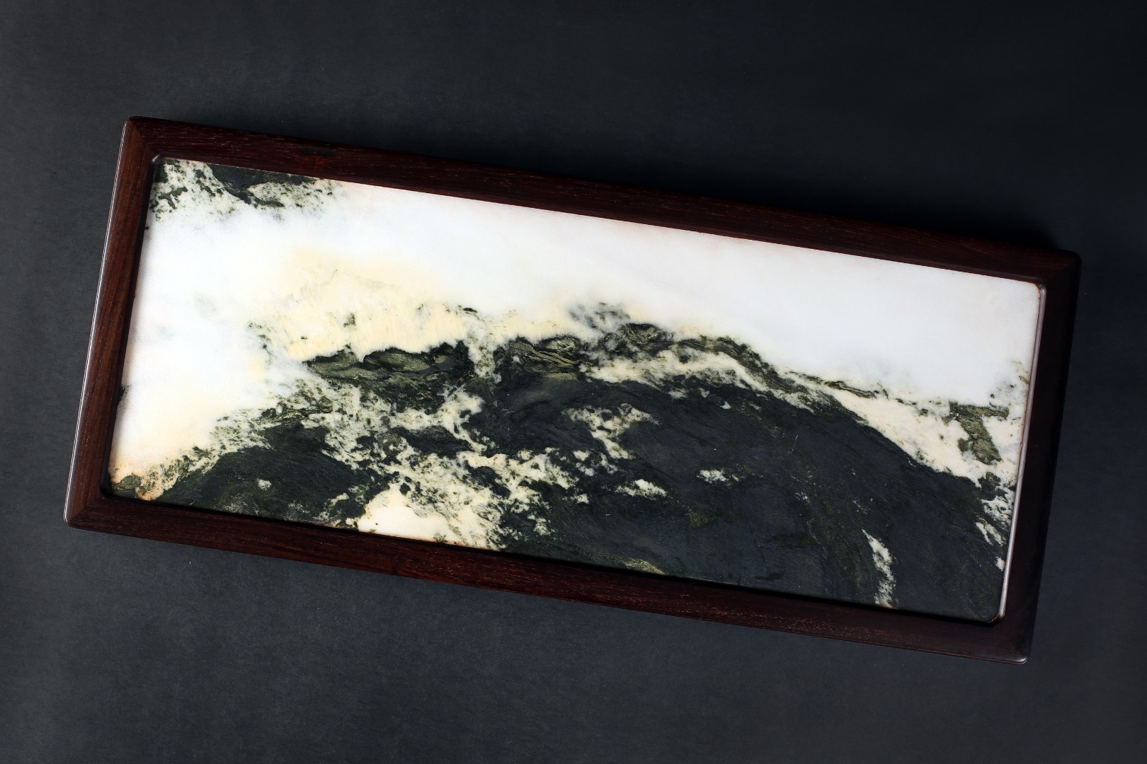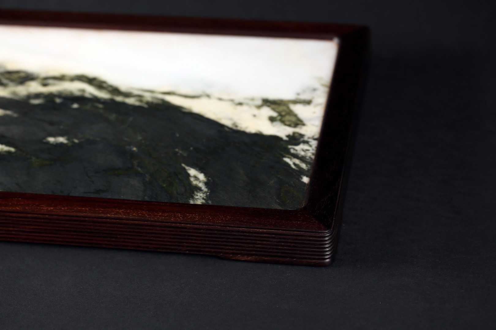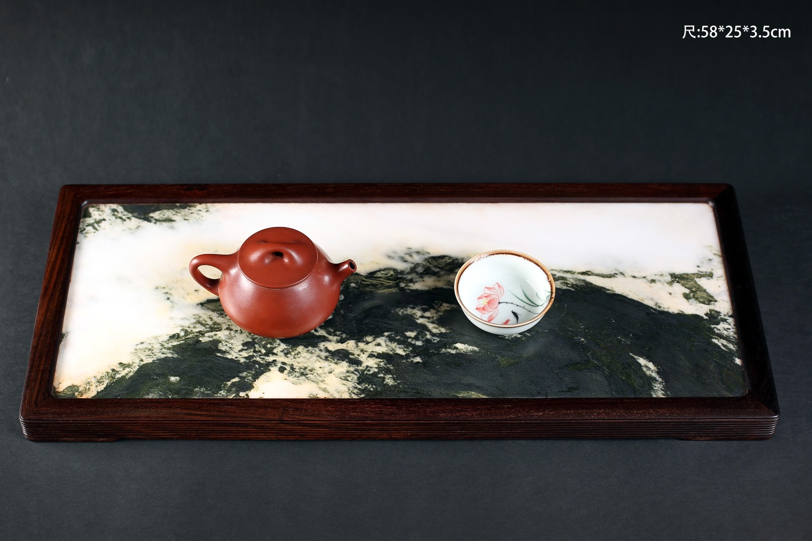 此盘以大红酸枝嵌云石制作,盘框格角,榫卯牢固,内嵌简约又充满意境的天然云石,似天之云,似海之浪,乾坤之景,跃然于前,器与茶配,皆出自然,又复归自然,美器、美茶、美境、美心,天人合一,诉说茶道乾坤。