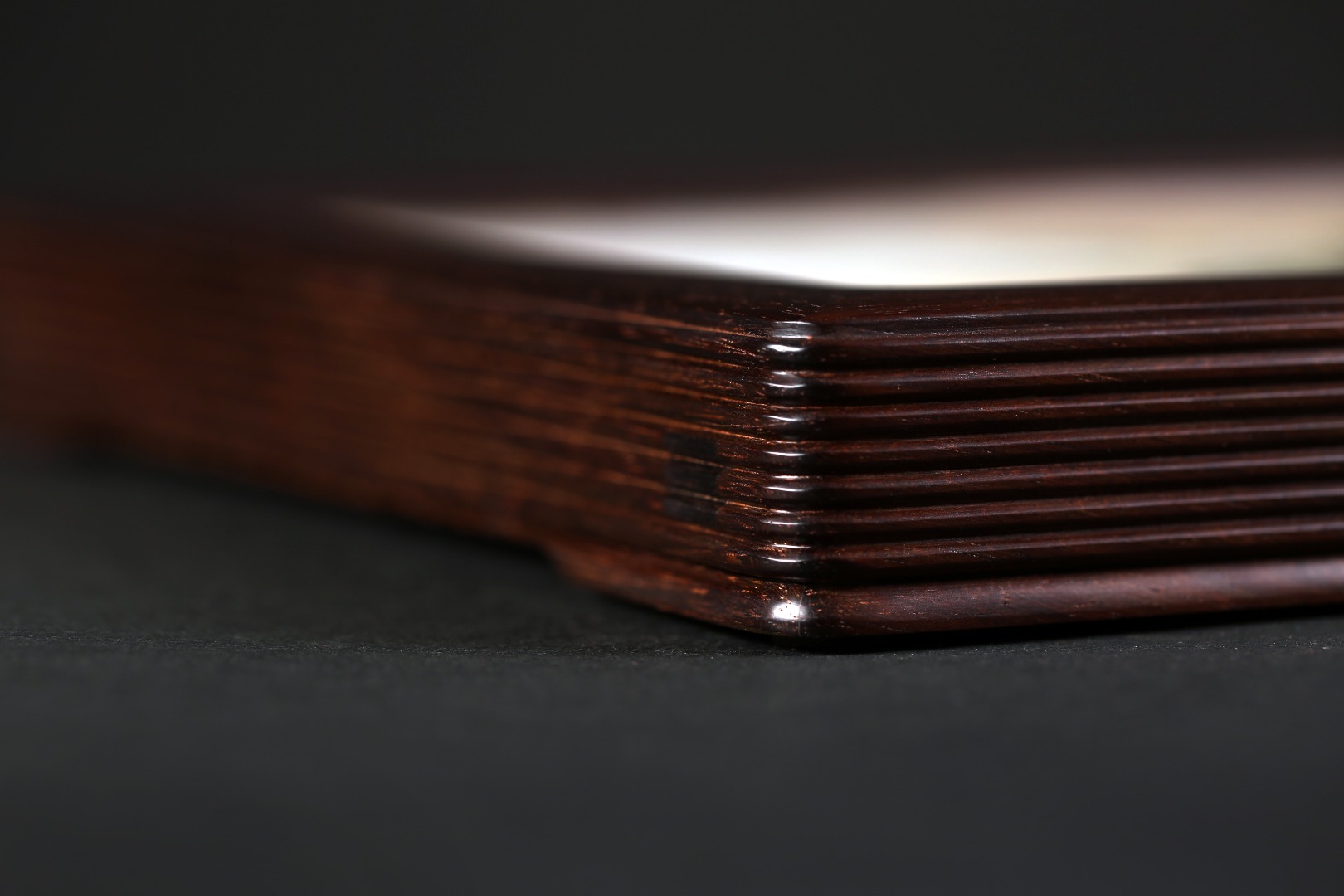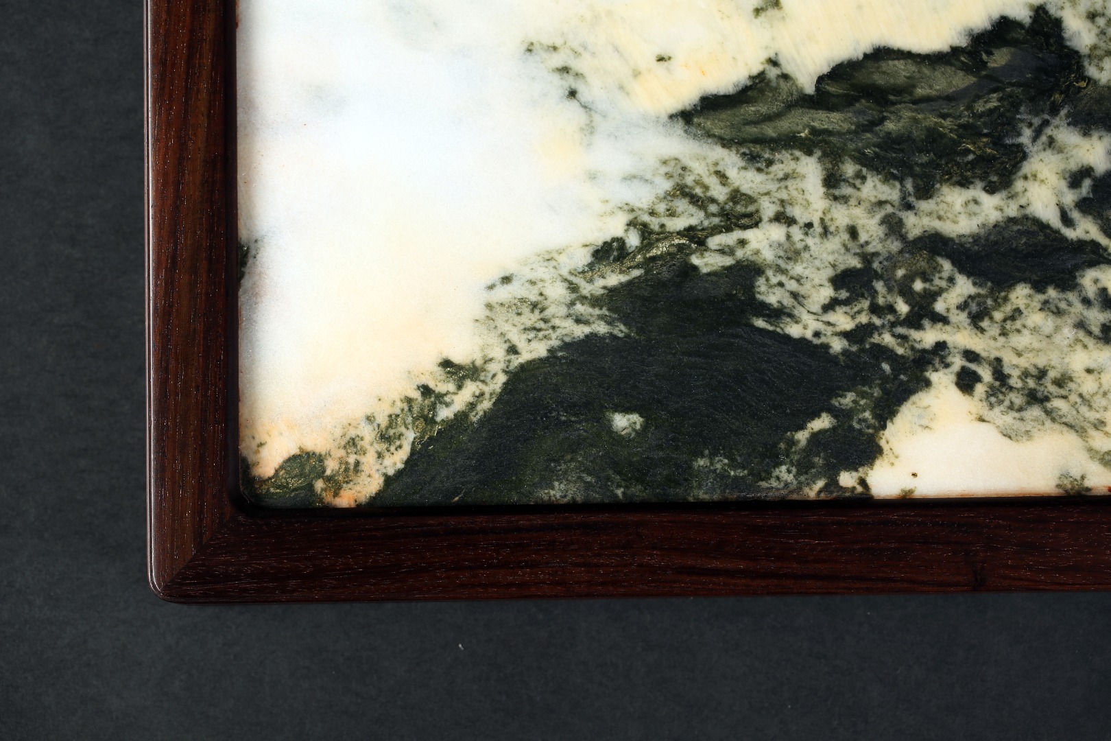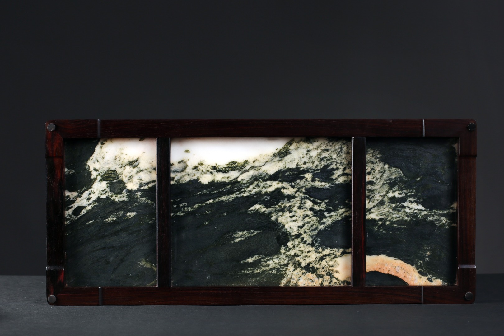 此盘以大红酸枝嵌云石制作,盘框格角,榫卯牢固,内嵌简约又充满意境的天然云石,似天之云,似海之浪,乾坤之景,跃然于前,器与茶配,皆出自然,又复归自然,美器、美茶、美境、美心,天人合一,诉说茶道乾坤。